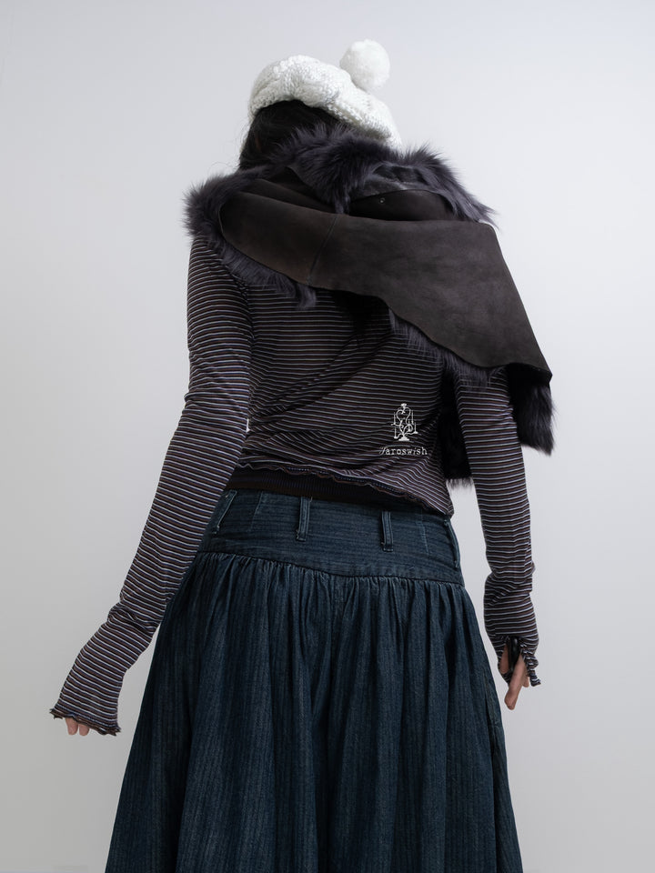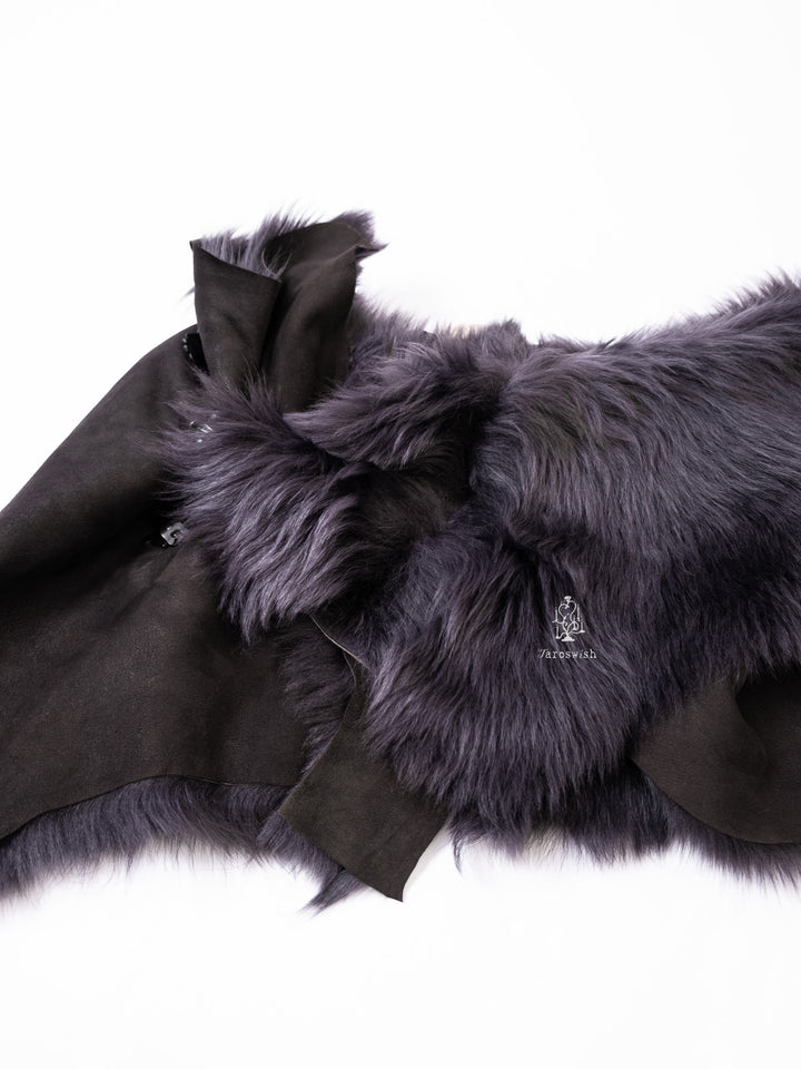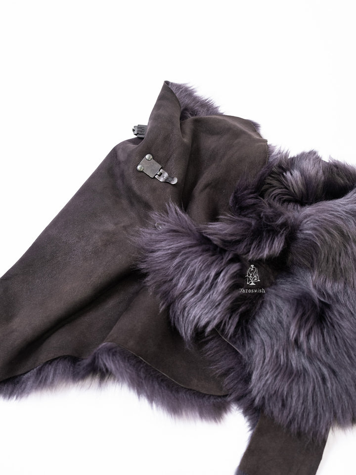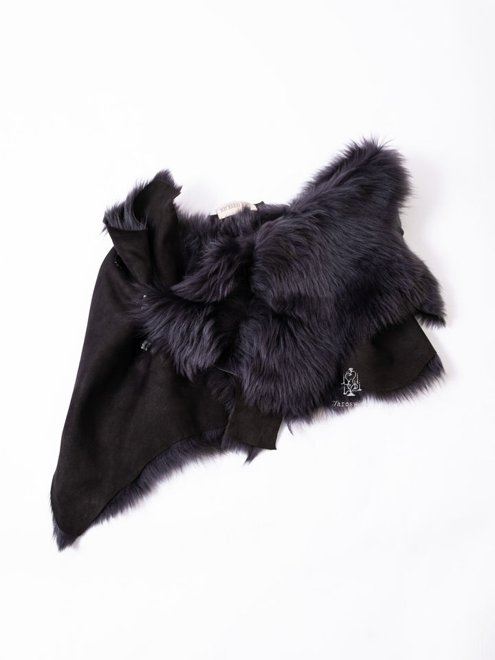 Black asymmetric faux fur shawl with suede base and buckle closure.