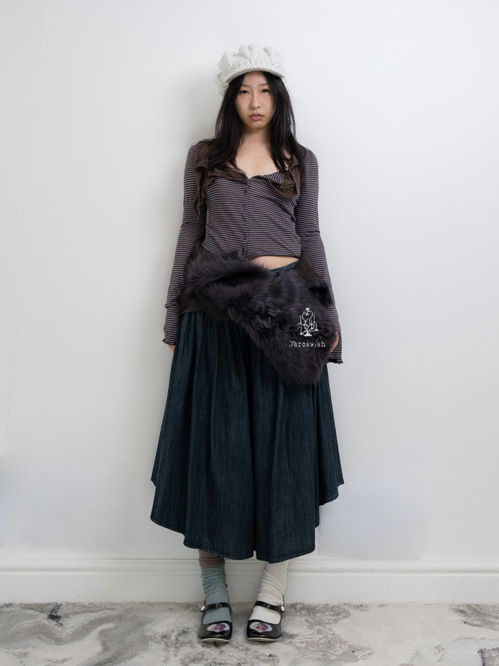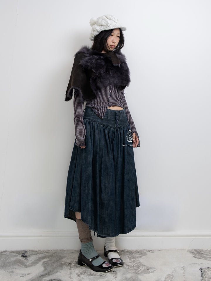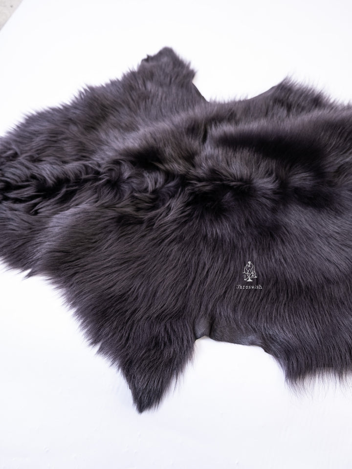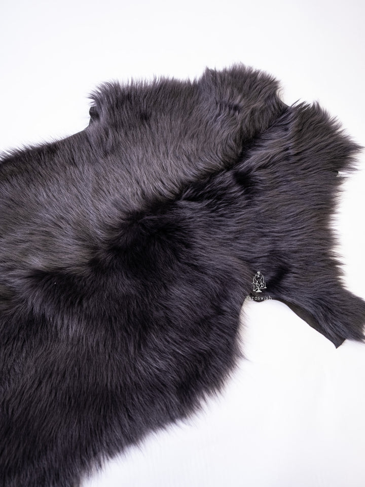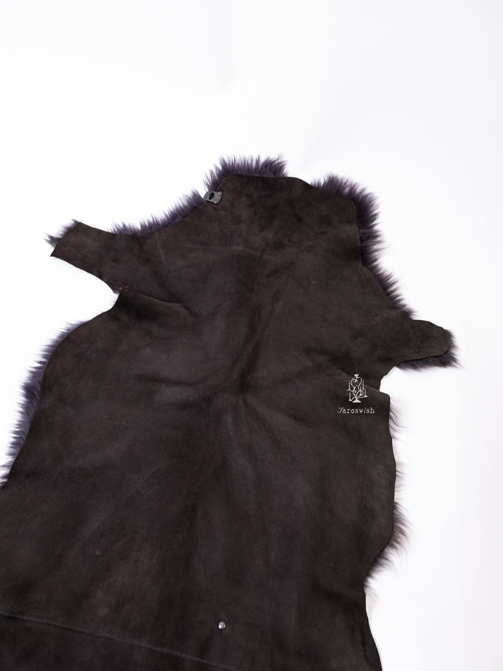 Black asymmetric faux fur shawl with suede base and buckle closure.