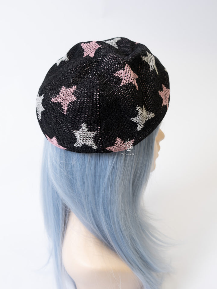 Black knit beret with pink and grey star motifs.