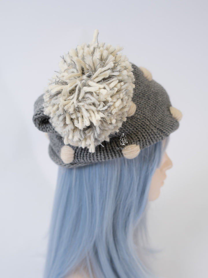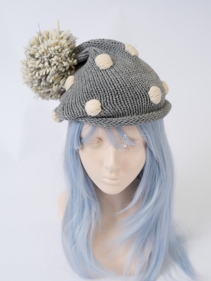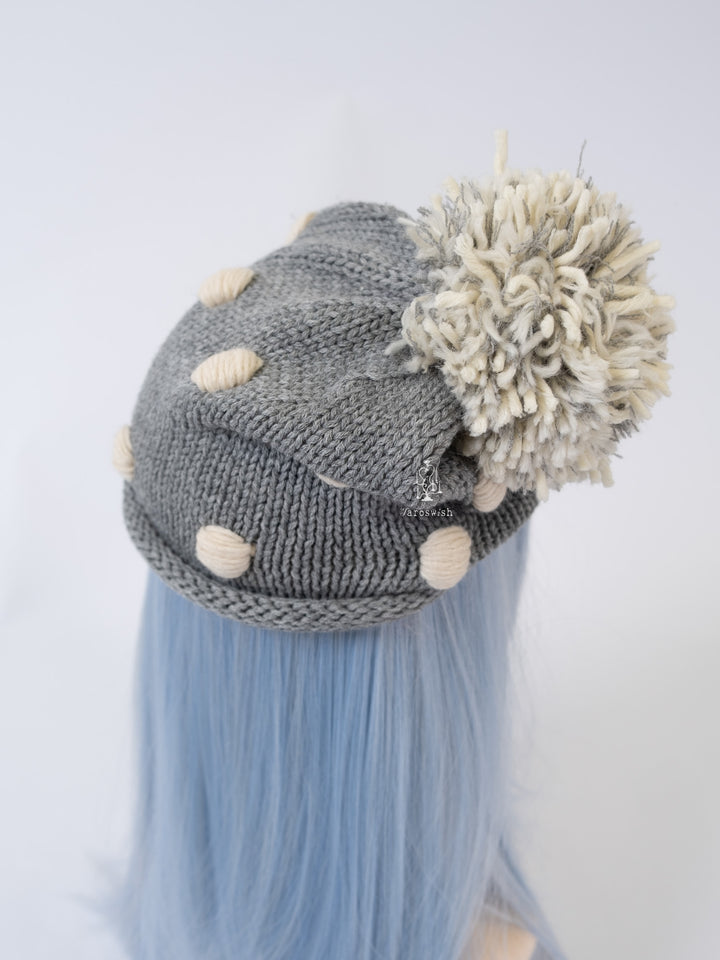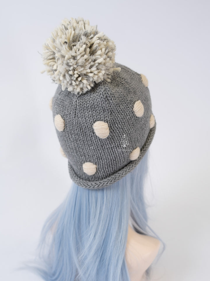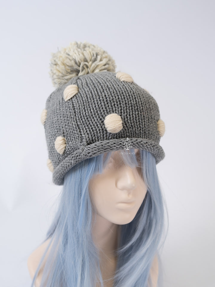 Grey chunky knit hat with cream dot details and a mixed-yarn pom-pom on top.