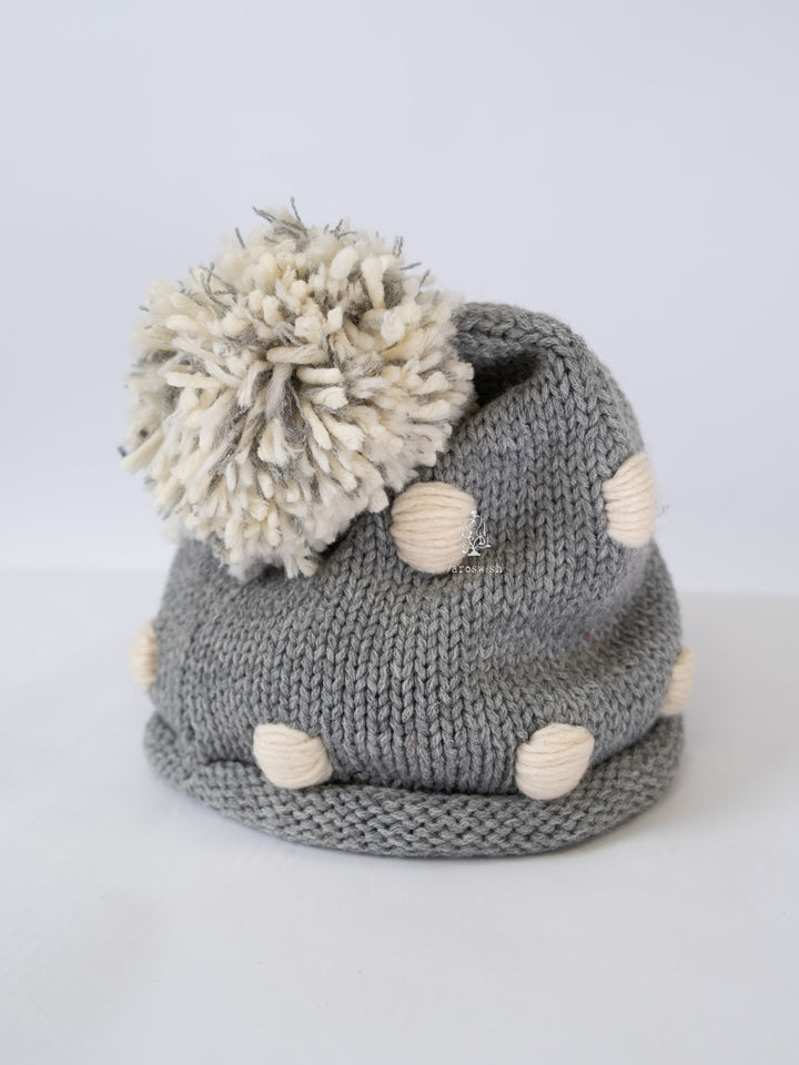 GREY KNIT POM-POM HAT WITH DOT DETAILS
