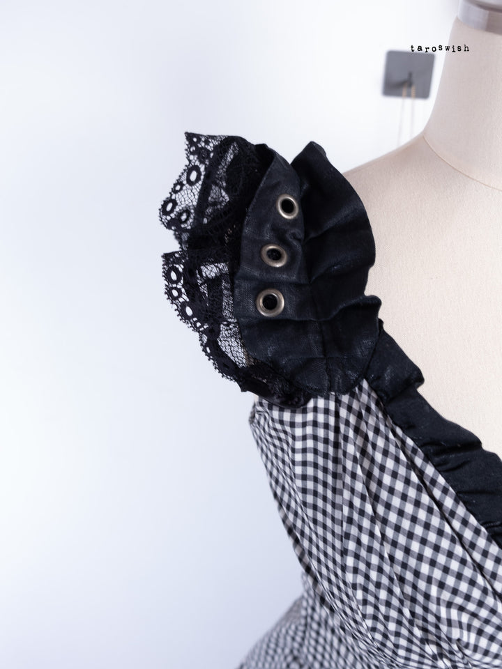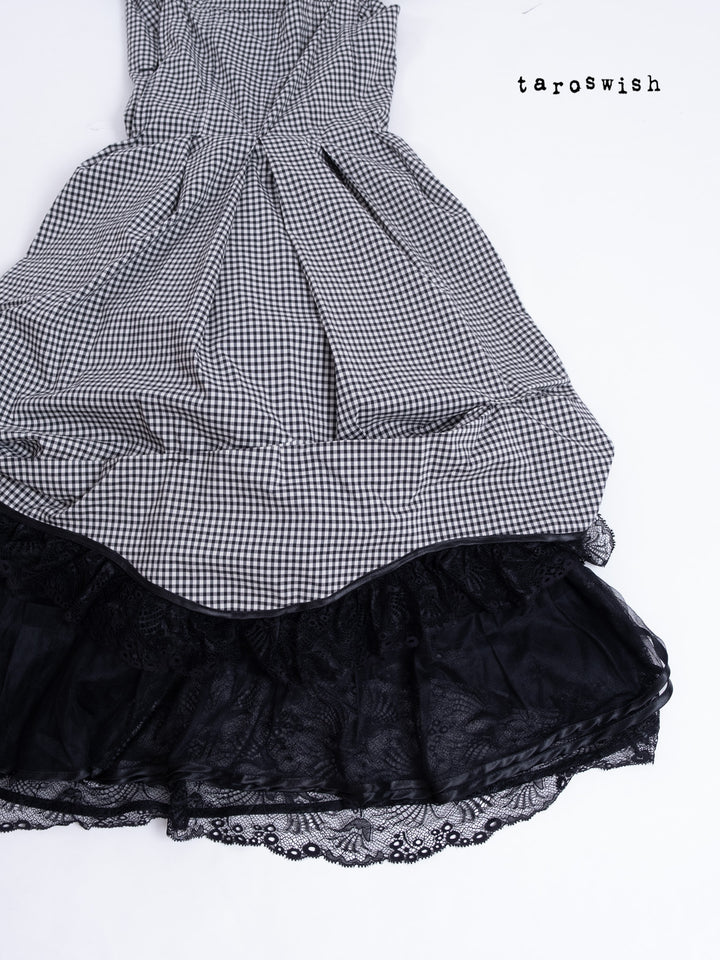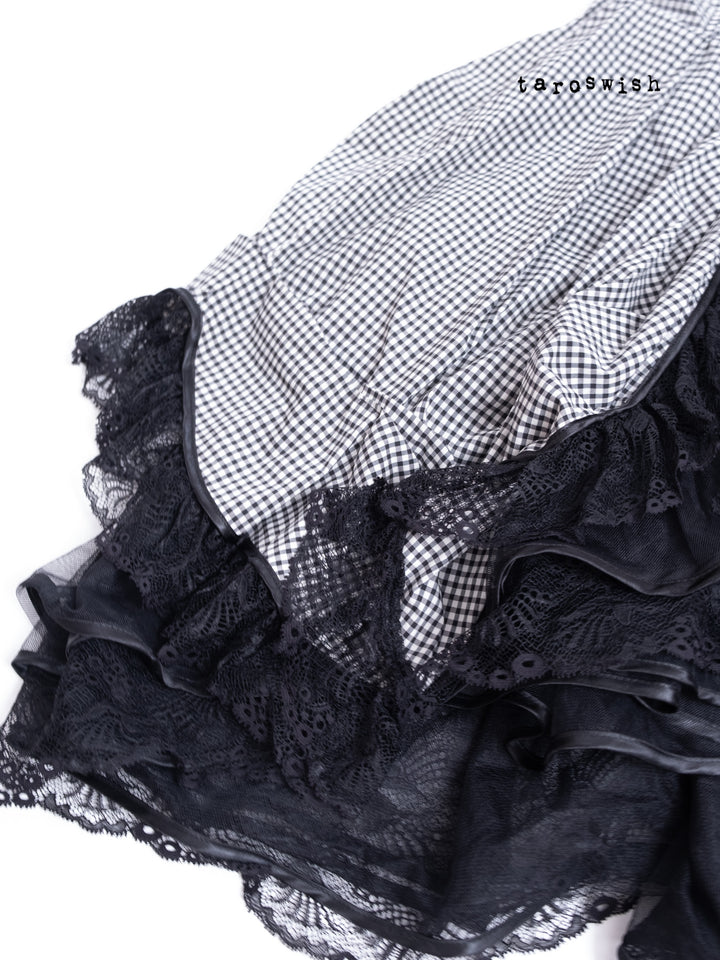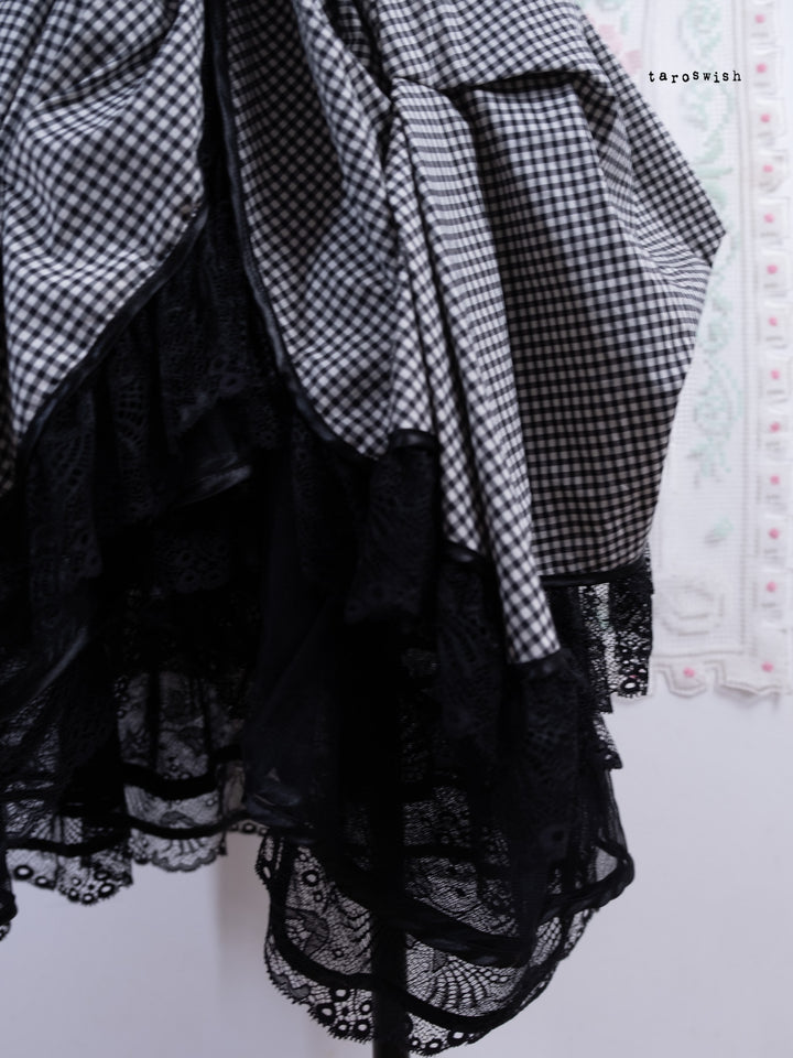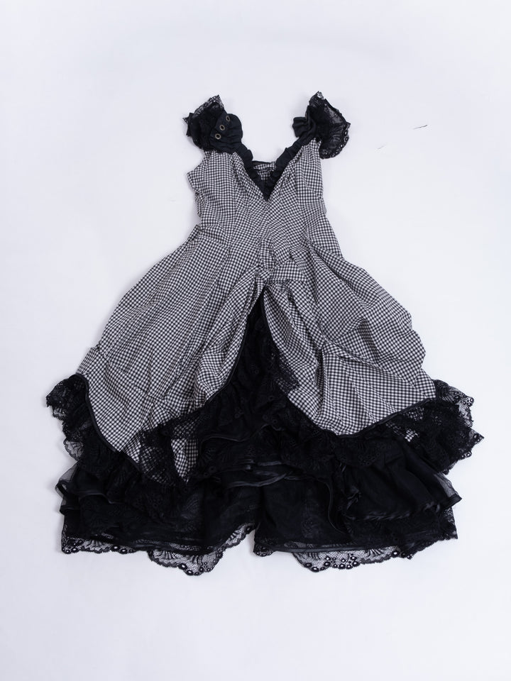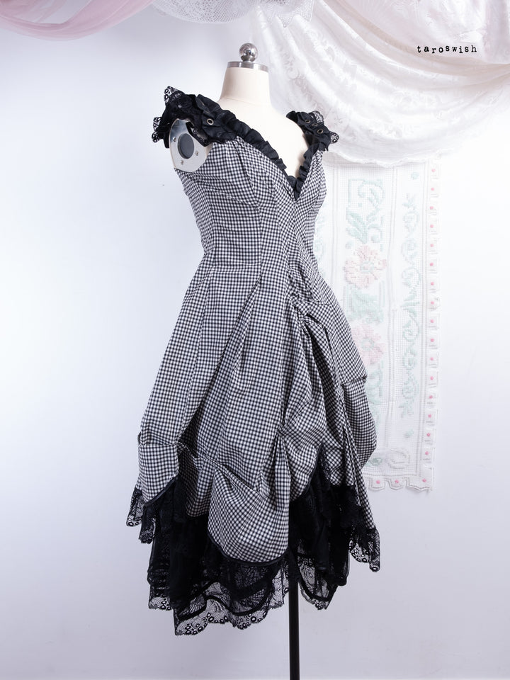 Gothic fairytale dress with black lace ruffle hem, ruched sleeves, and gingham overlay.