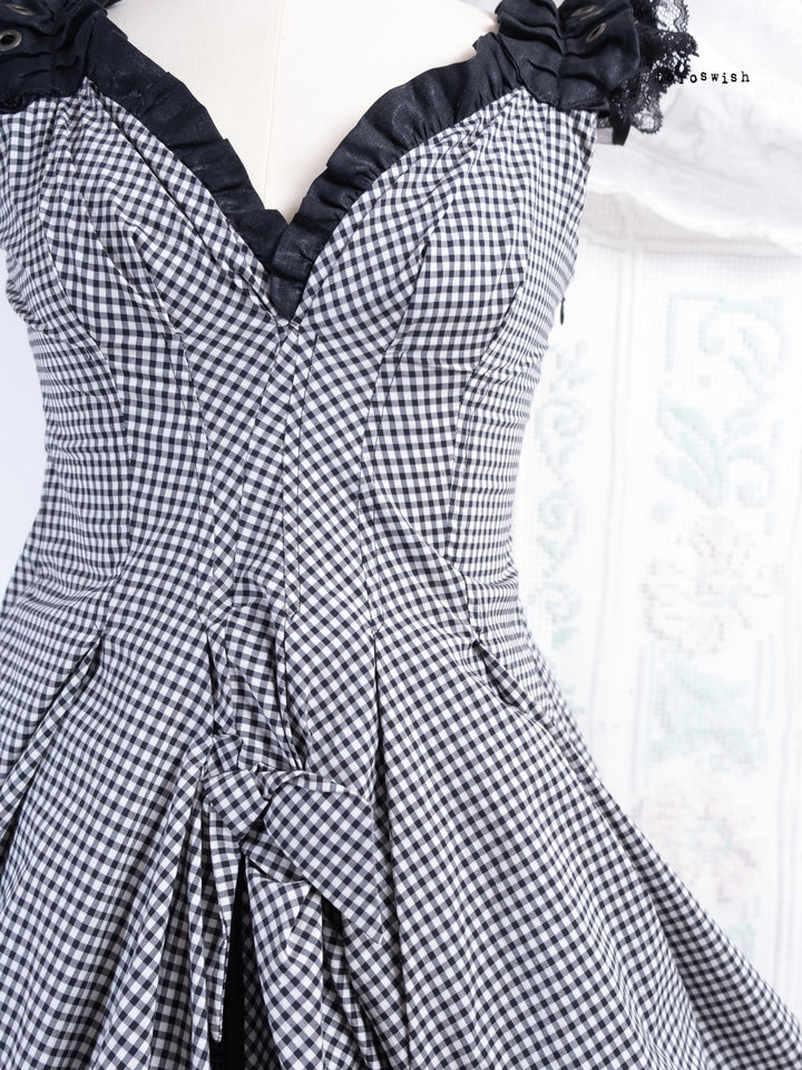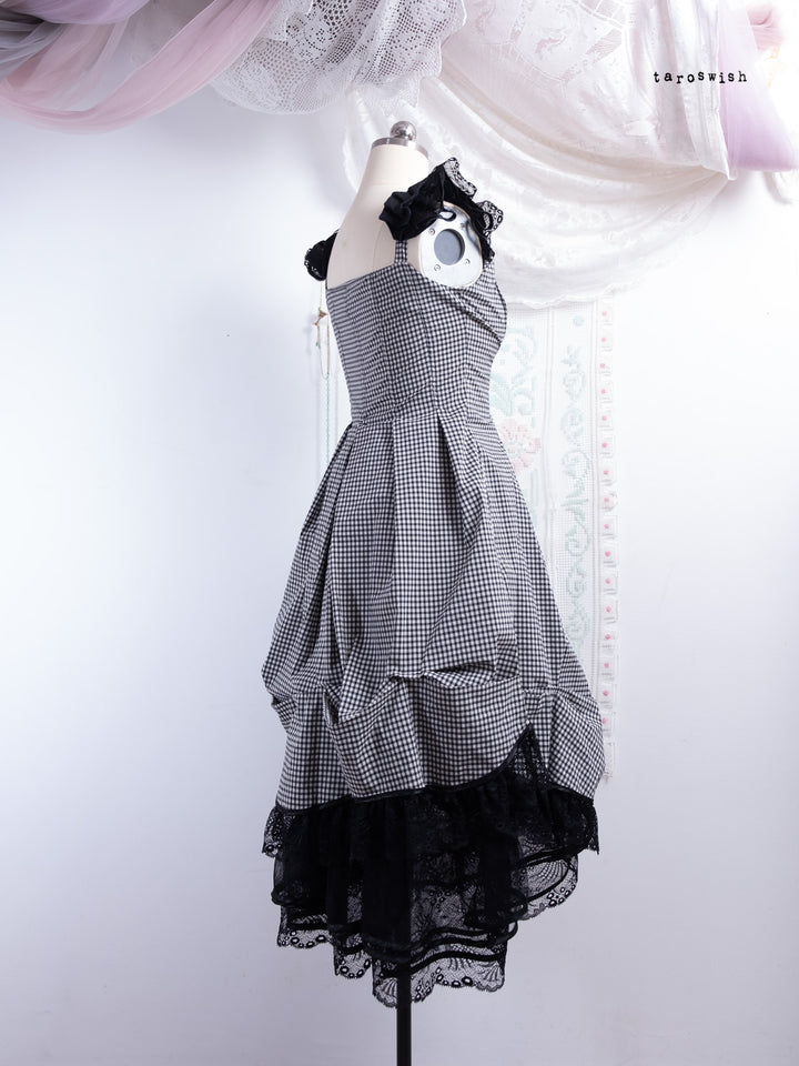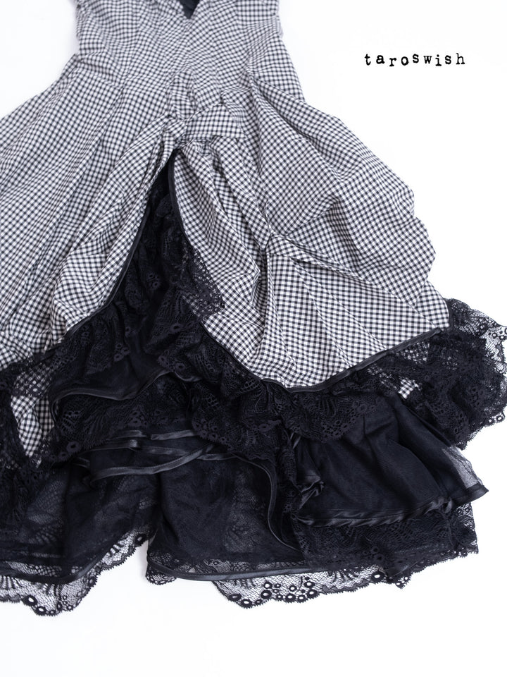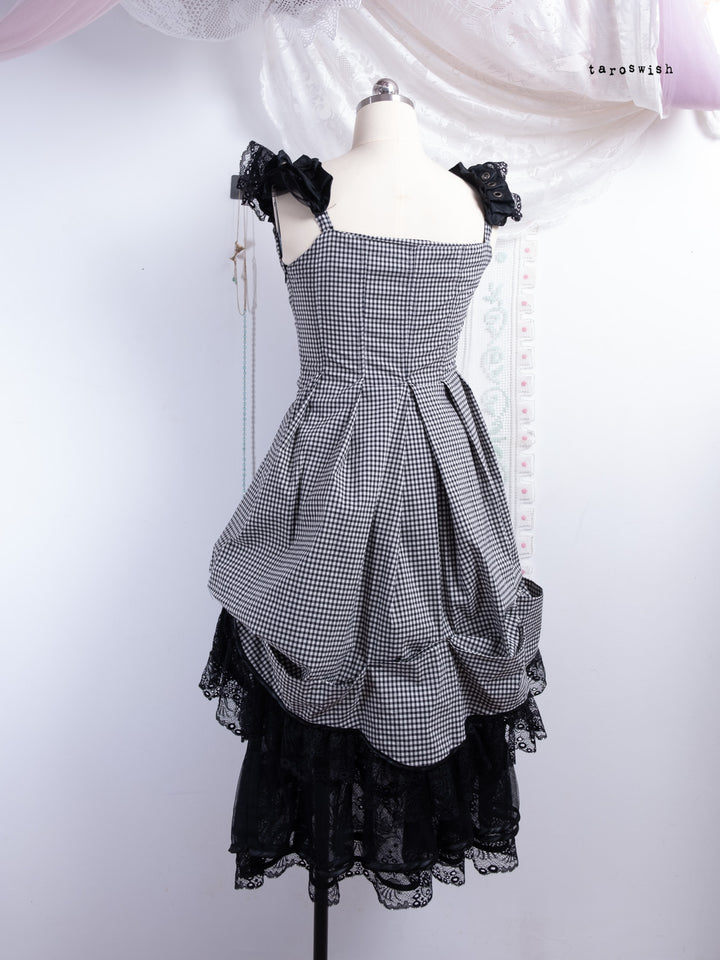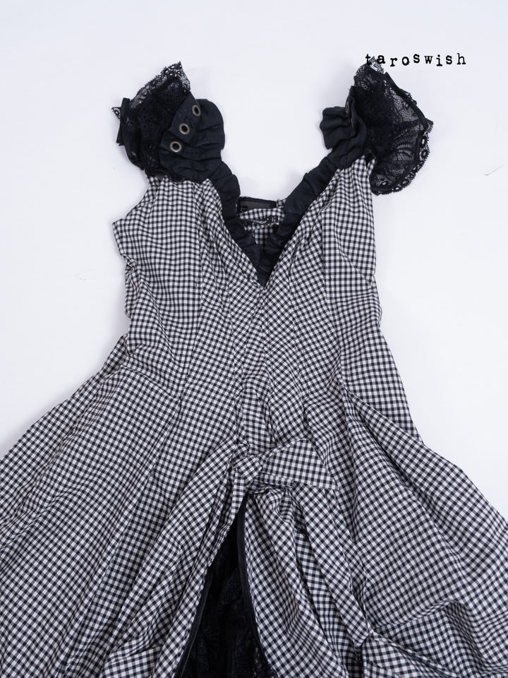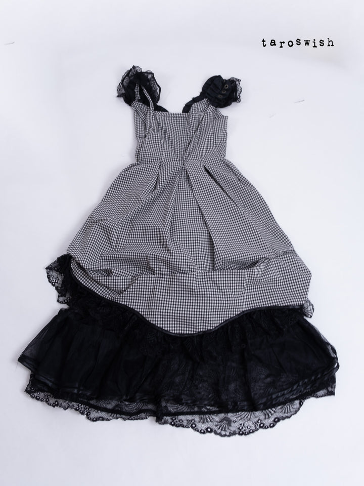 Gothic fairytale dress with black lace ruffle hem, ruched sleeves, and gingham overlay.