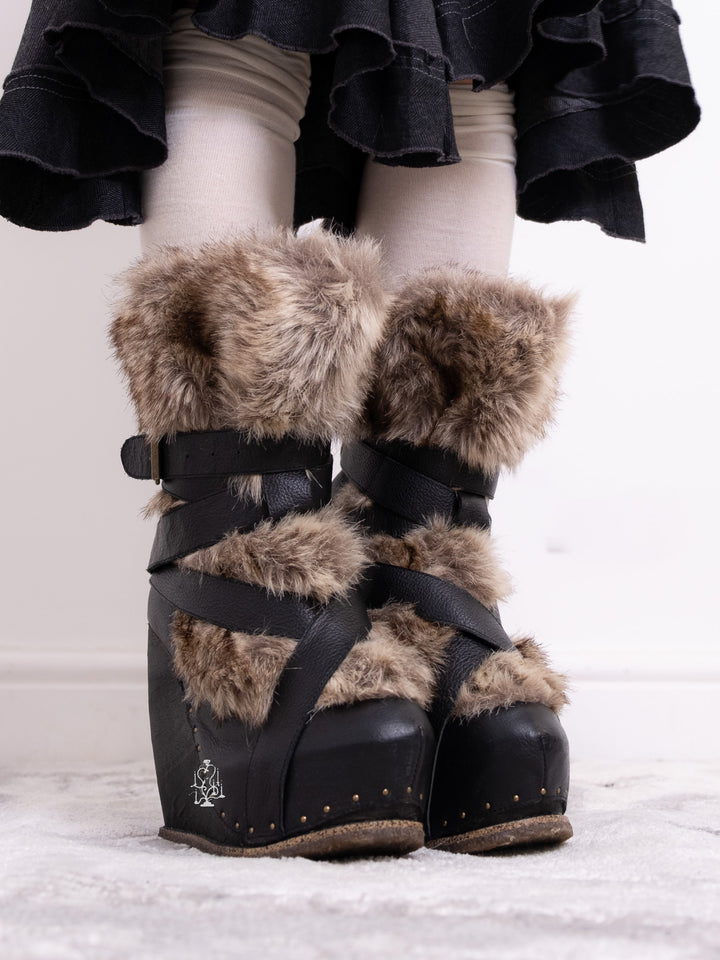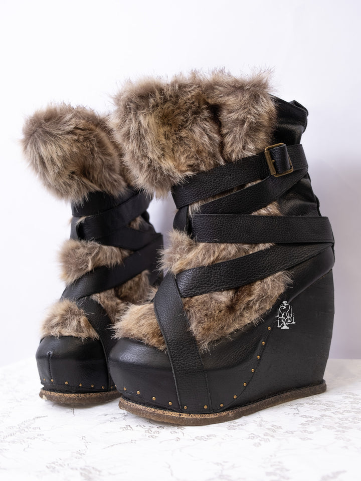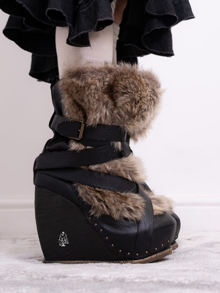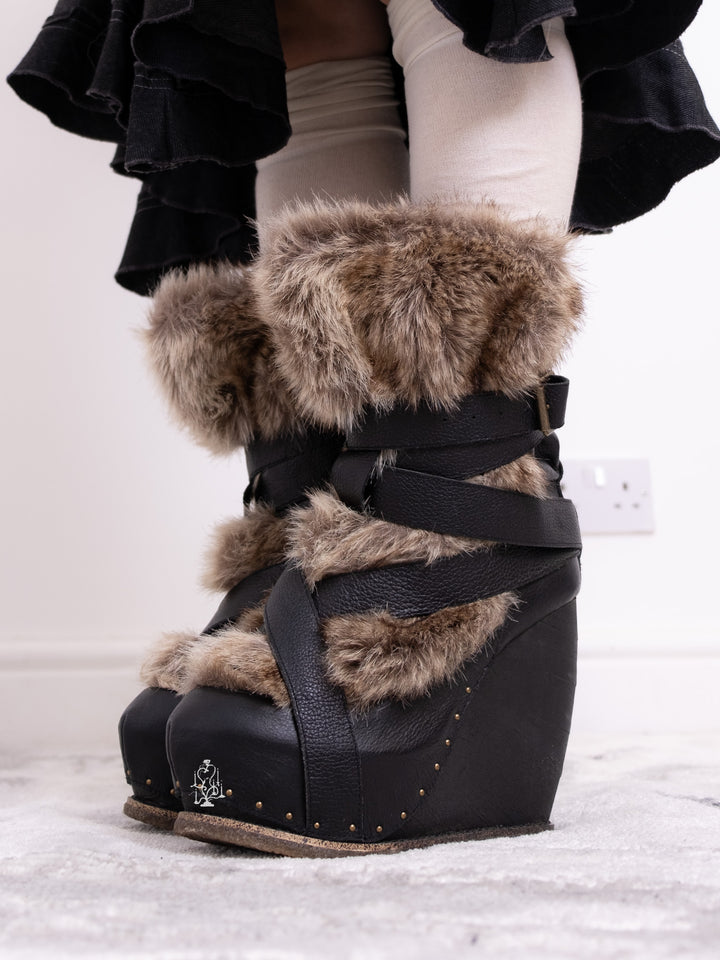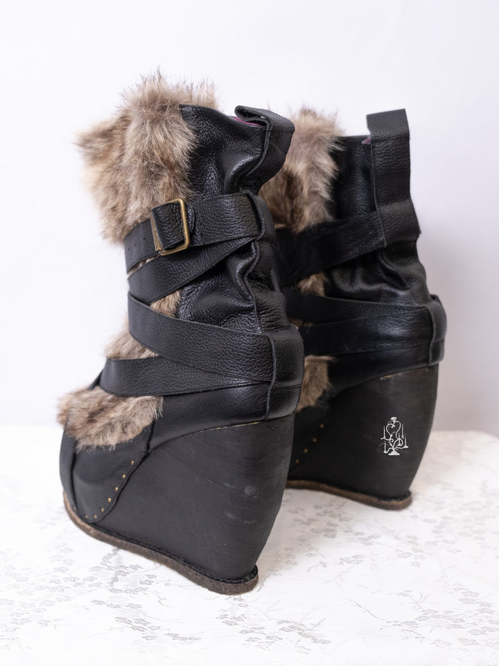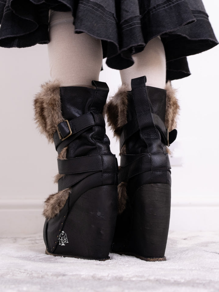EU42 BEAST BLACK FUR-LINED CROSS-STRAP WEDGE BOOTS
