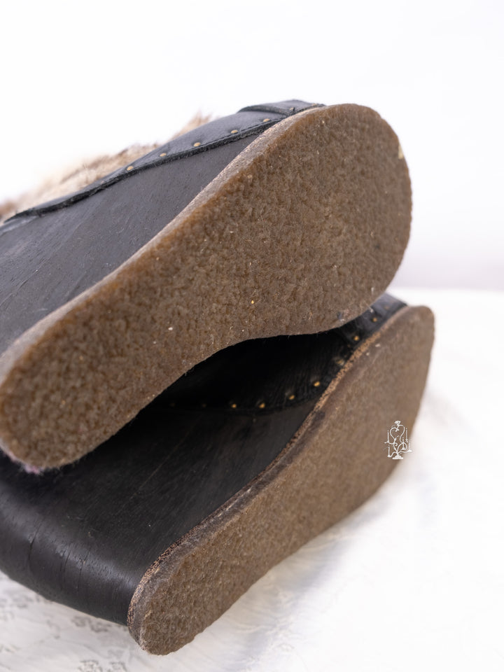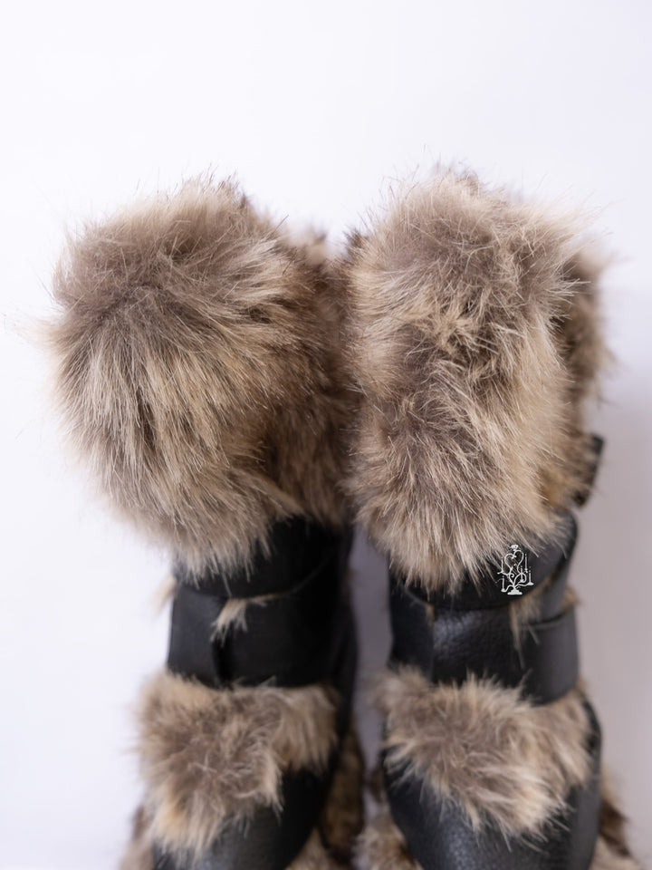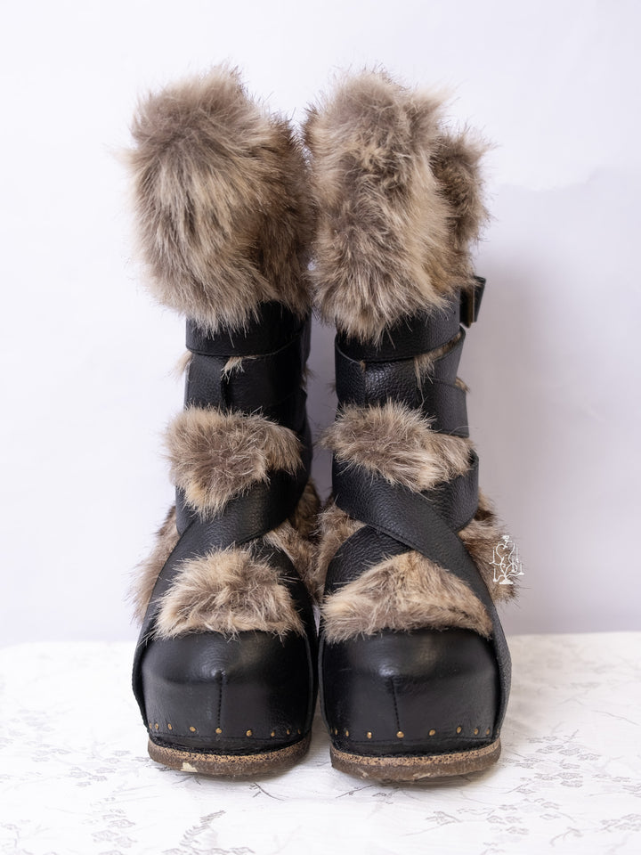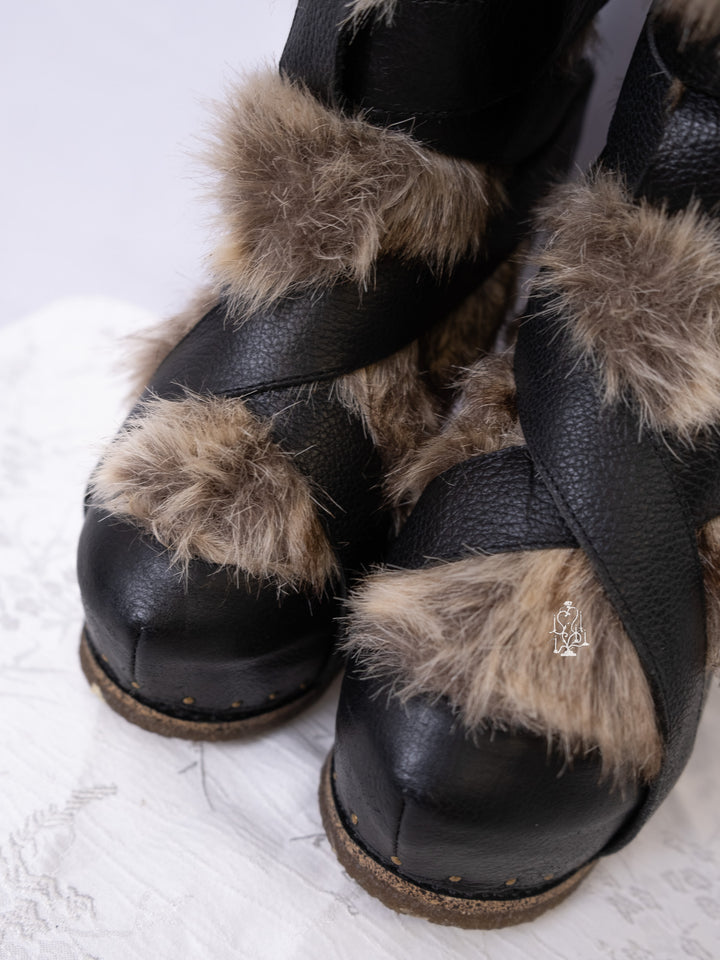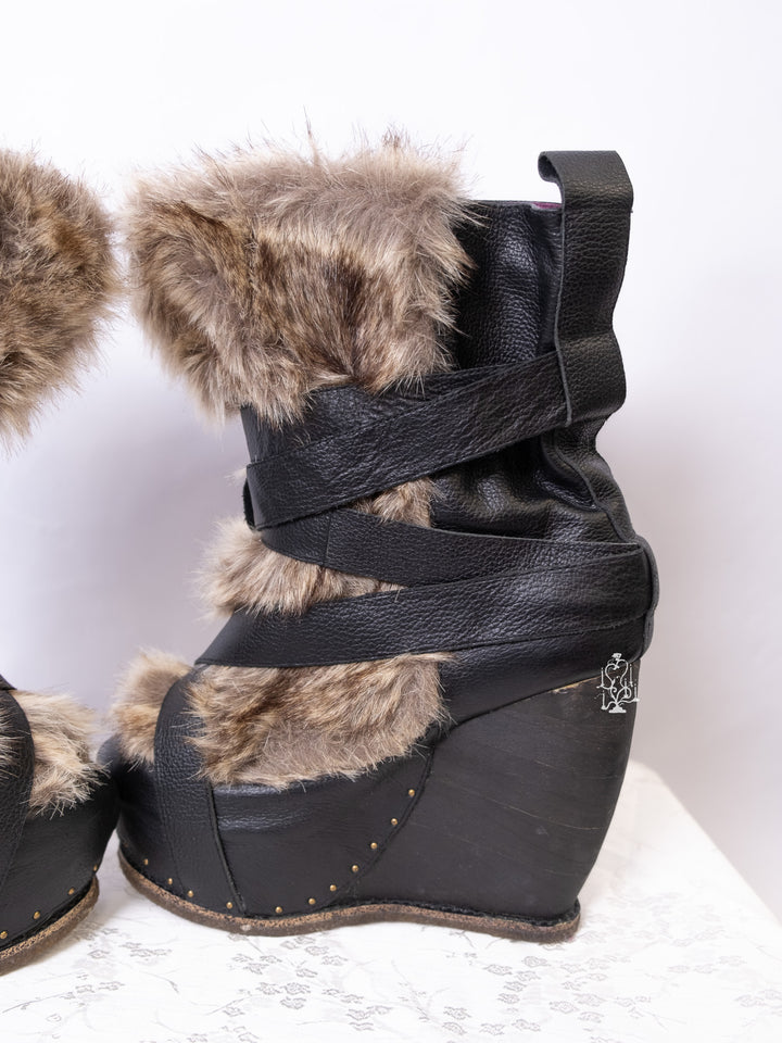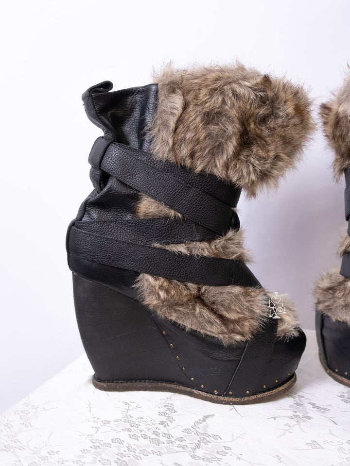 EU42 BEAST BLACK FUR-LINED CROSS-STRAP WEDGE BOOTS