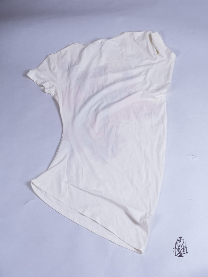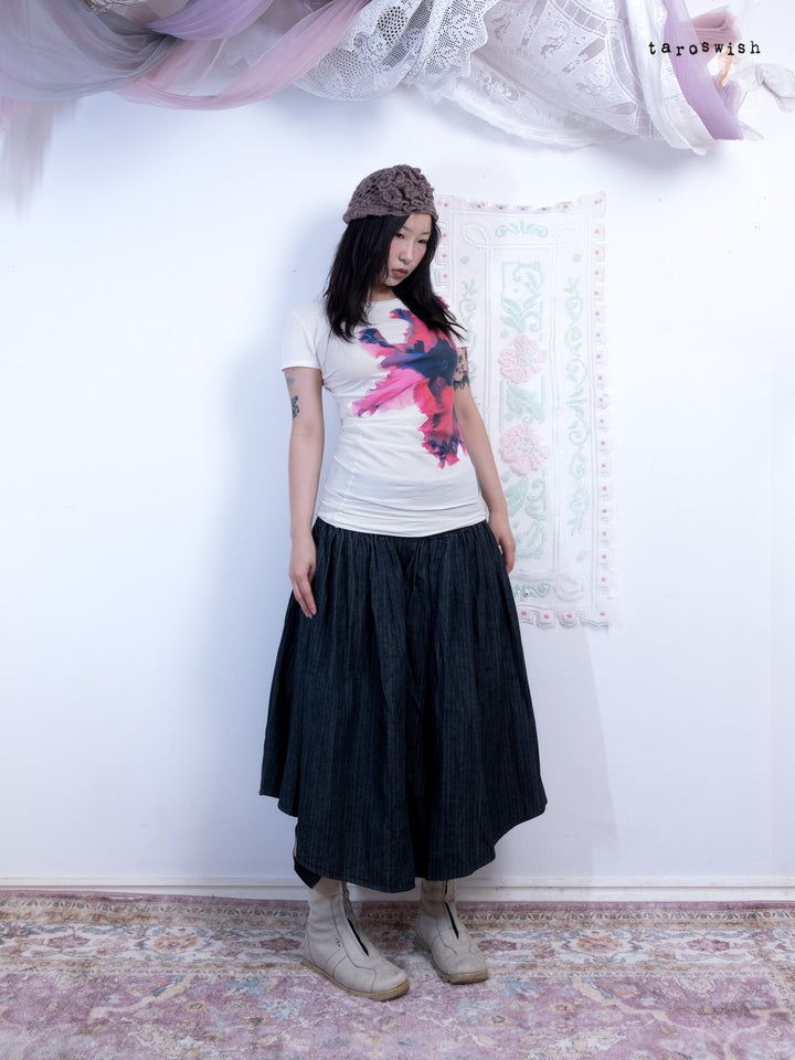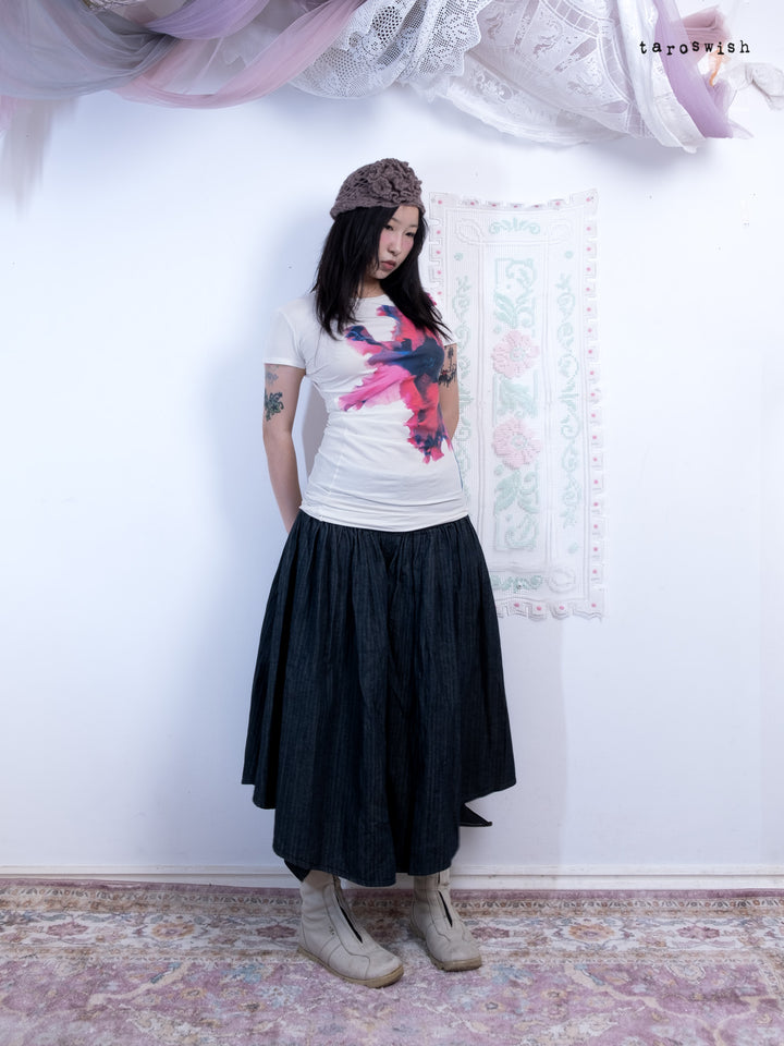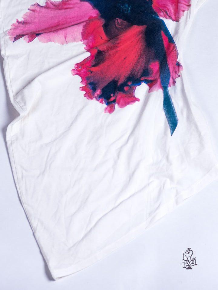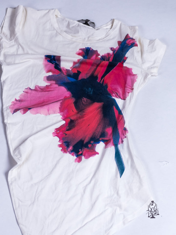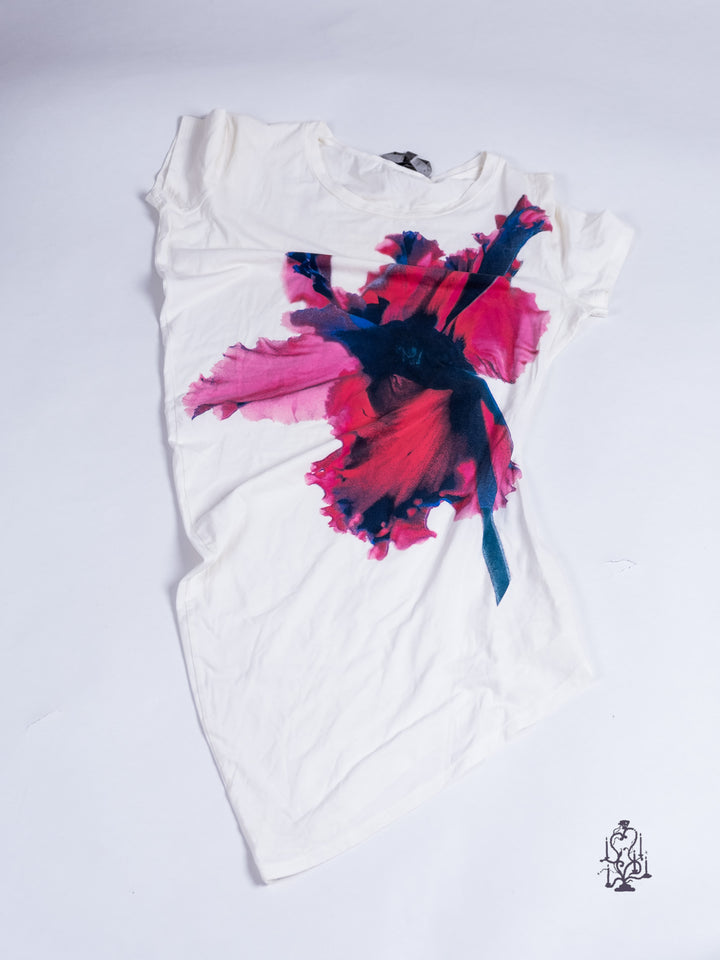 Other: White short-sleeve T-shirt with bold oversized pink and navy abstract floral print and asymmetric hem. A statement vintage-inspired top for casual or artsy outfits.