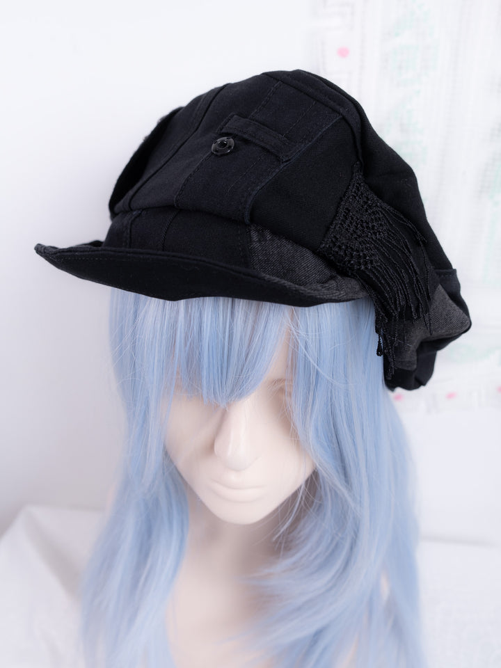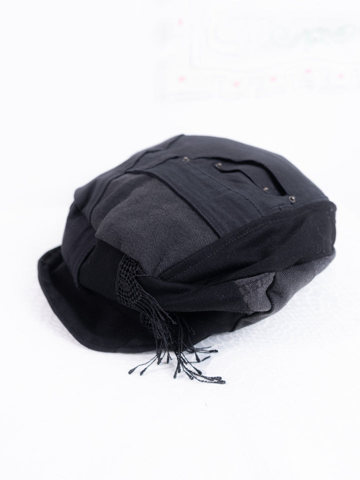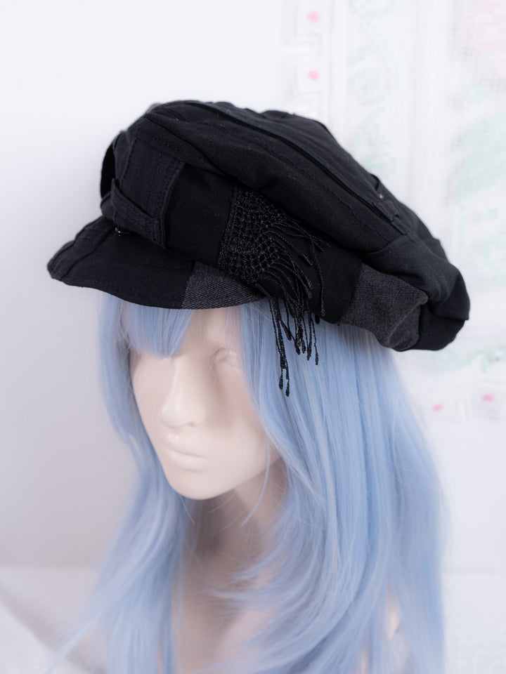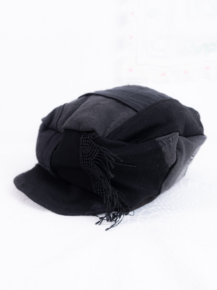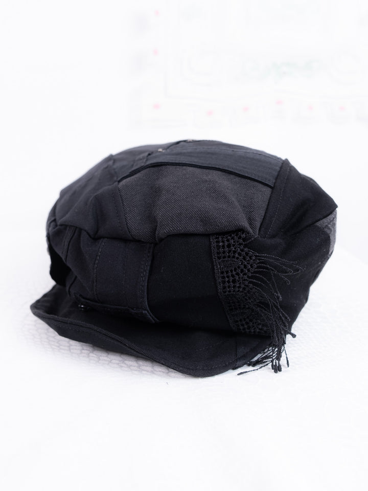 A reimagined beret silhouette built from layered black fabric panels, rivets and tasselled lace threads for a textured finish.