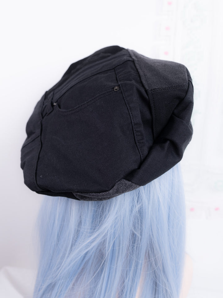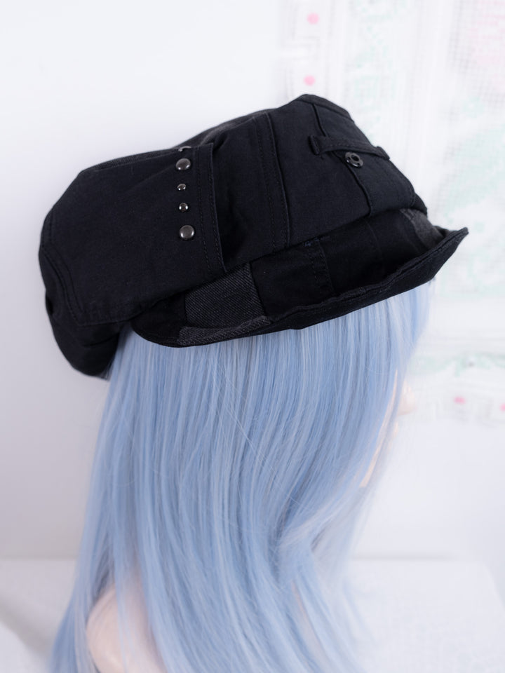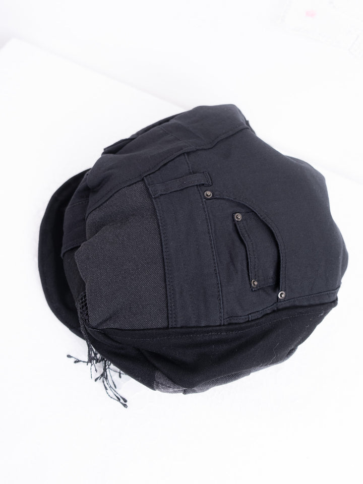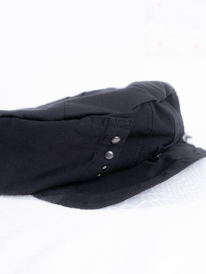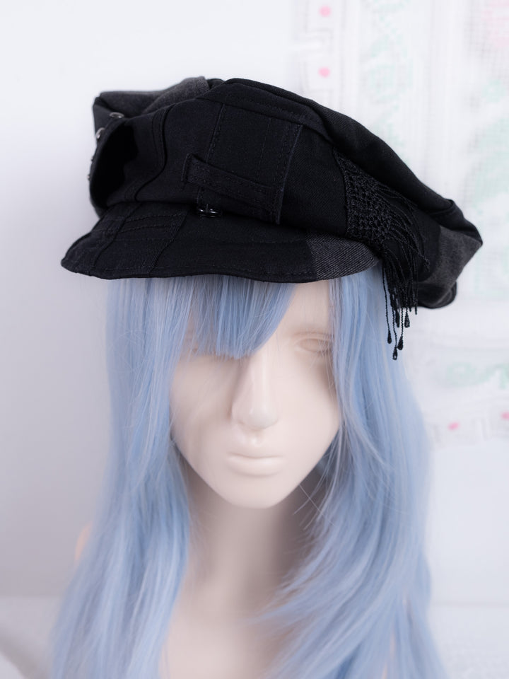 A reimagined beret silhouette built from layered black fabric panels, rivets and tasselled lace threads for a textured finish.