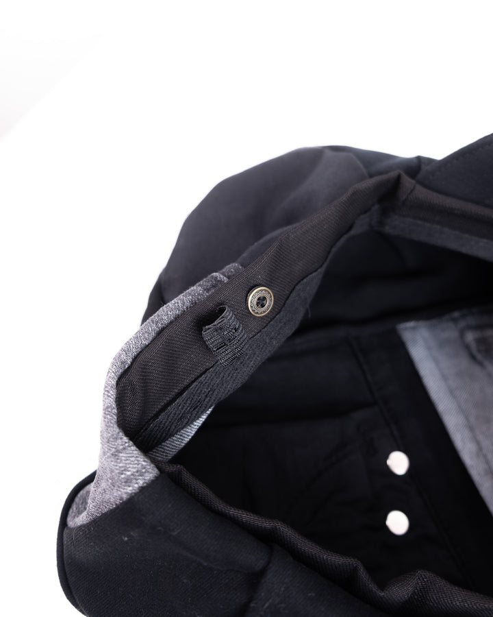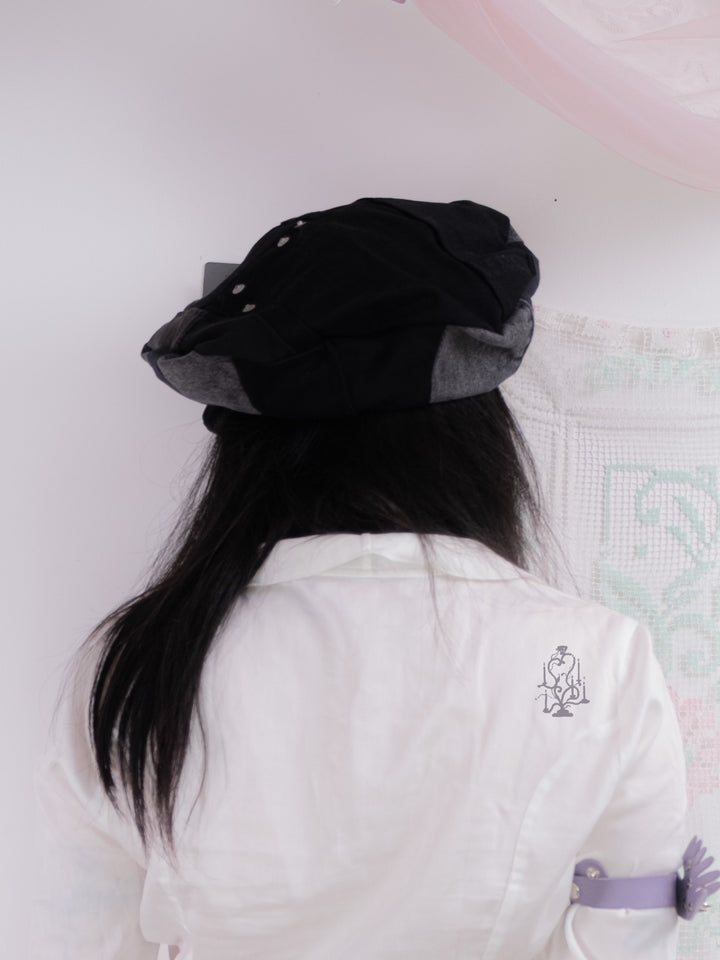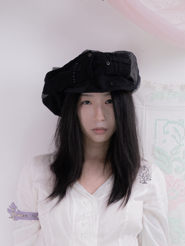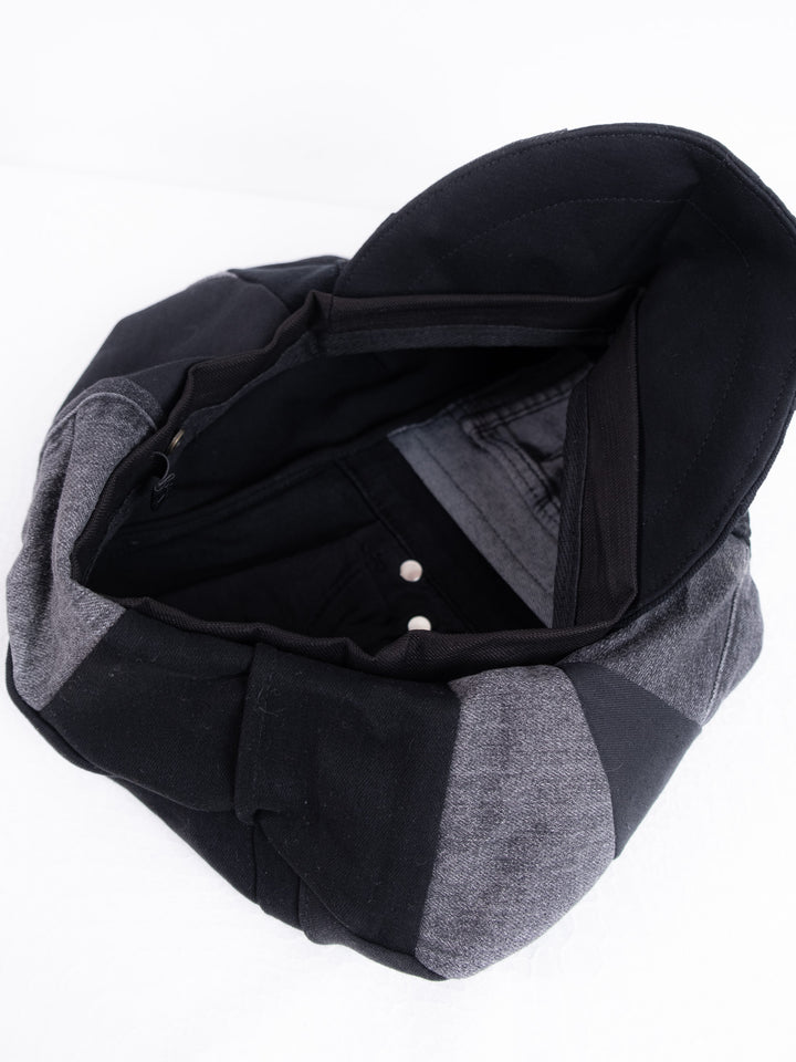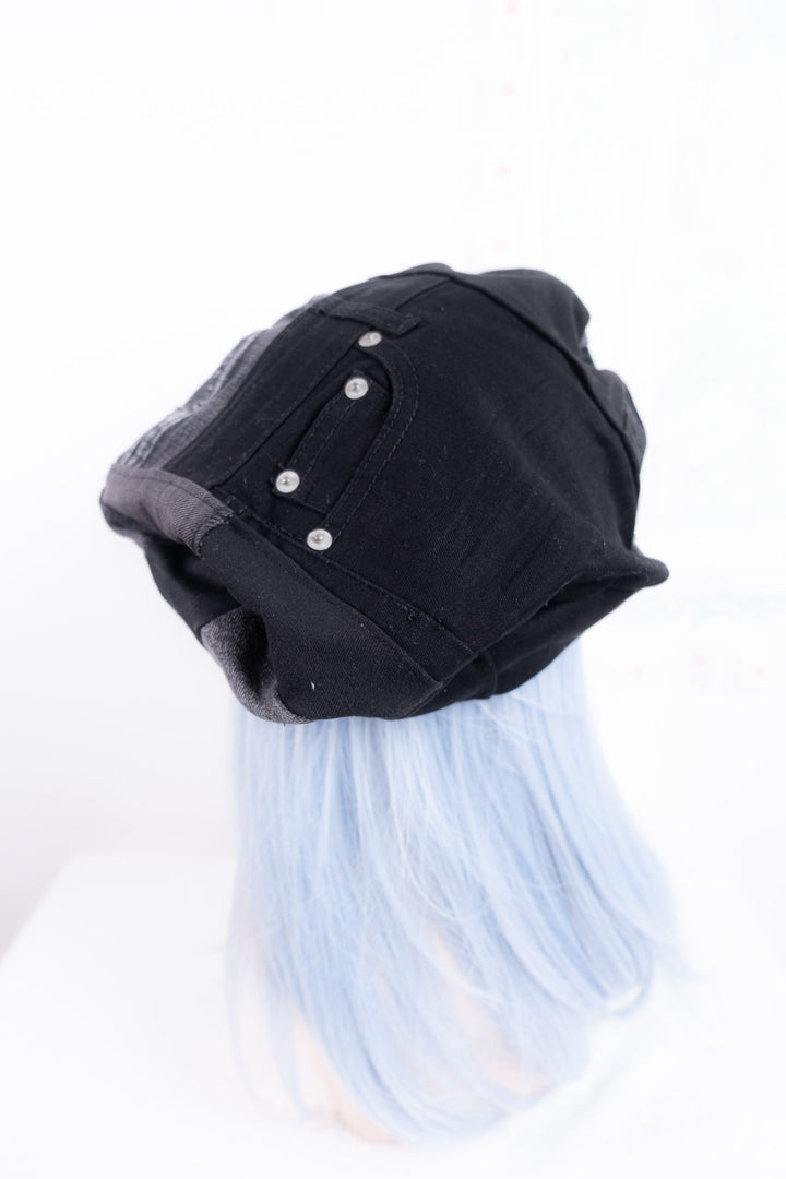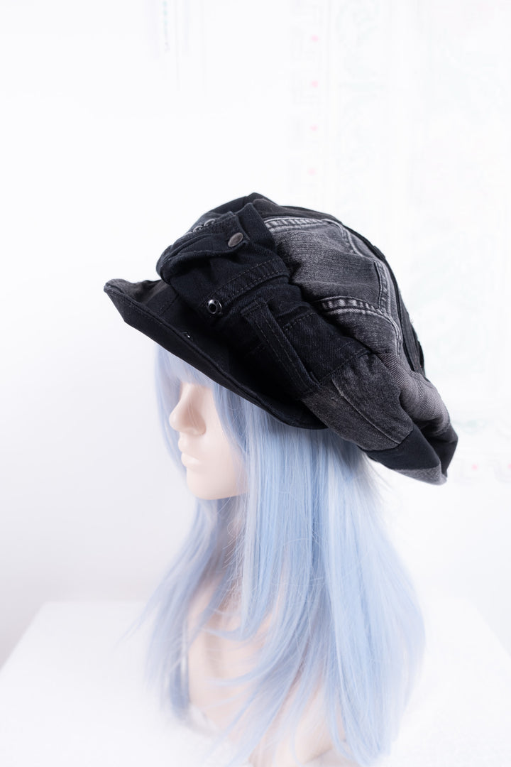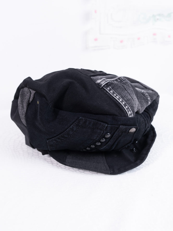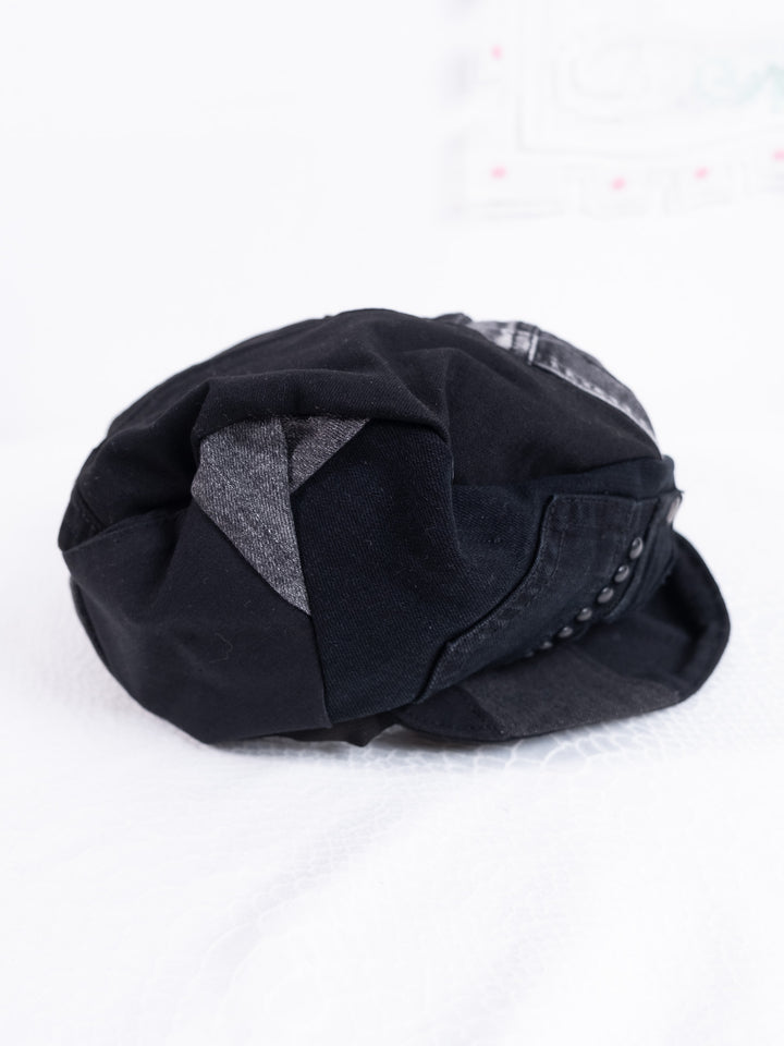 Patchwork cap crafted from mixed black and grey denim panels, detailed with stud accents and decorative seams.
