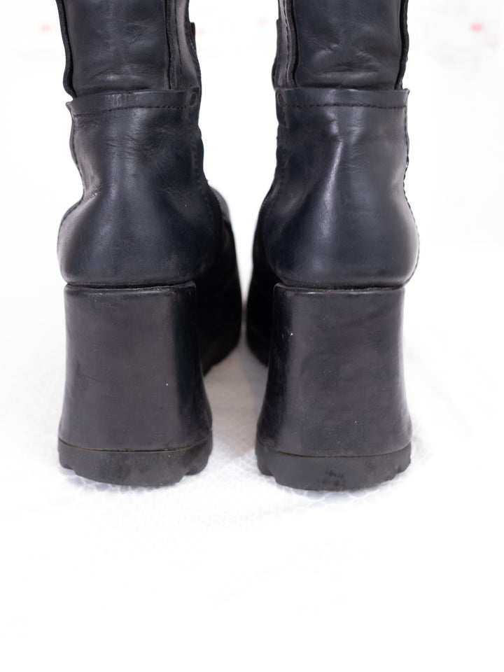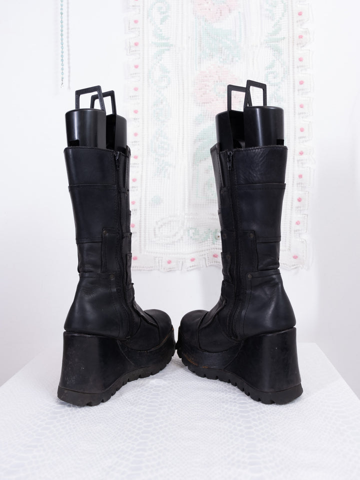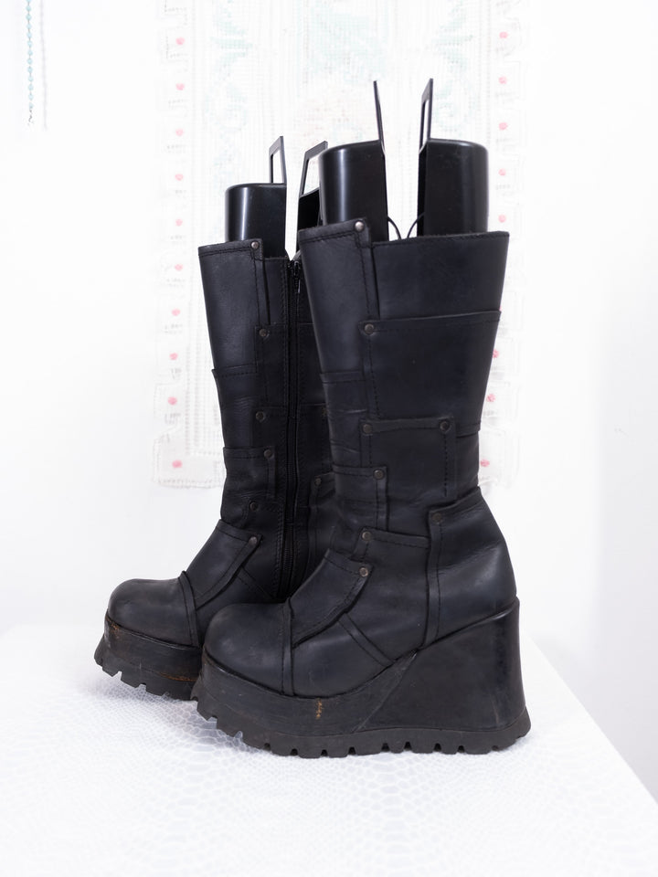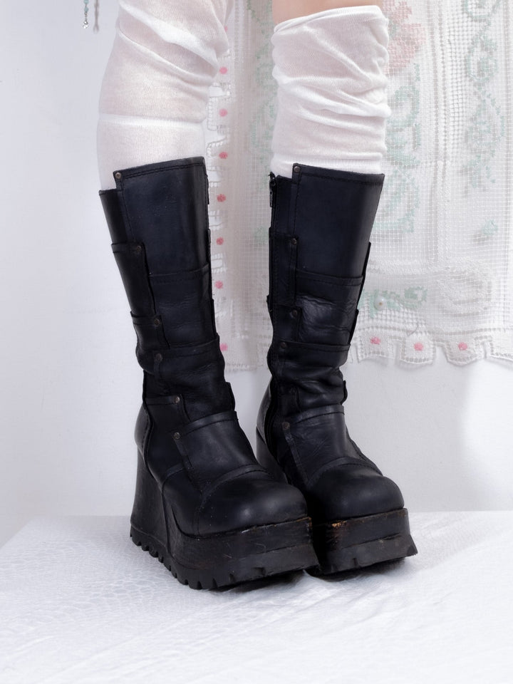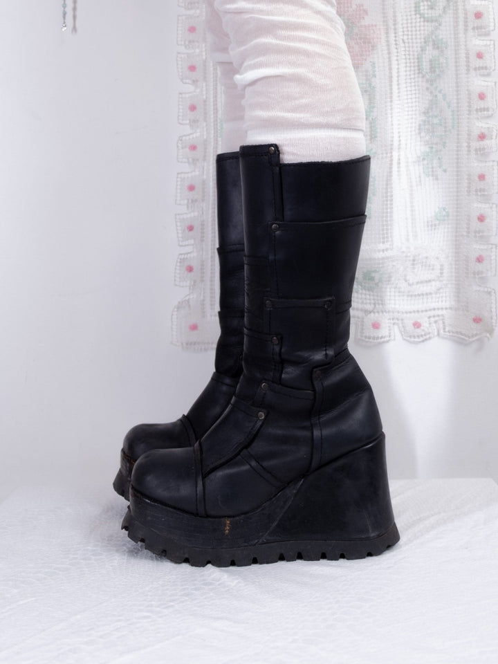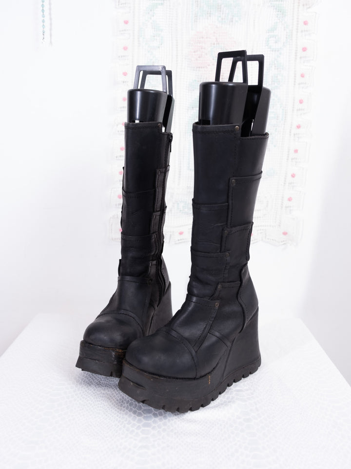 EU39 BLACK LEATHER PLATFORM WEDGE BOOTS