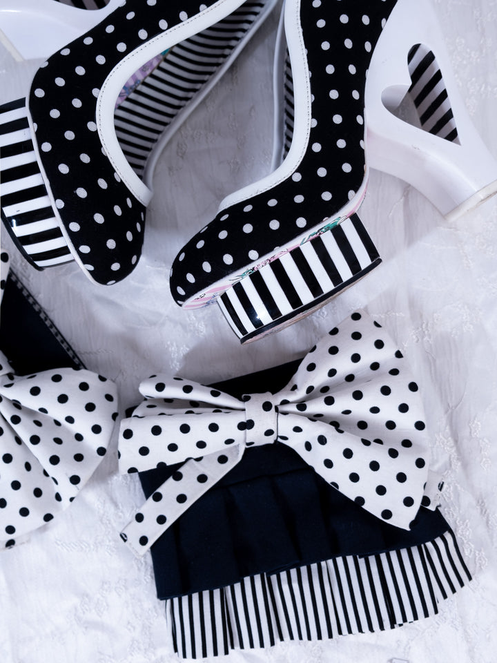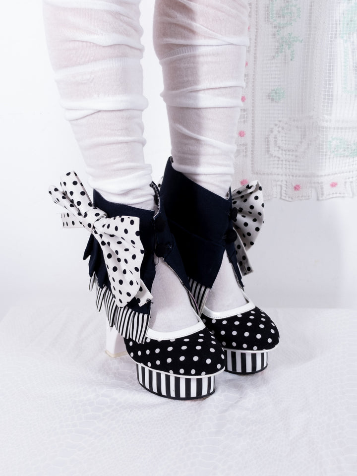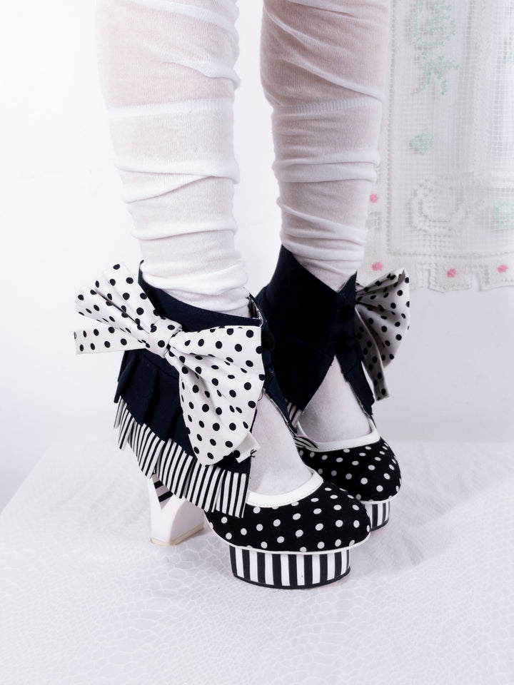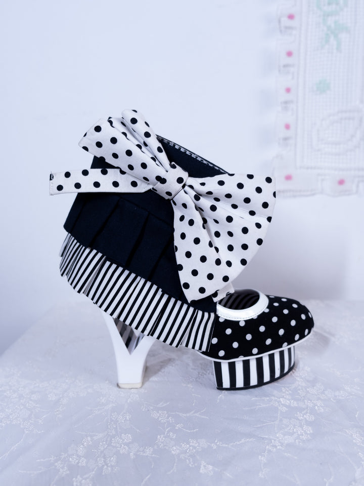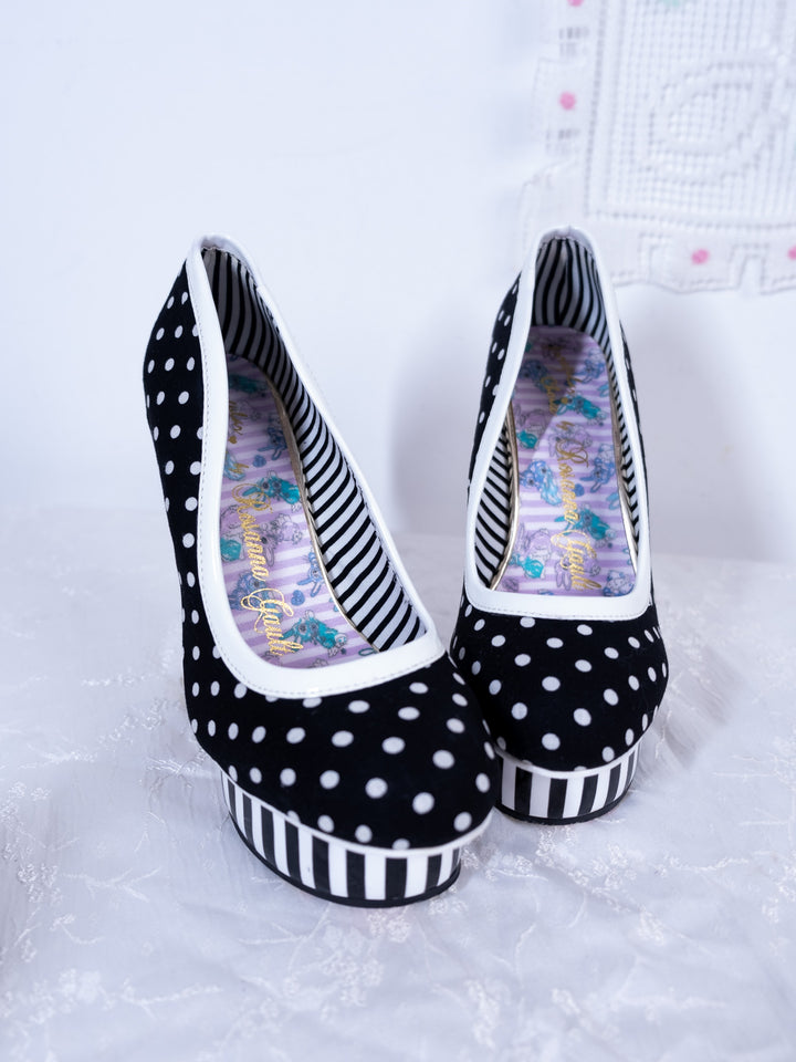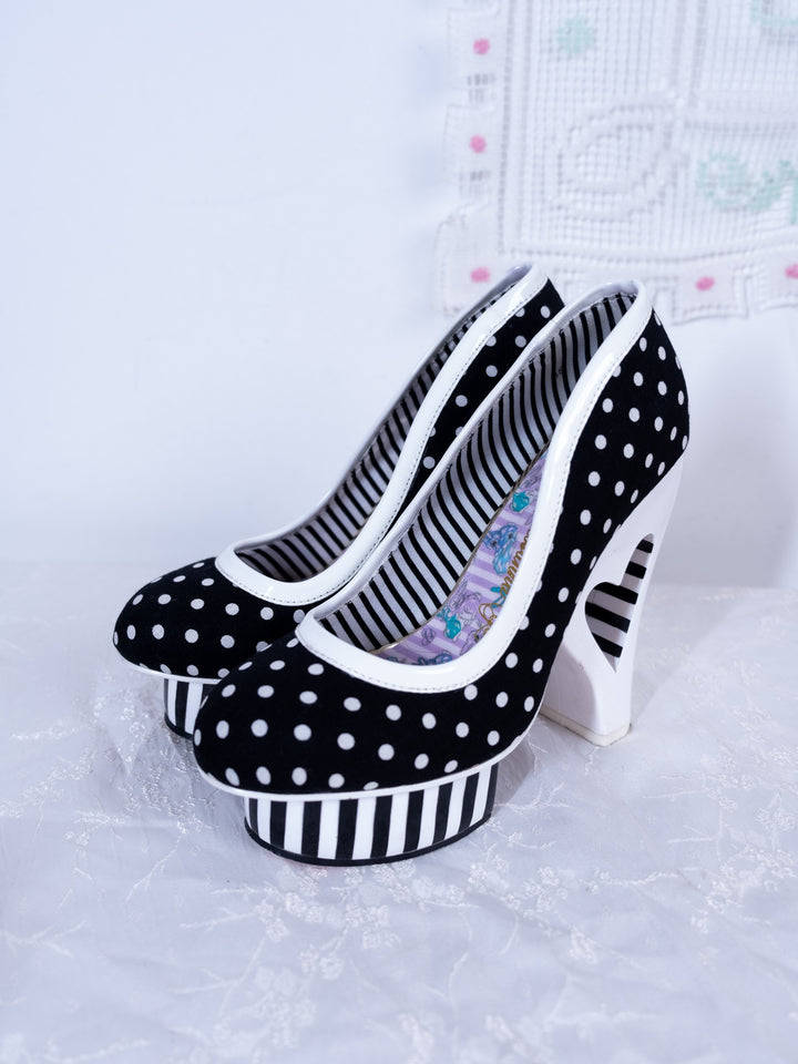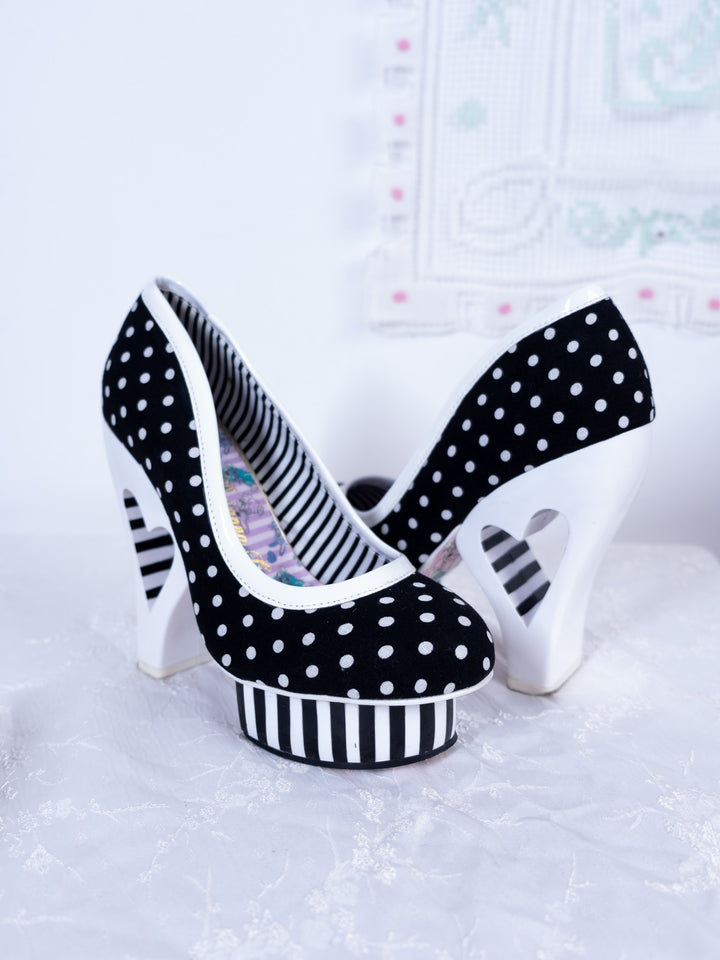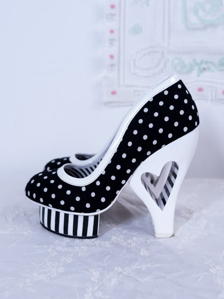 IRREGULAR CHOICE EU38 BLACK AND WHITE POLKA DOT BOW HEELS