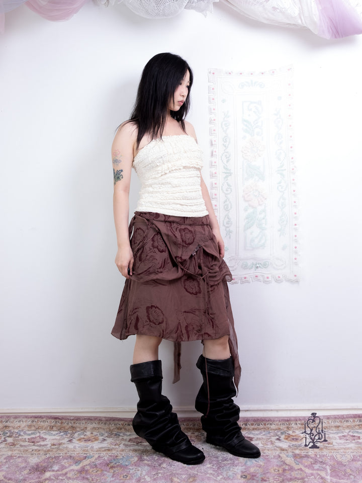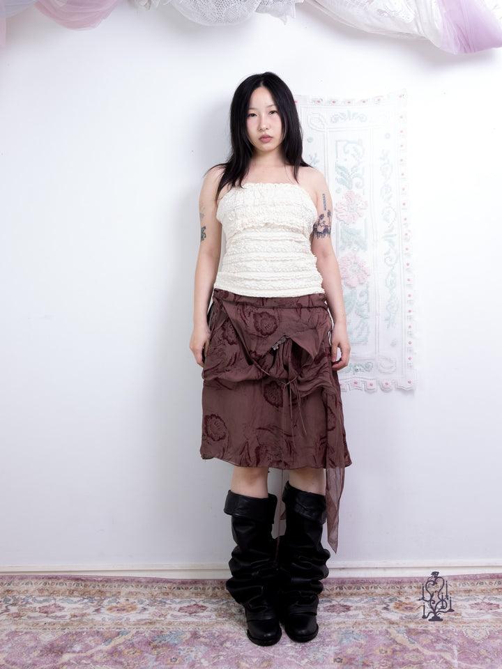 Stretchy cream tube top with floral lace texture and soft elastic ruching.