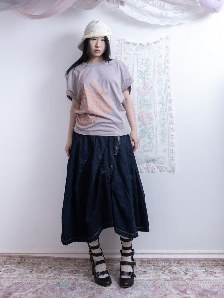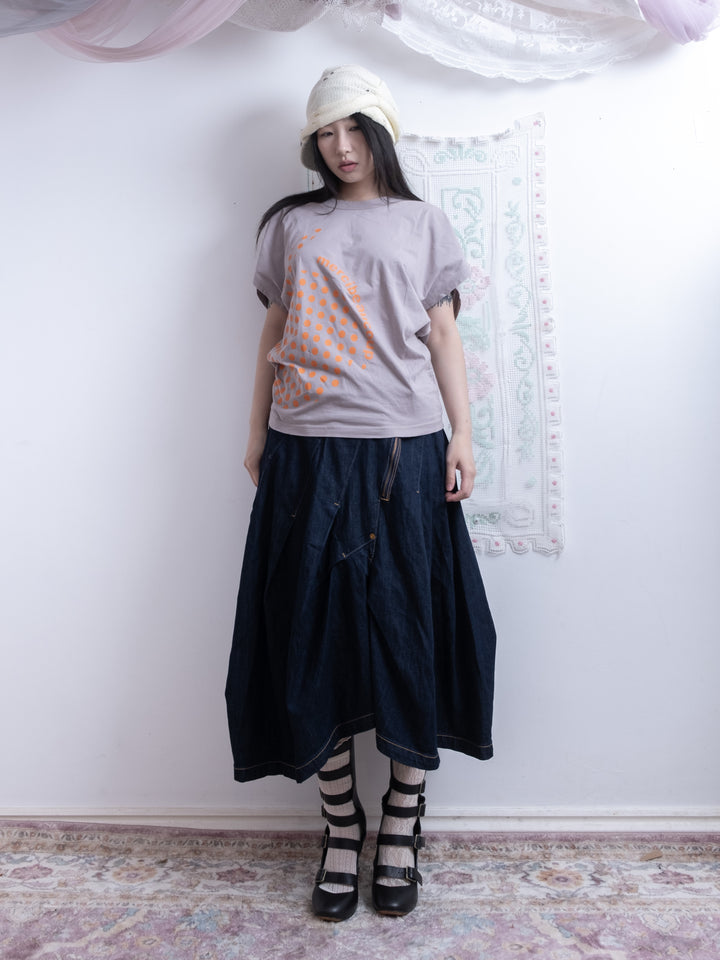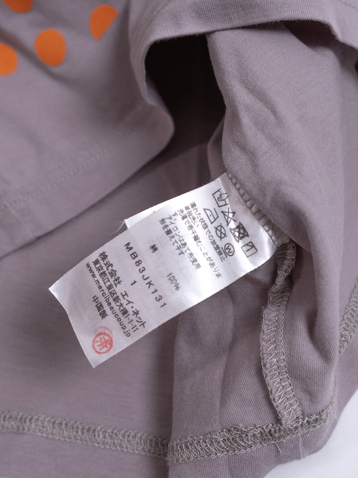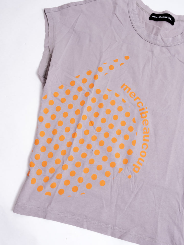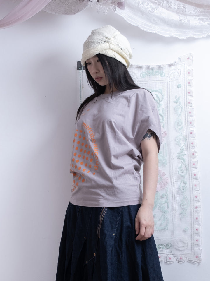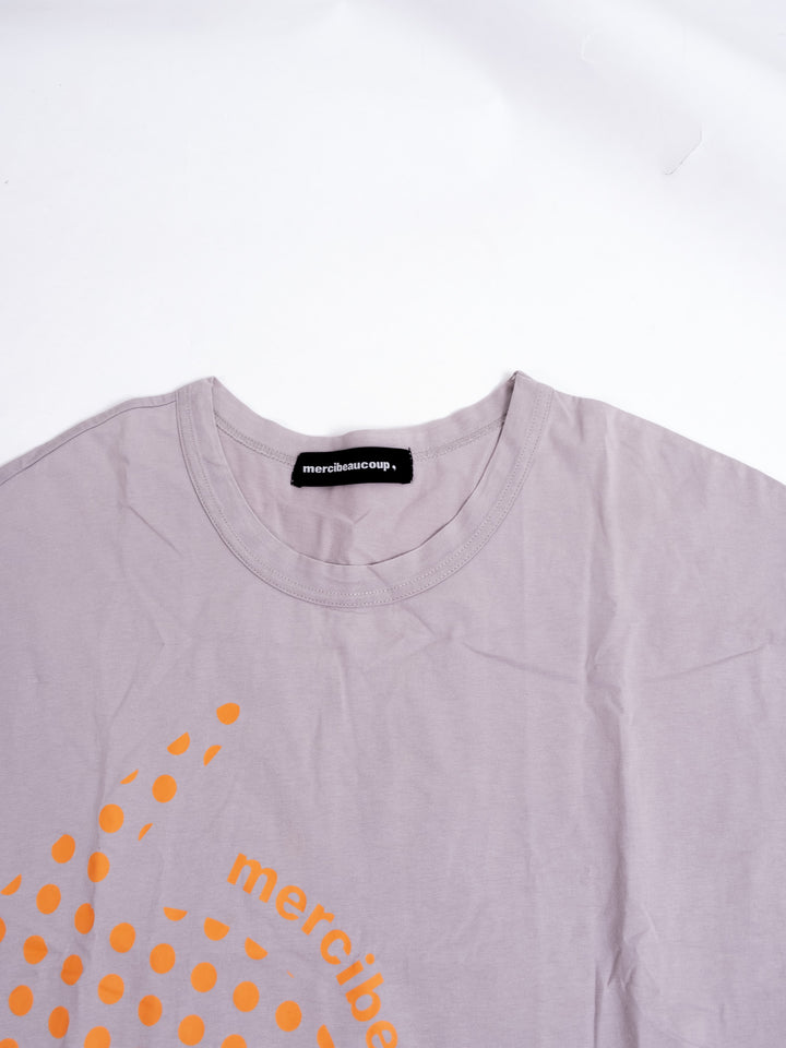 Playful grey tee by mercibeaucoup featuring oversized orange polka dot print and curved logo detail.