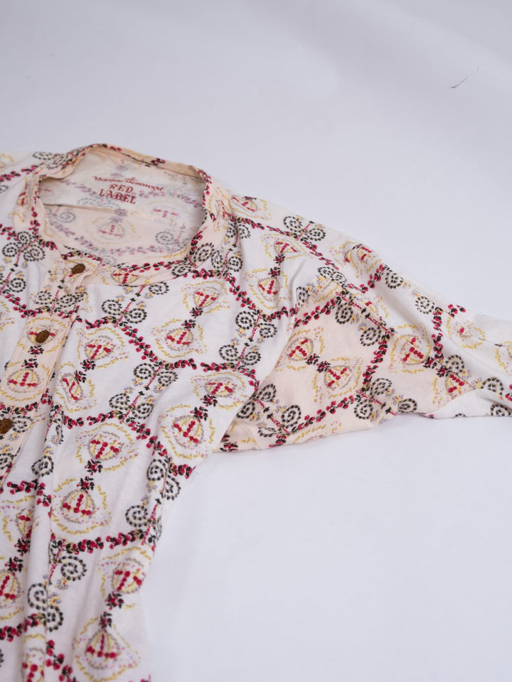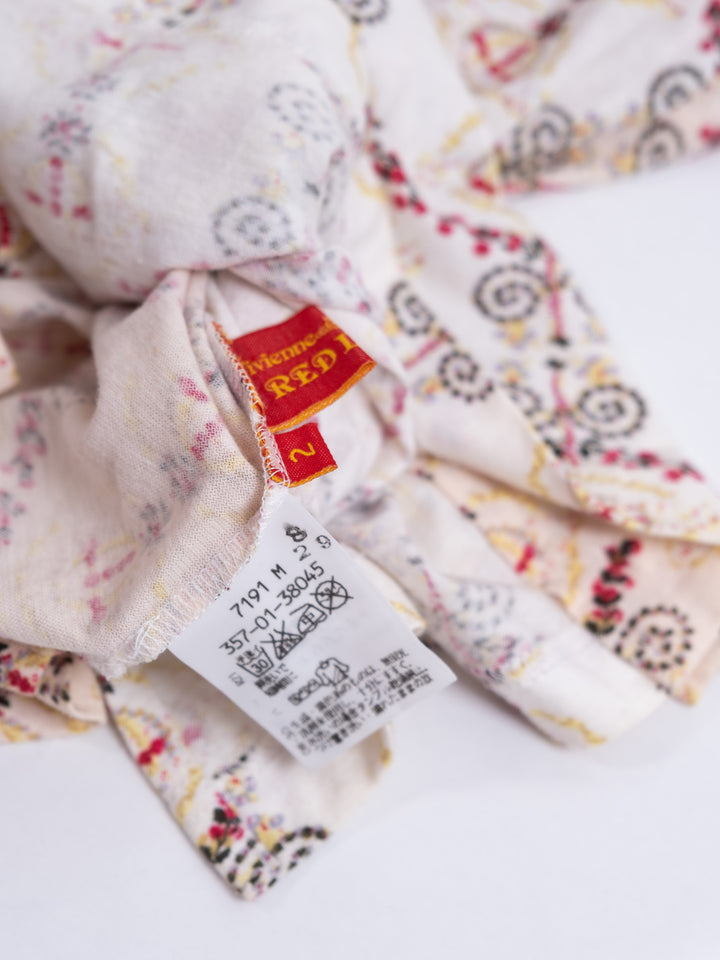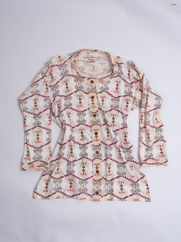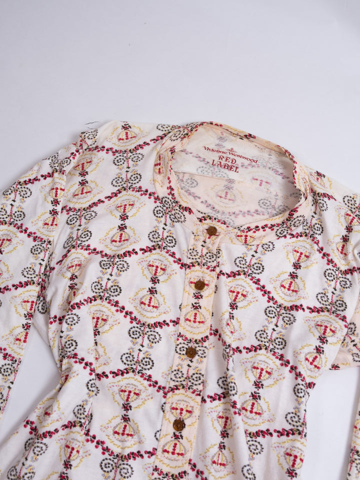 Vivienne Westwood Red Label vintage top with signature orb print in red, yellow, and black. Soft fitted jersey with front buttons and stretch feel.