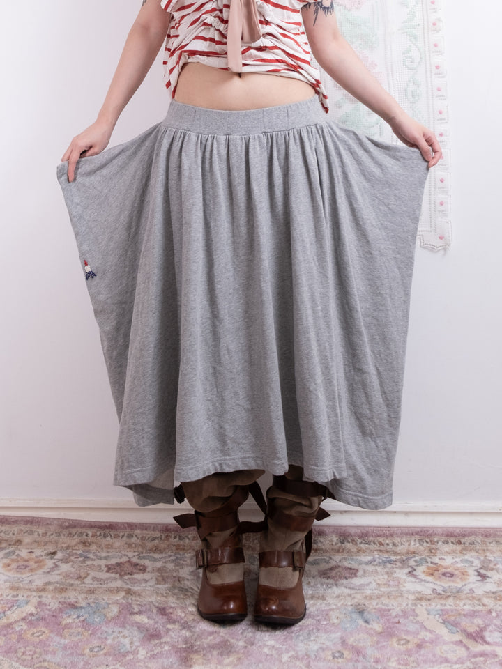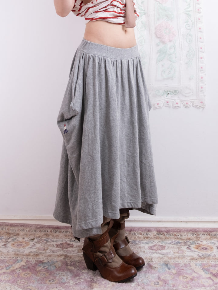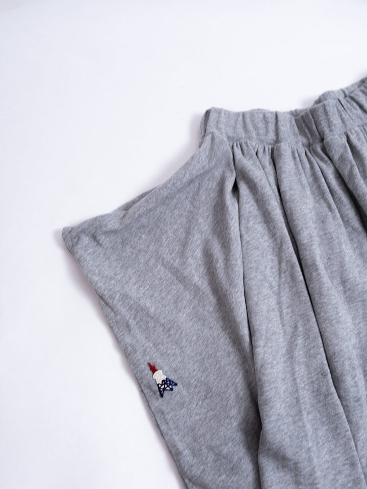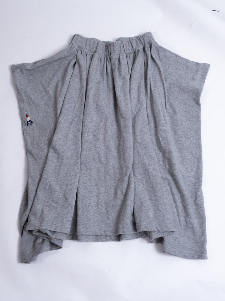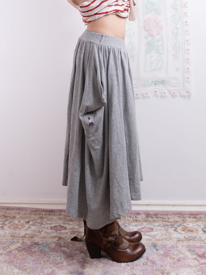 Light heather grey cotton skirt with a relaxed drape and flared shape, finished with a tiny Eiffel Tower embroidery near the hem and a comfy elastic waistband.