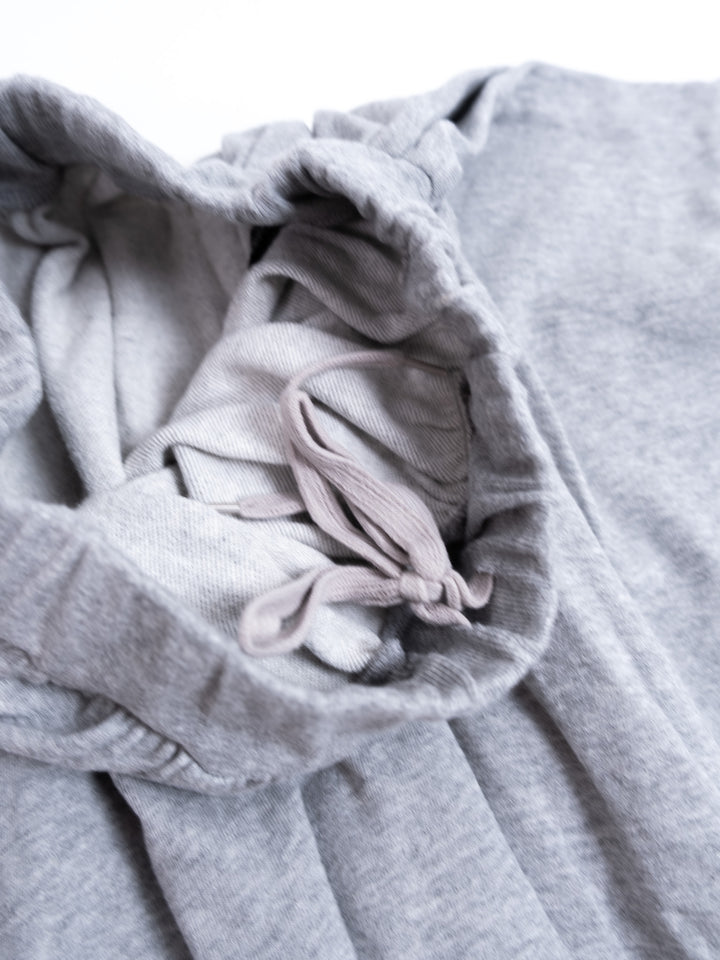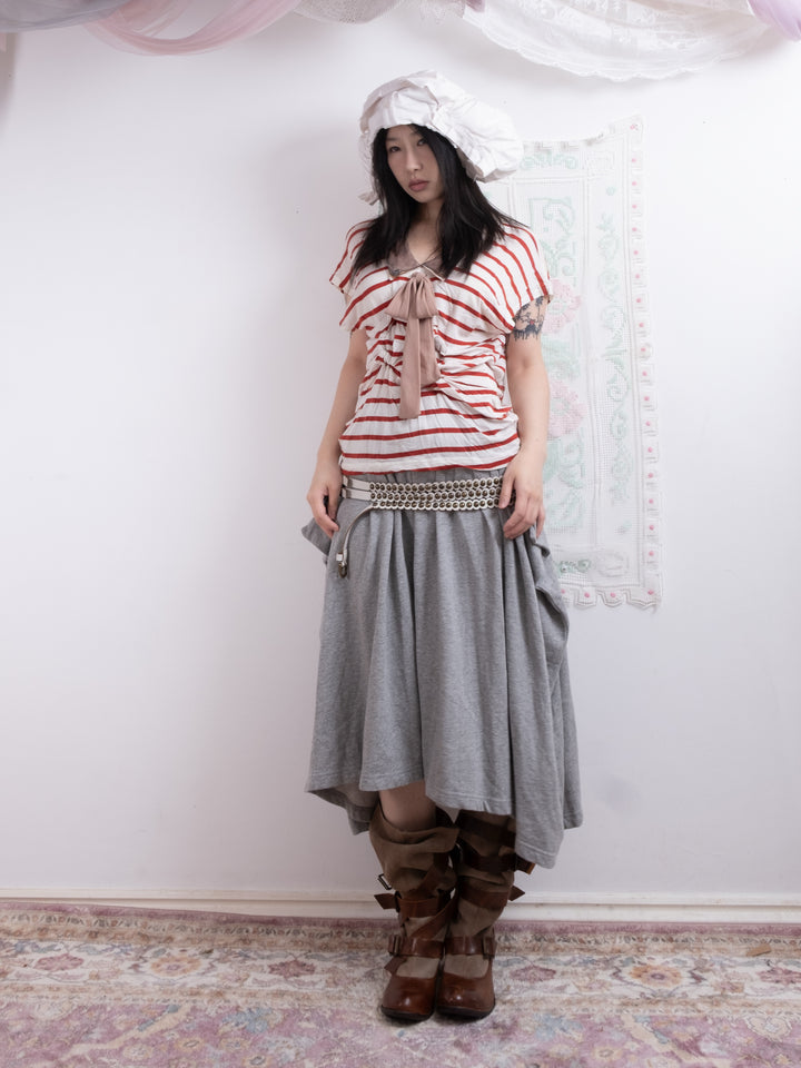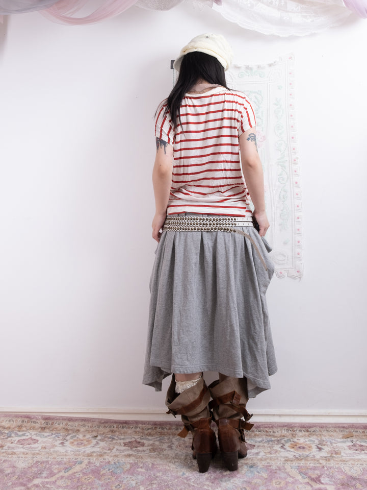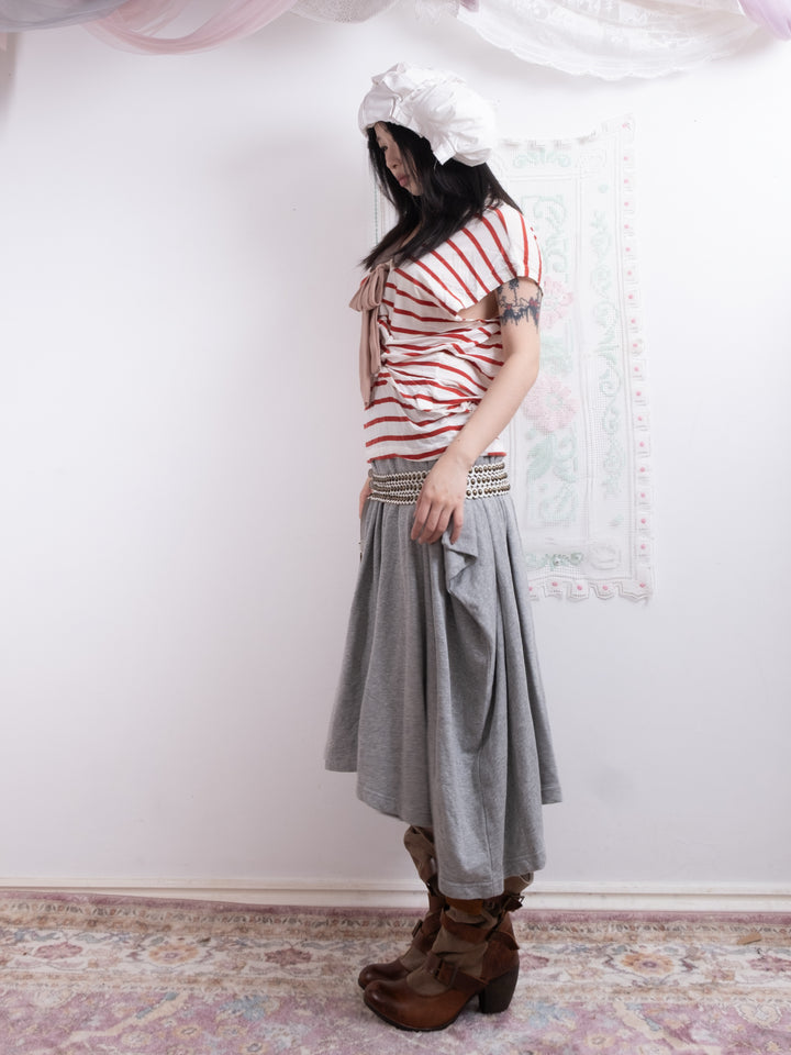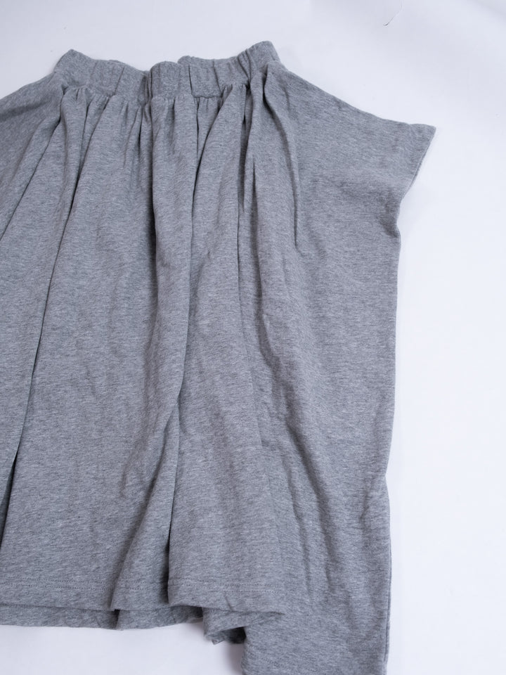 Light heather grey cotton skirt with a relaxed drape and flared shape, finished with a tiny Eiffel Tower embroidery near the hem and a comfy elastic waistband.