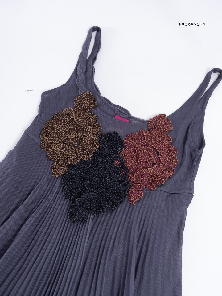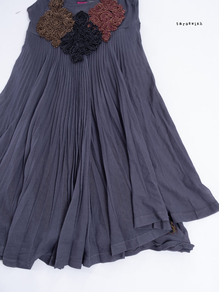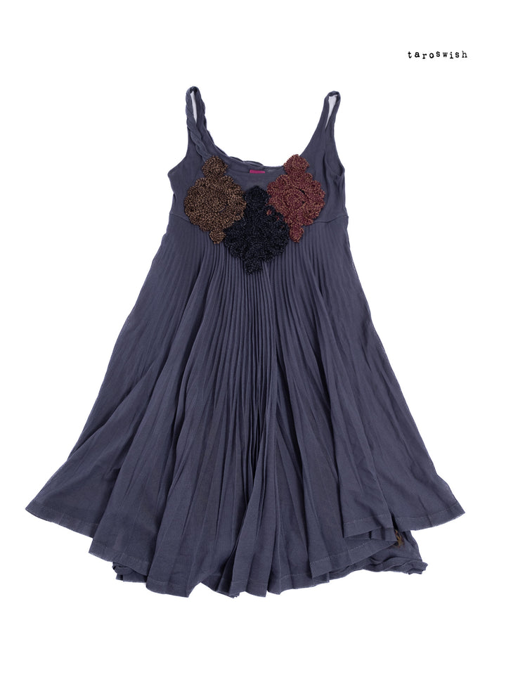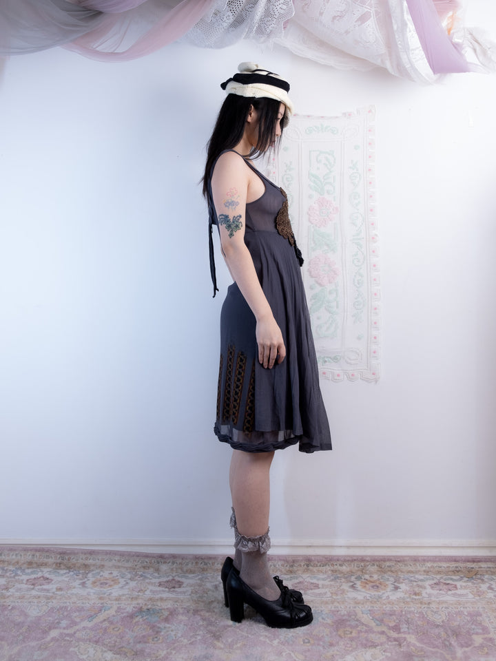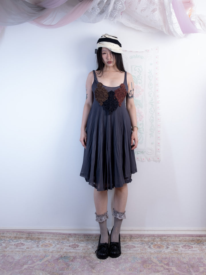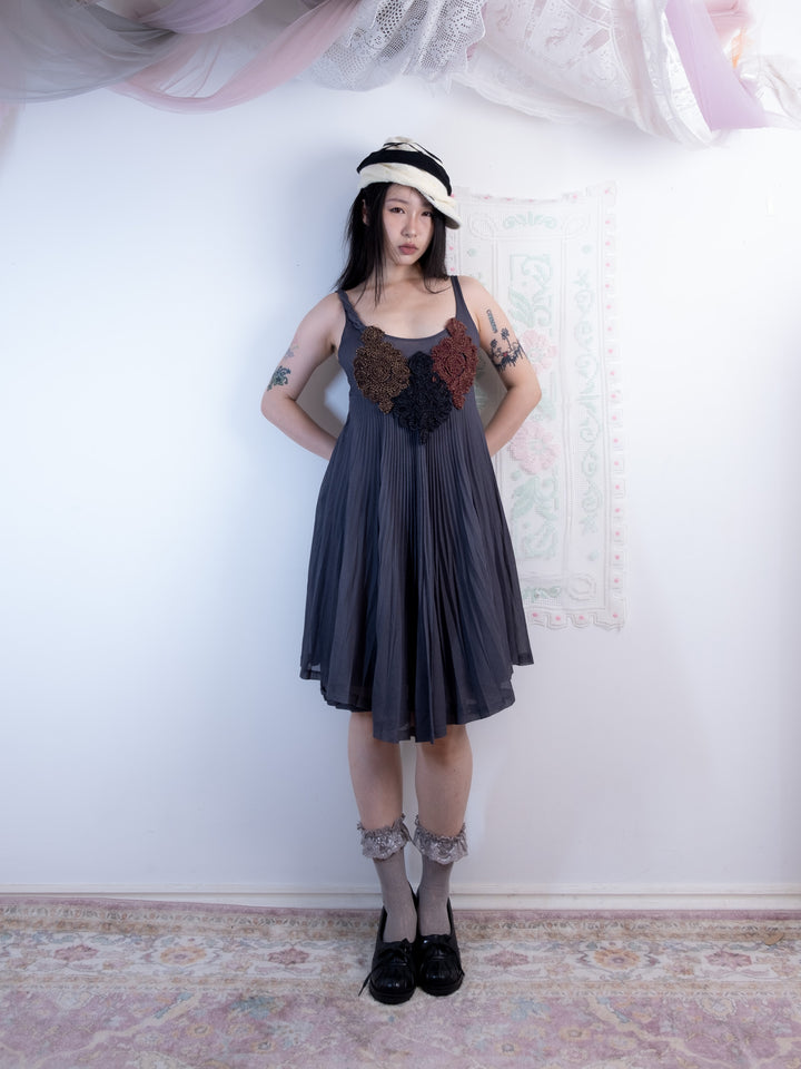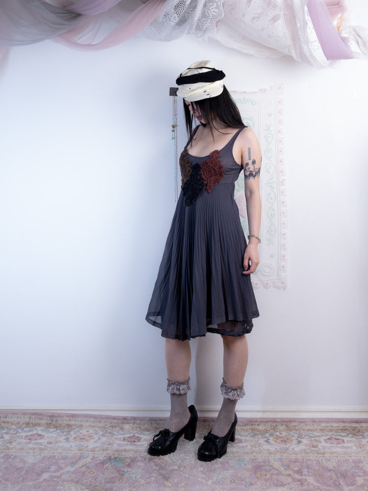 SAVE THE QUEEN PLEATED CHARCOAL DRESS WITH BEADED APPLIQUÉ