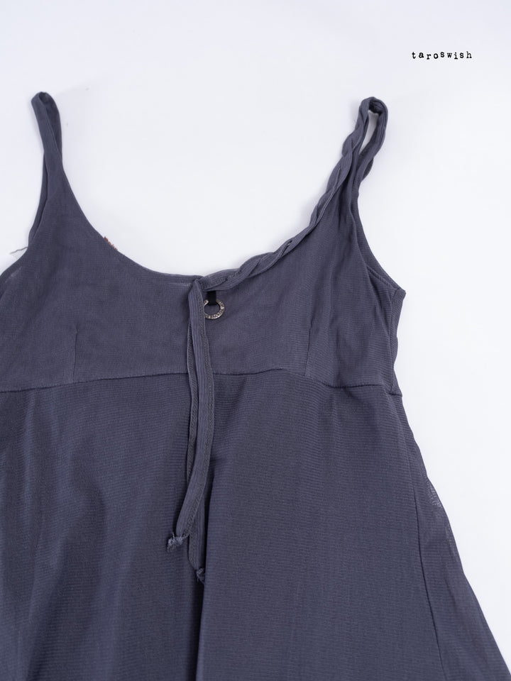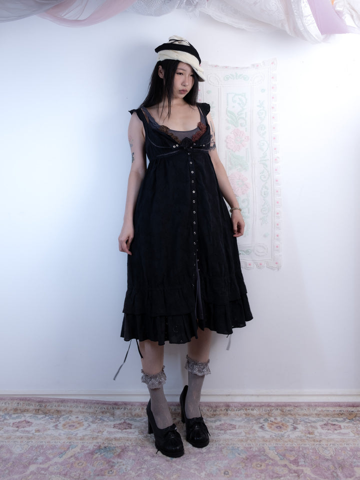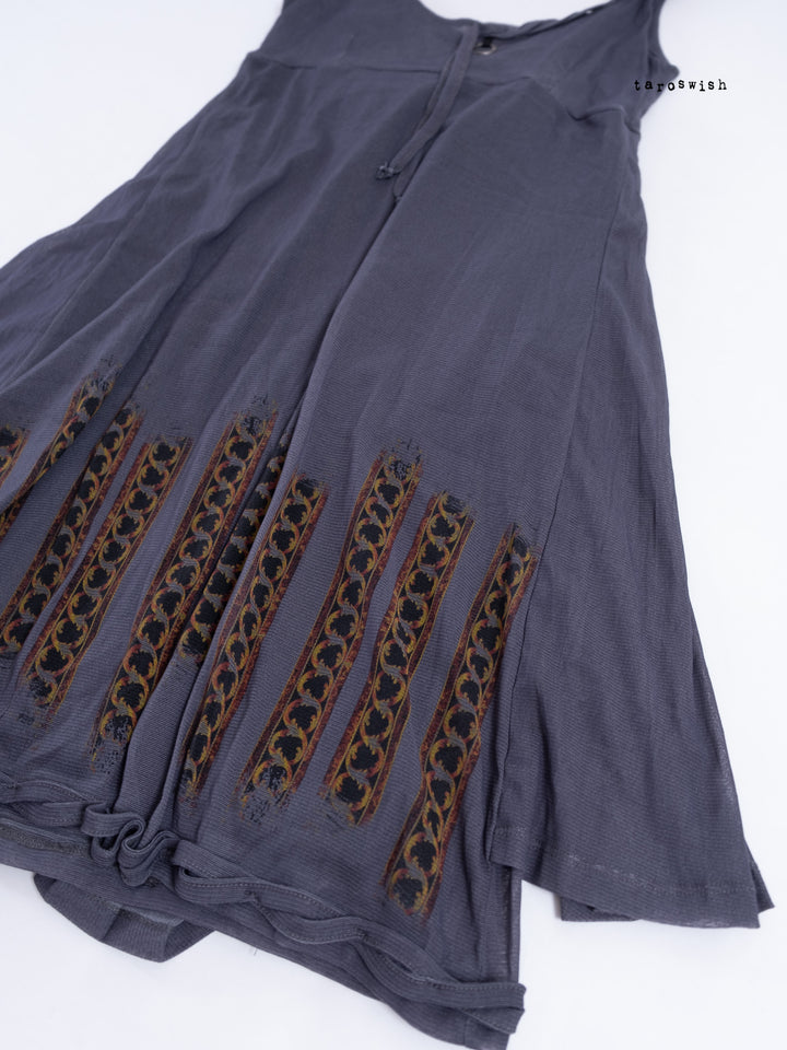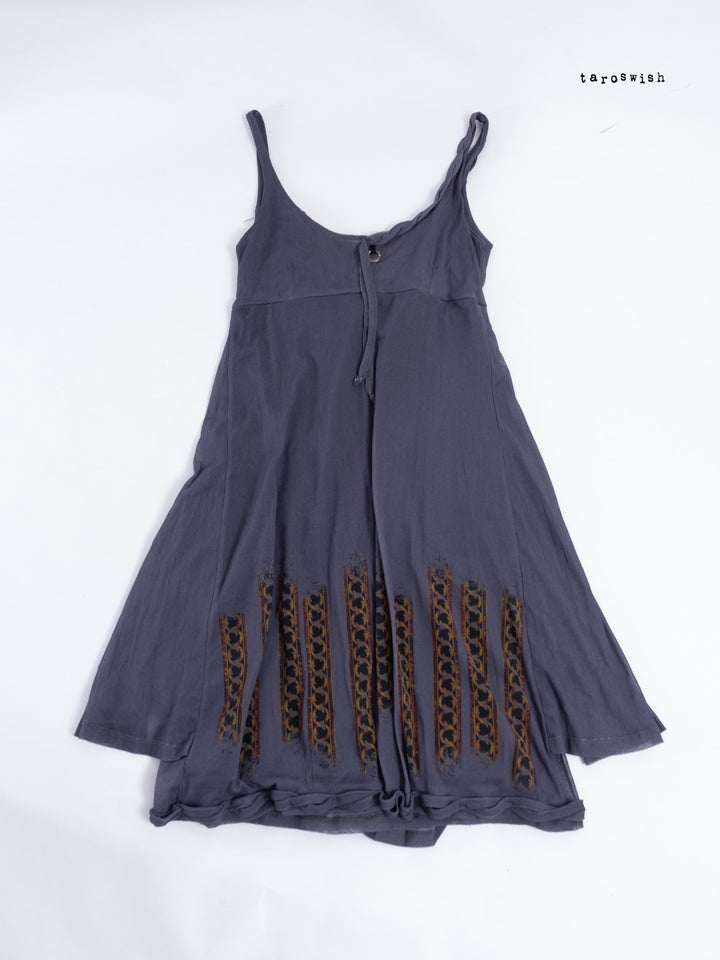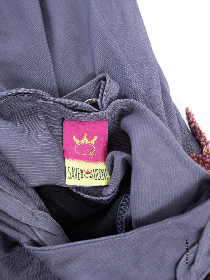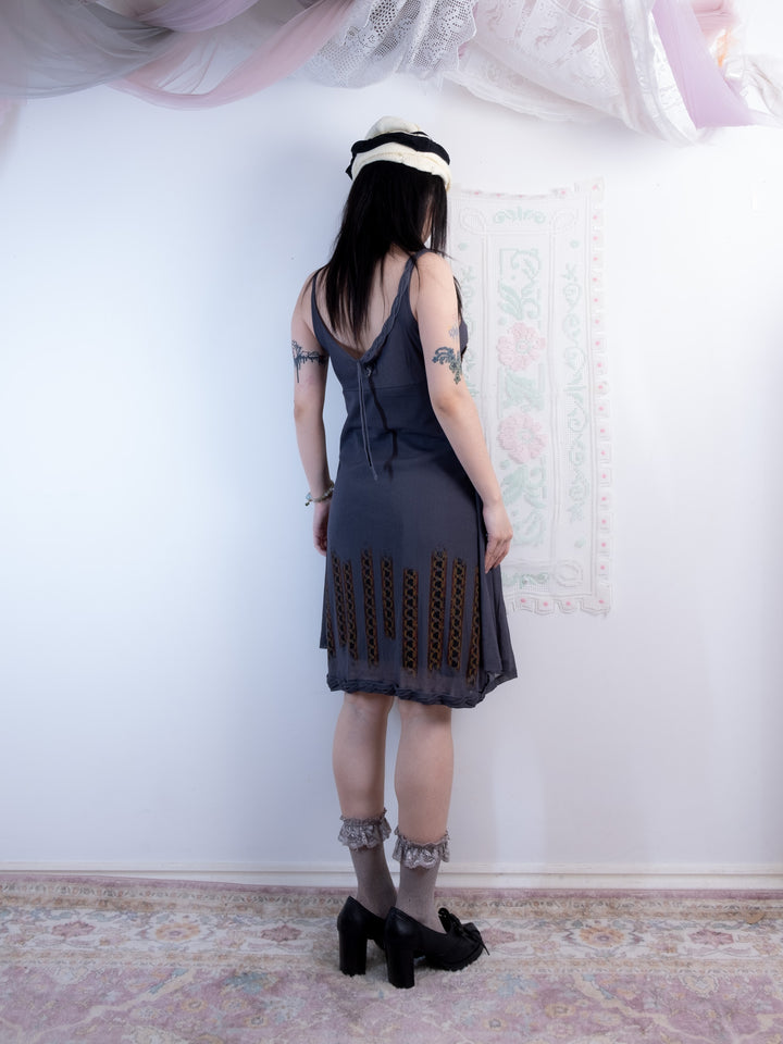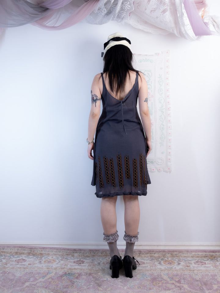 SAVE THE QUEEN PLEATED CHARCOAL DRESS WITH BEADED APPLIQUÉ