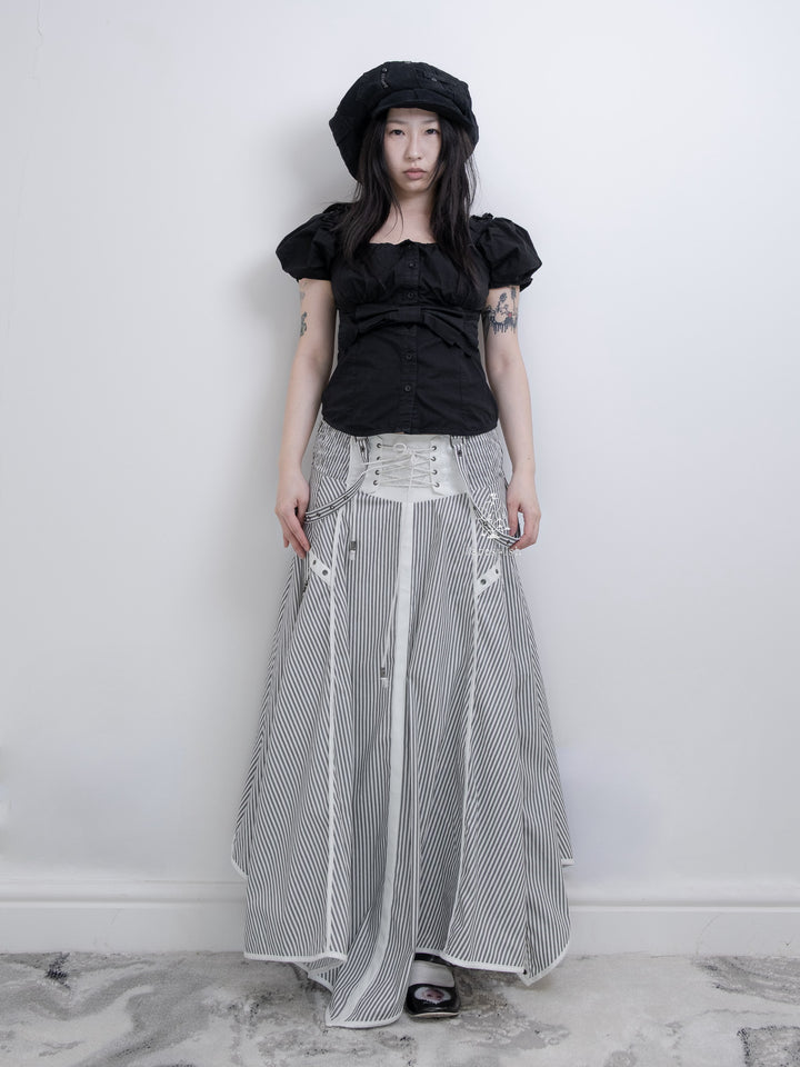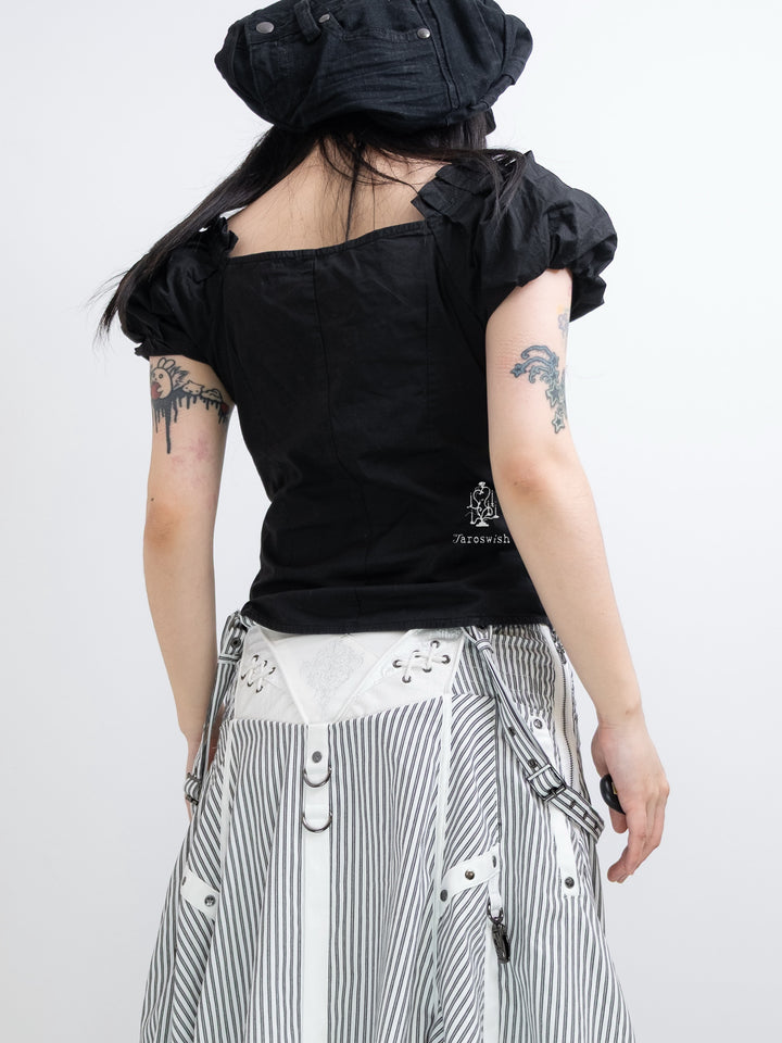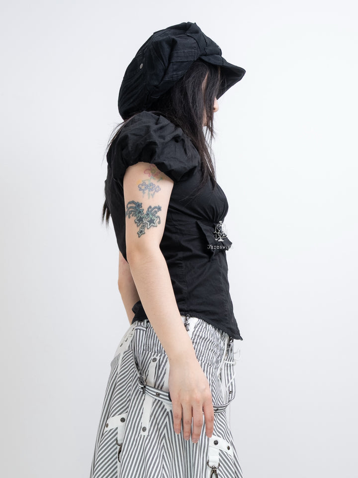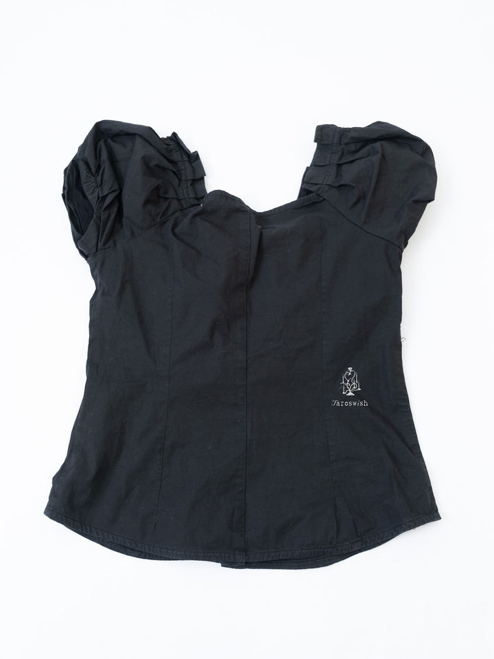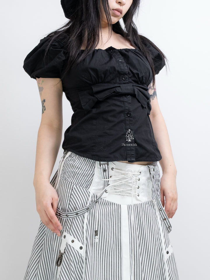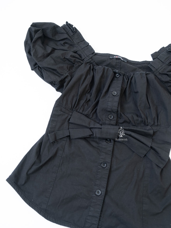 Black puff-sleeve blouse with front buttons and large bow detail.