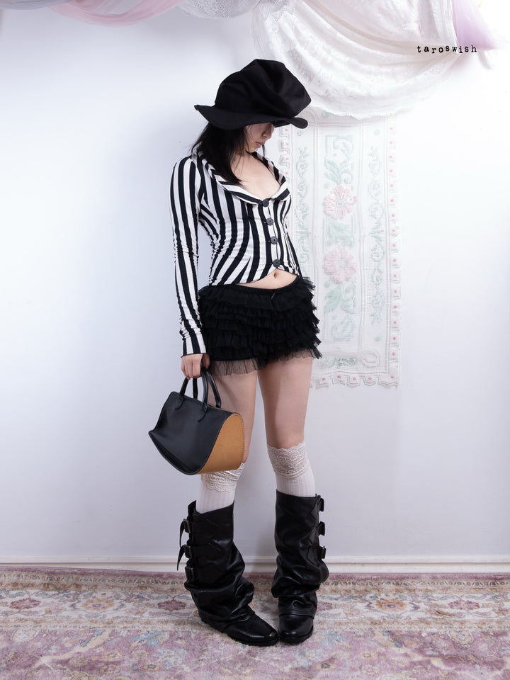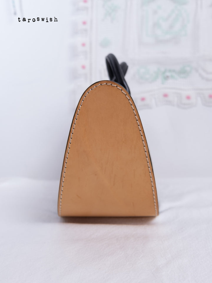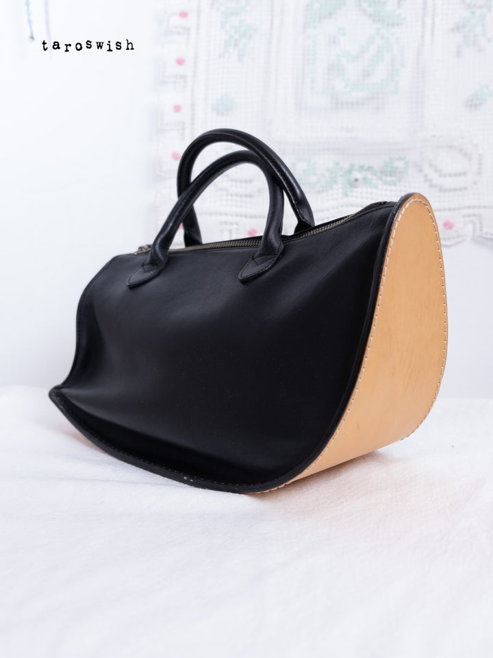 Minimal black leather handbag with curved wooden base. A sleek, architectural statement piece.