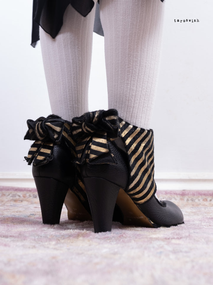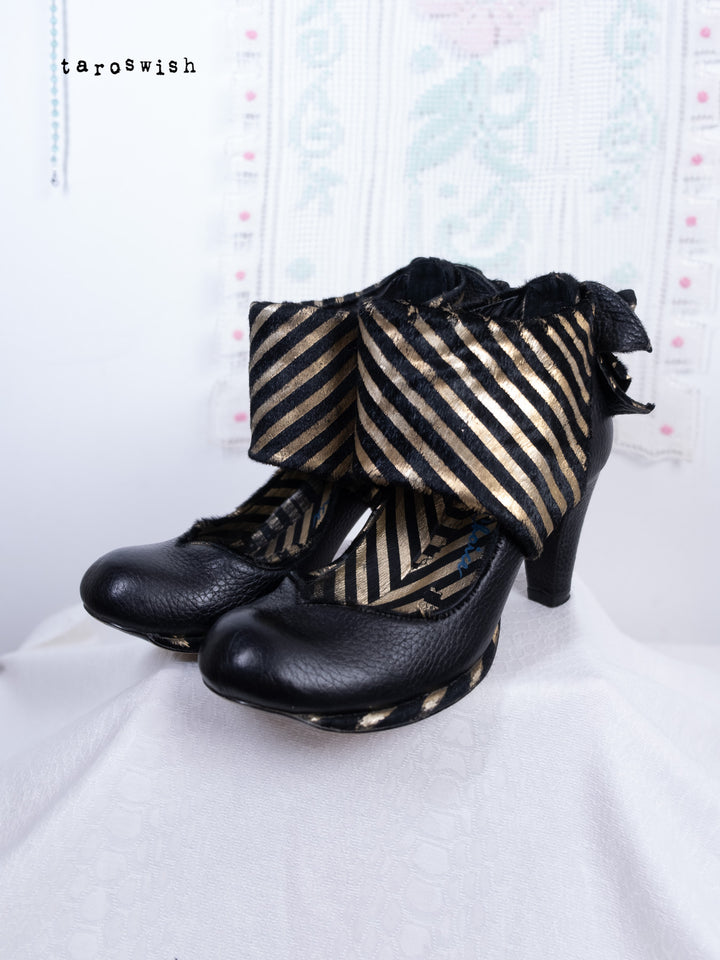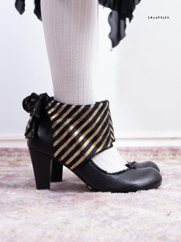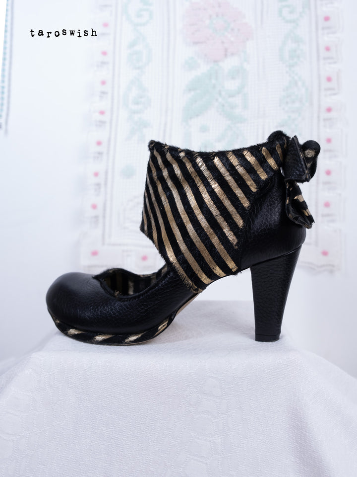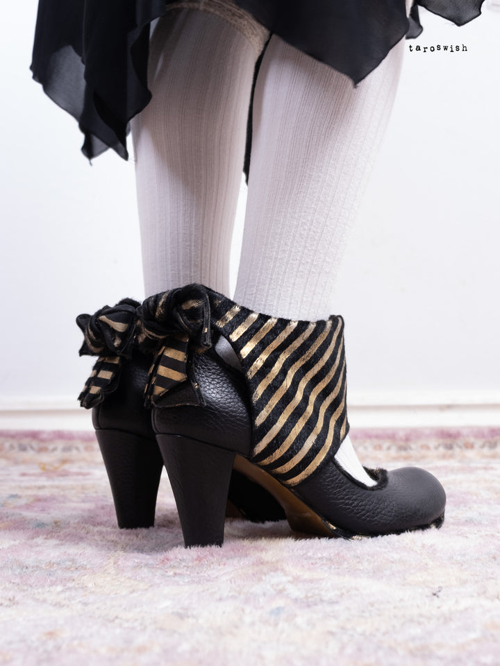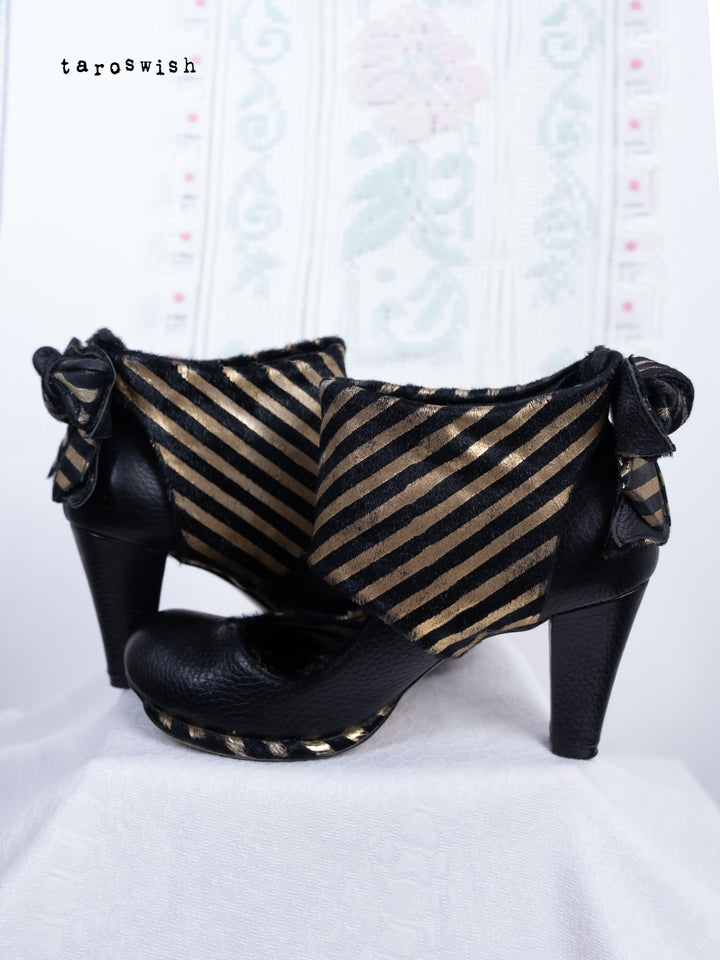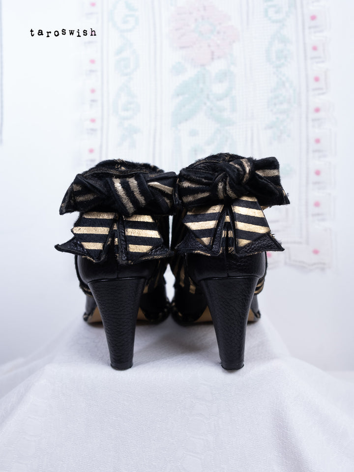 Black leather heels with metallic gold striped bow detail. Dramatic and playful party shoes.