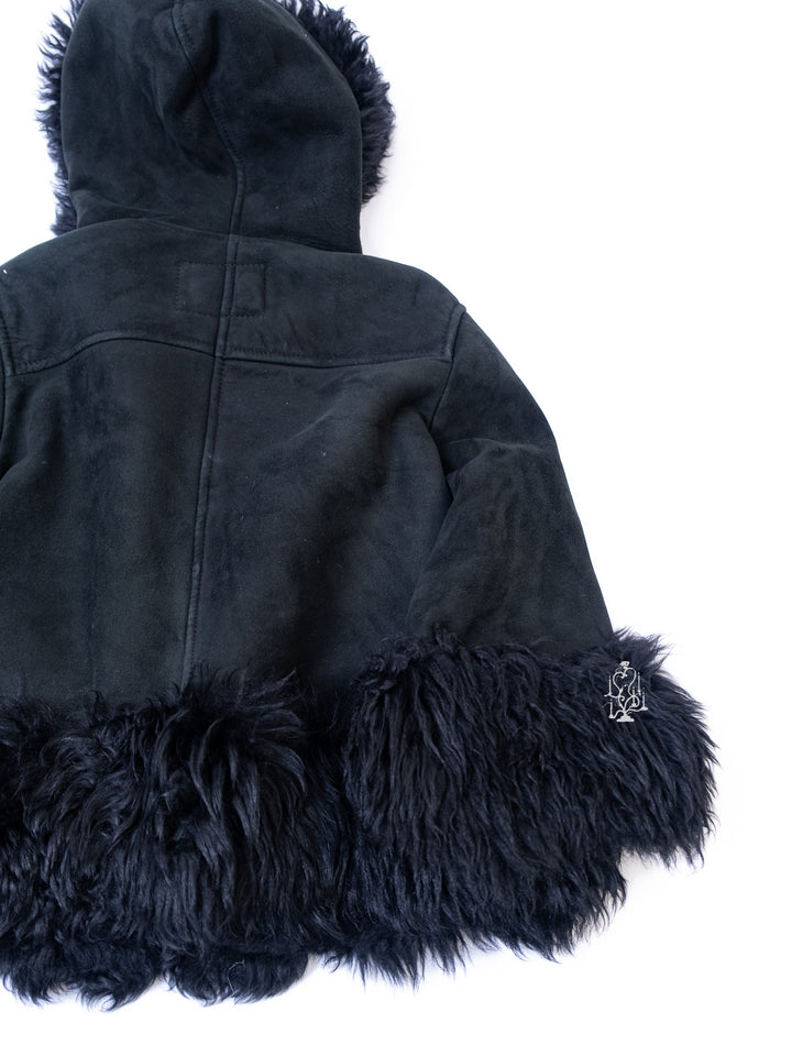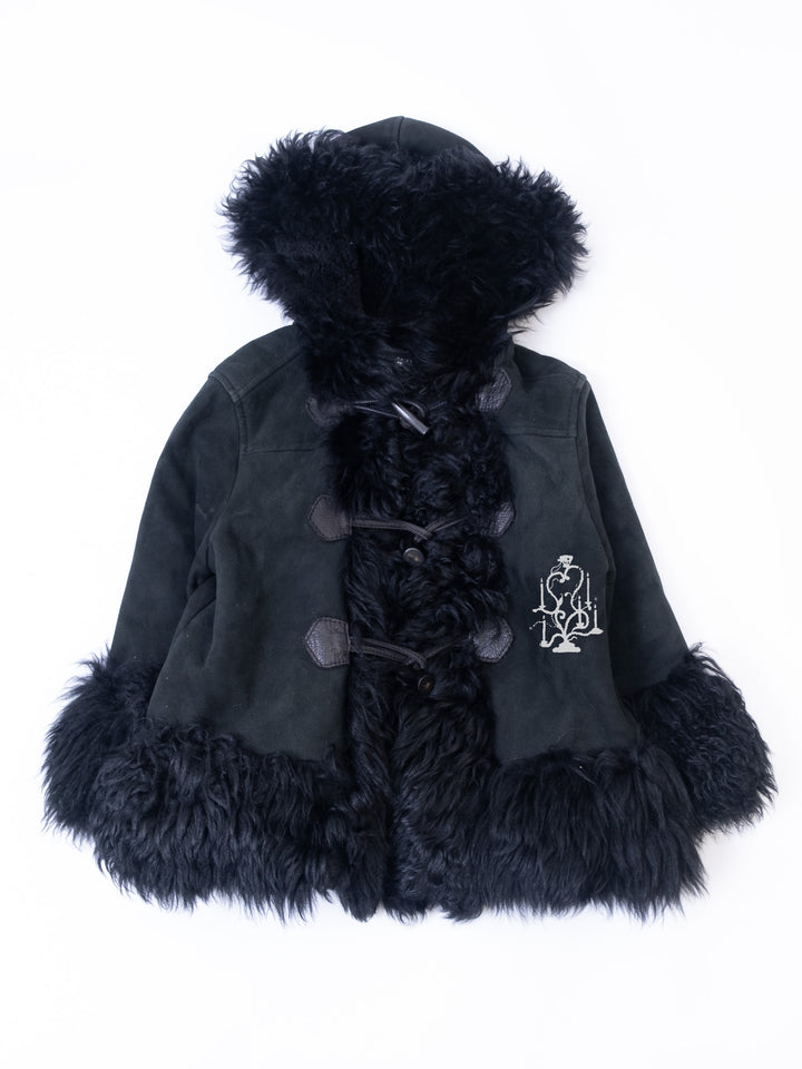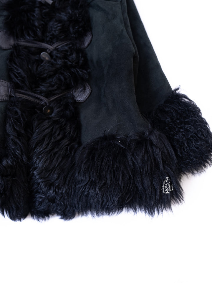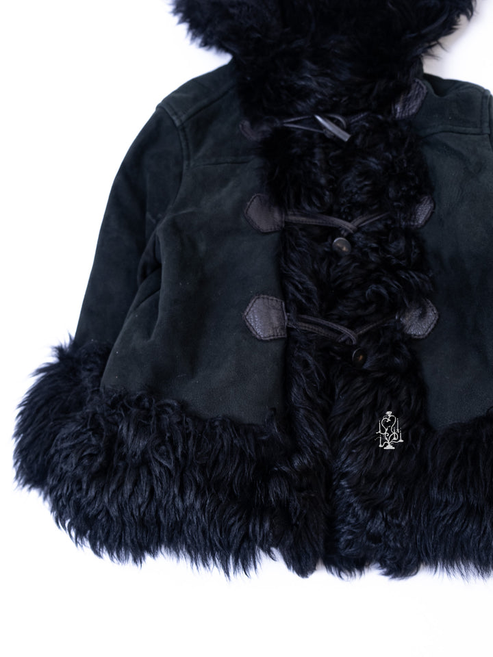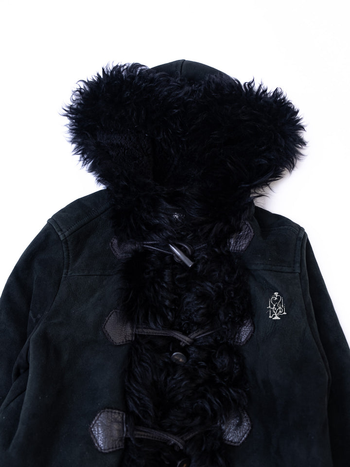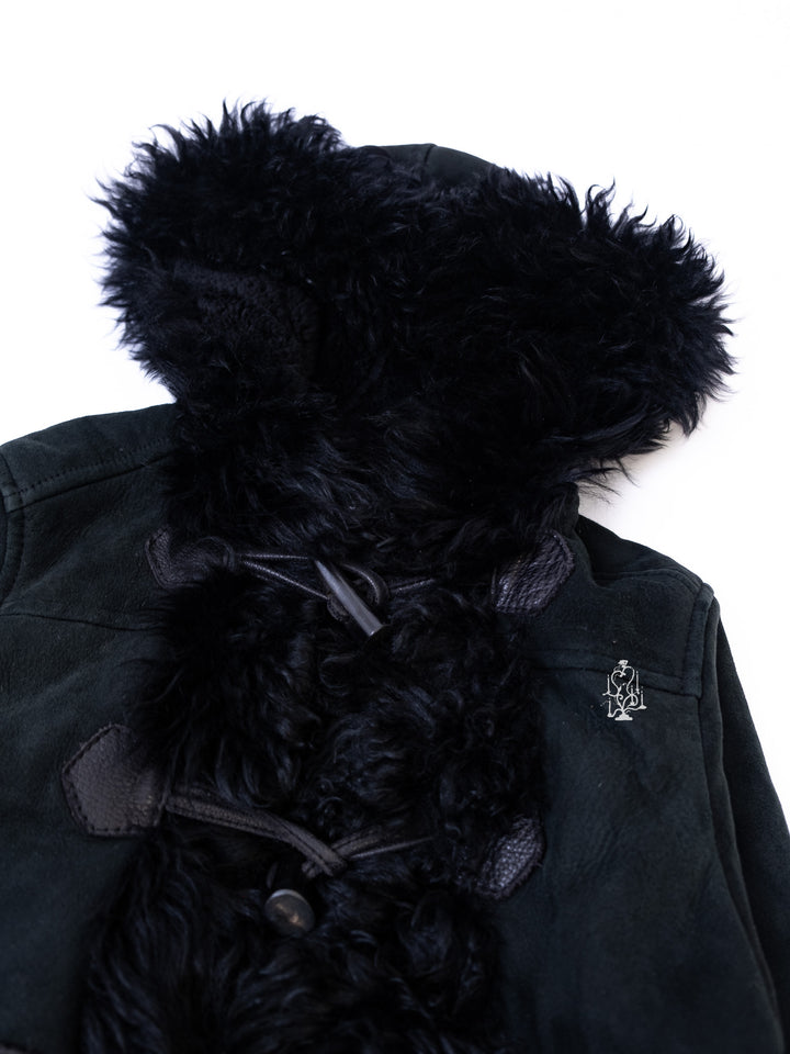 BLACK SHEARLING-TRIM HOODED TOGGLE COAT