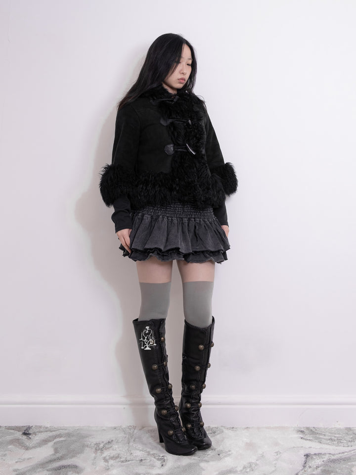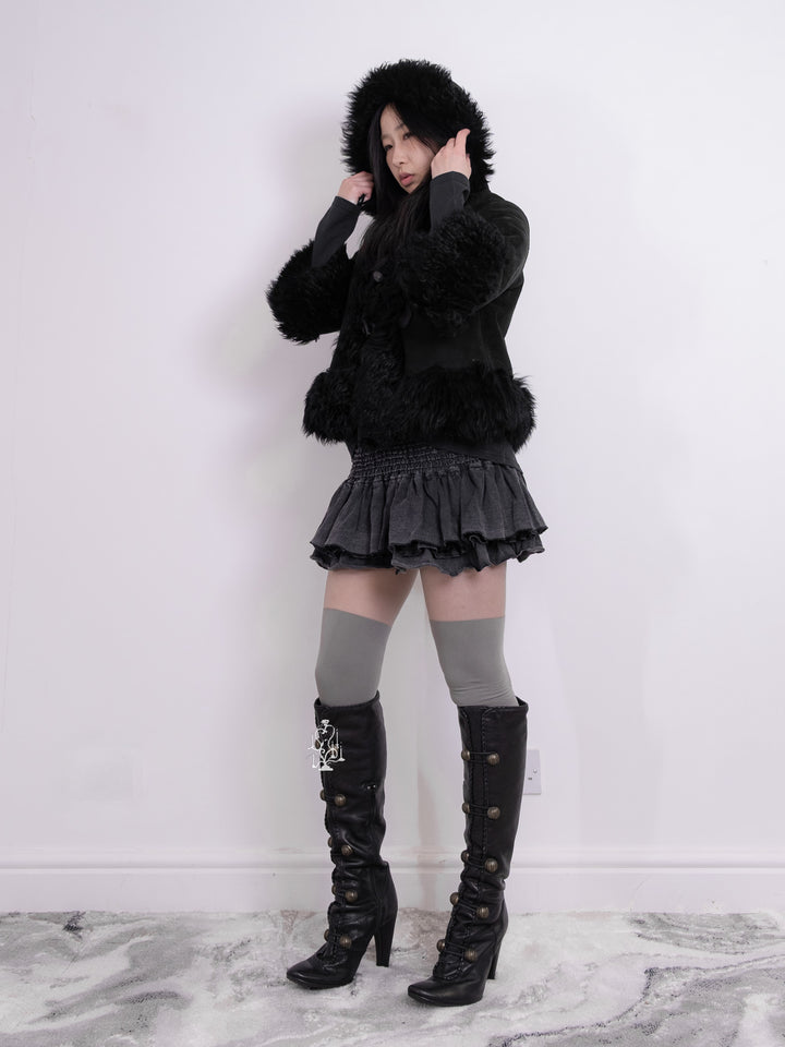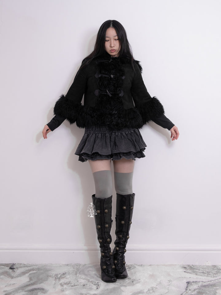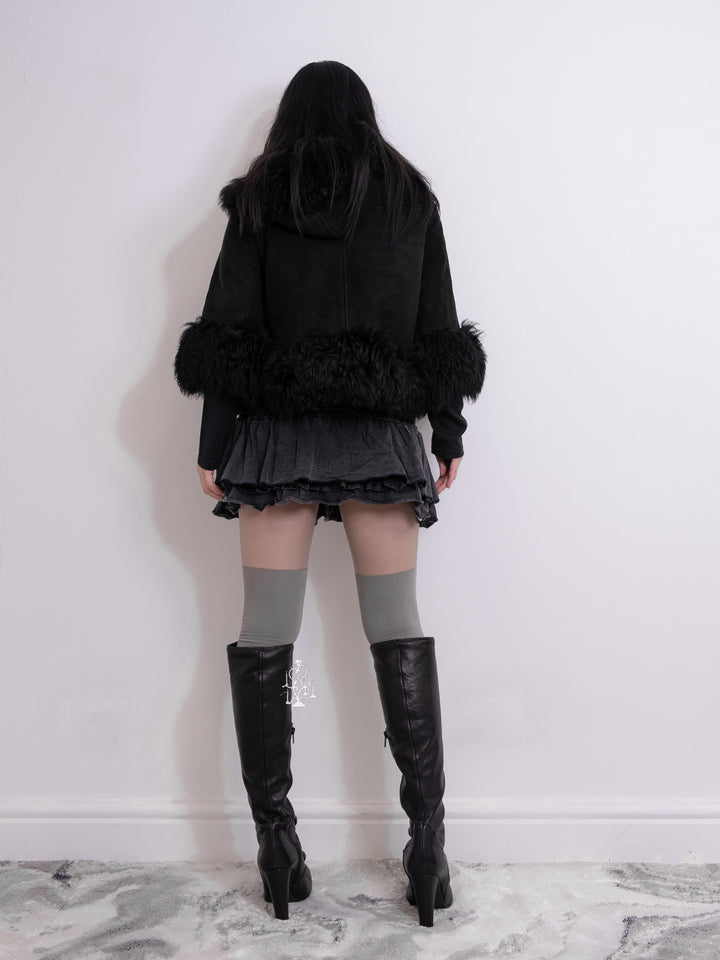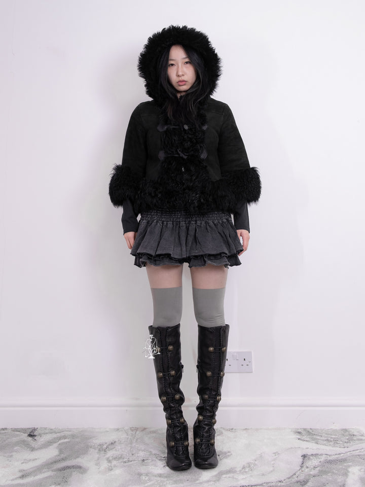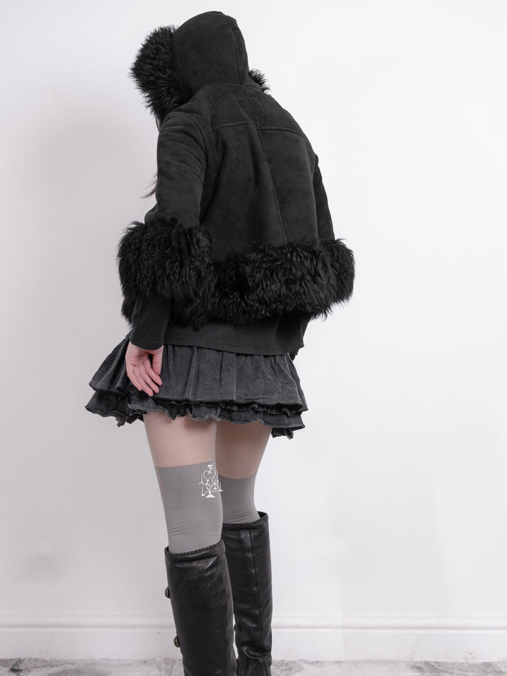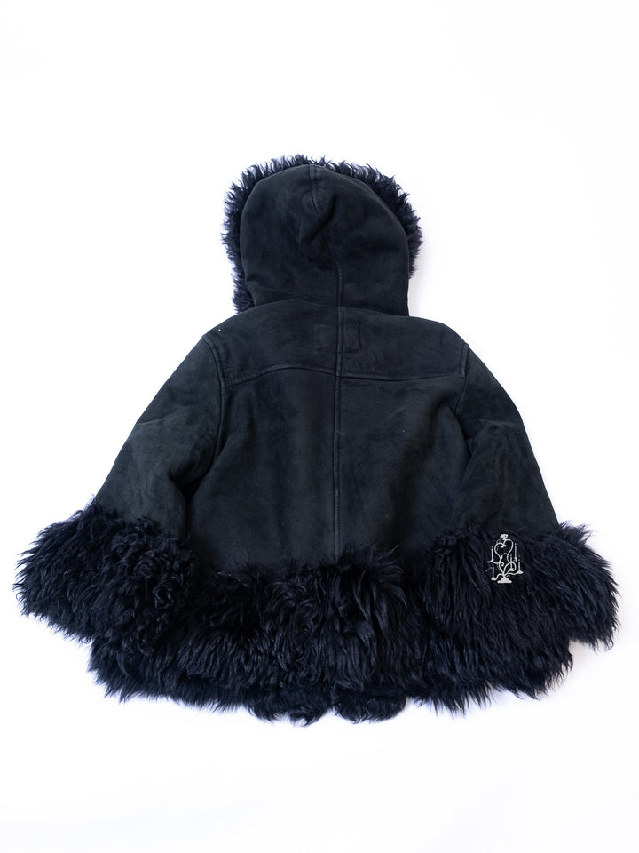 BLACK SHEARLING-TRIM HOODED TOGGLE COAT