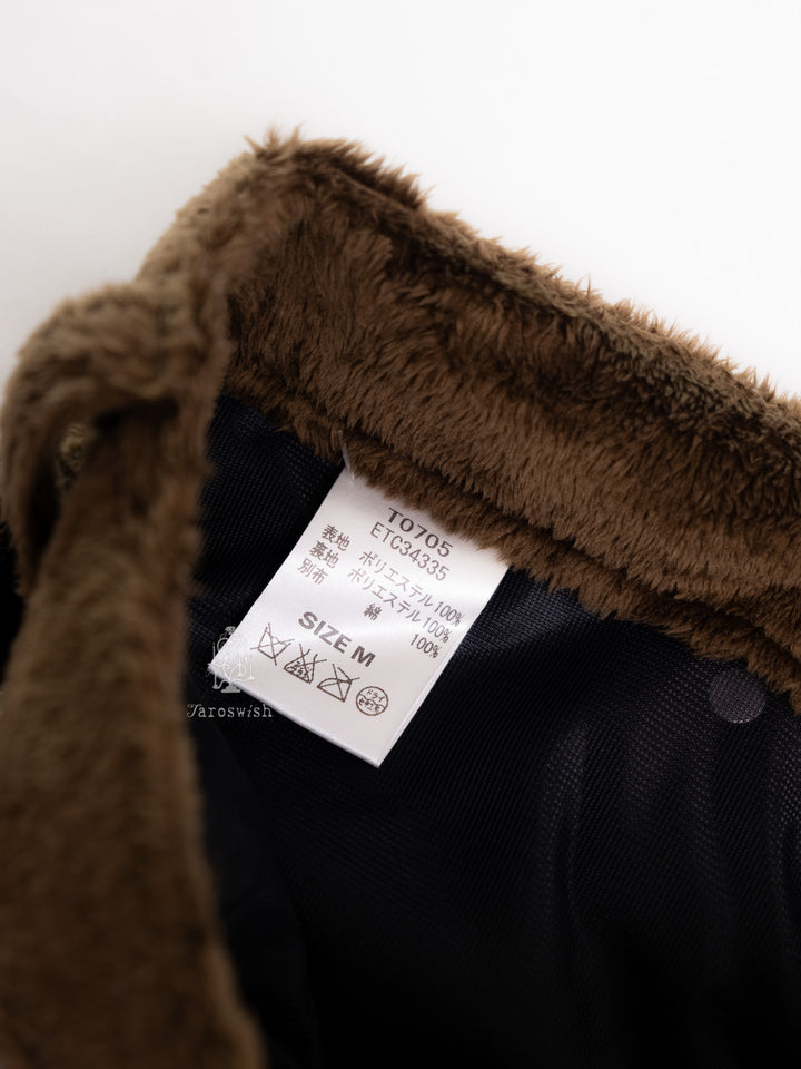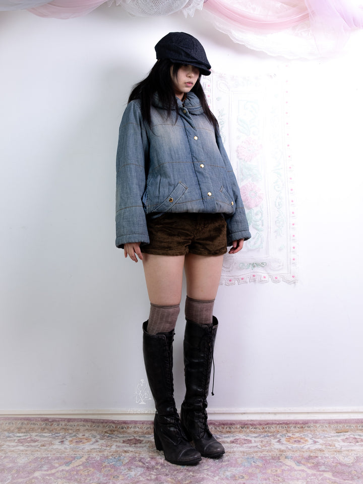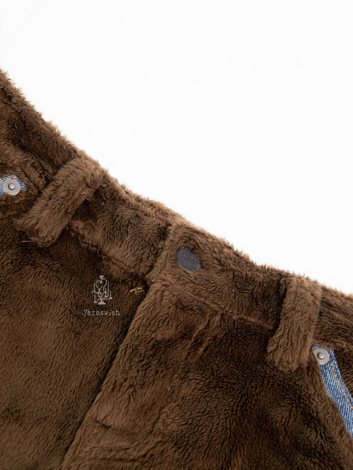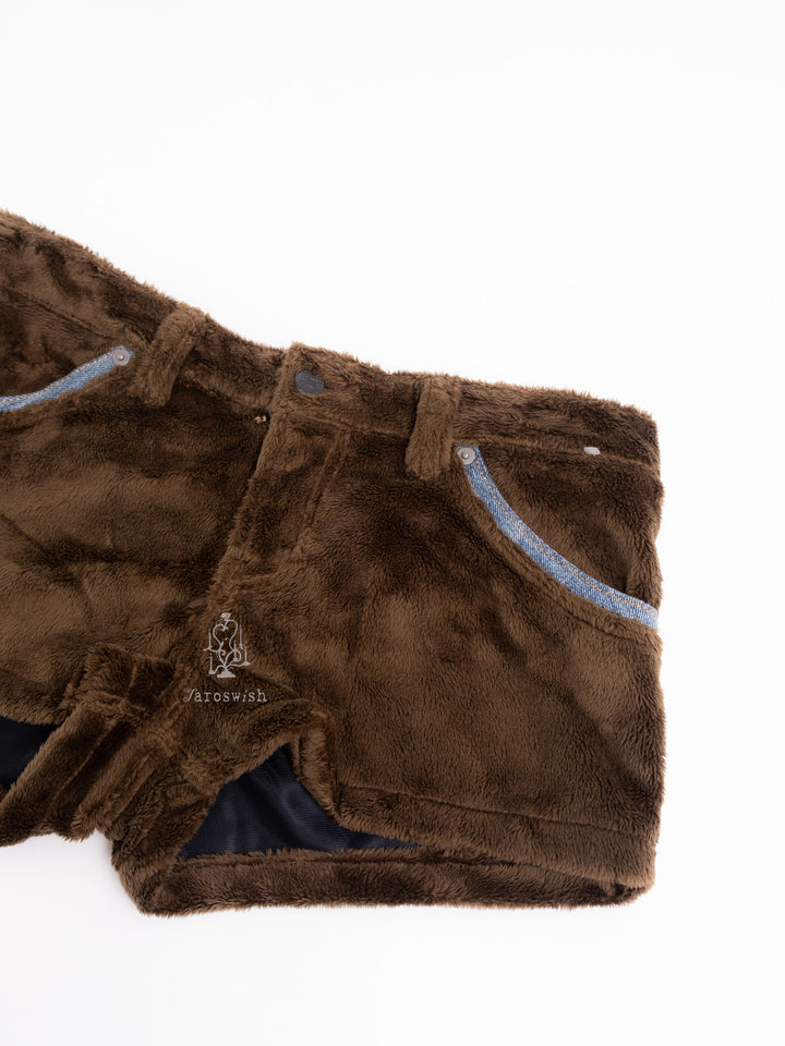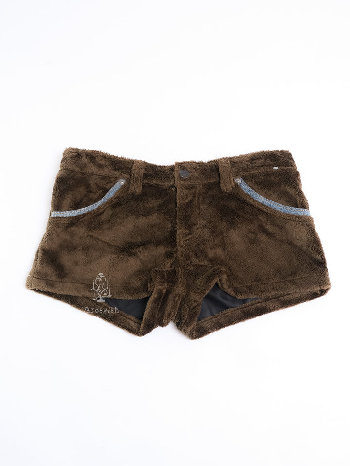 BROWN FAUX FUR SHORTS WITH DENIM POCKETS