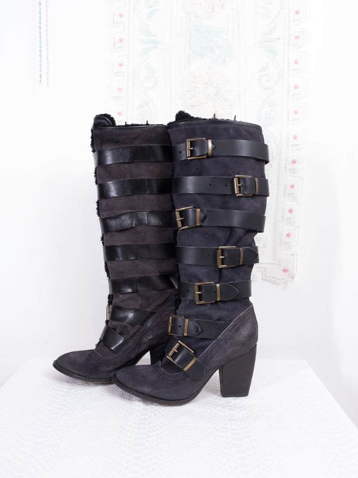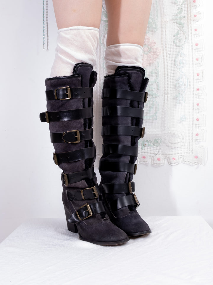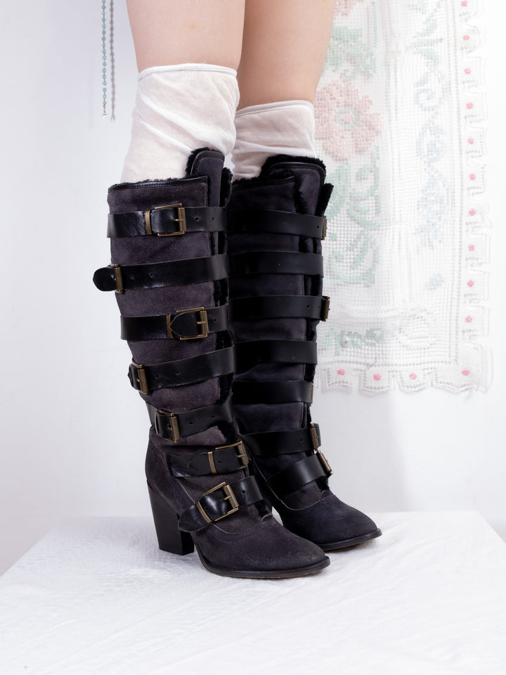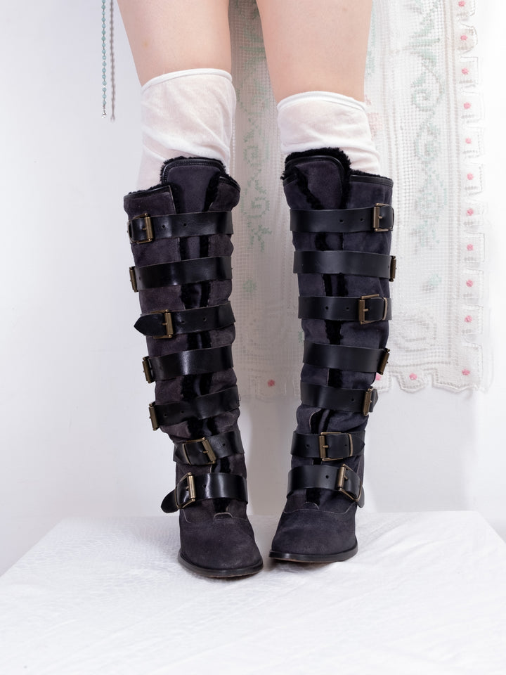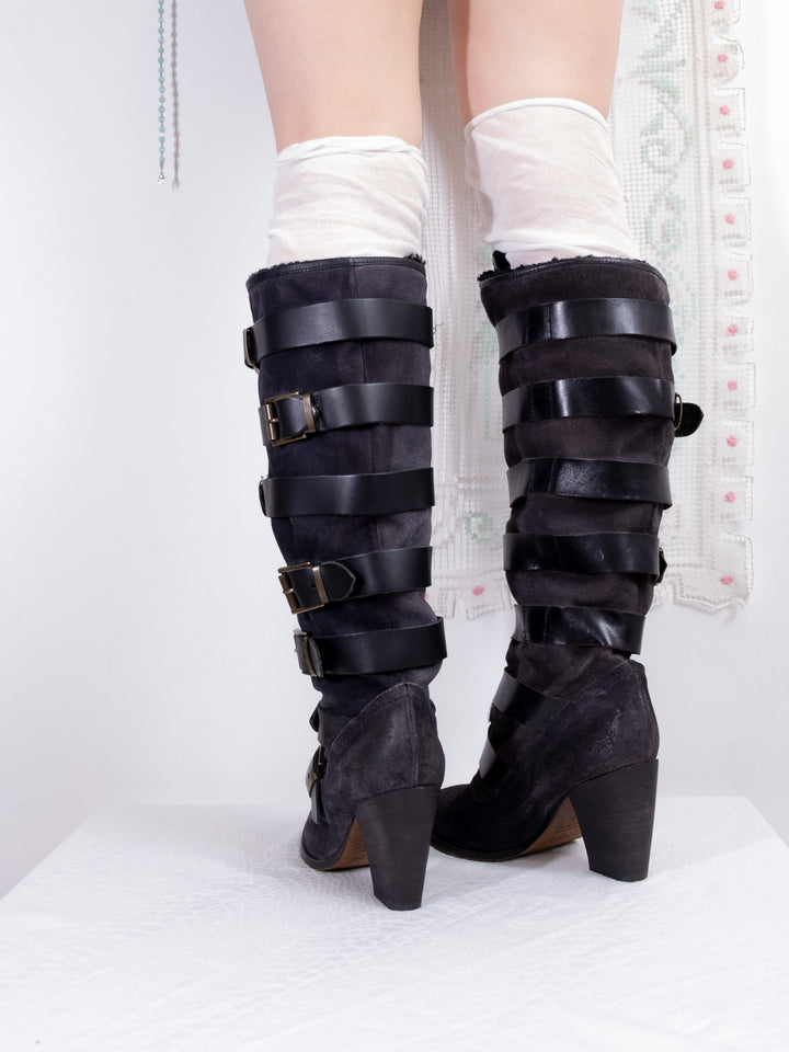 EU38 BLACK STRAP BUCKLE KNEE HIGH BOOTS
