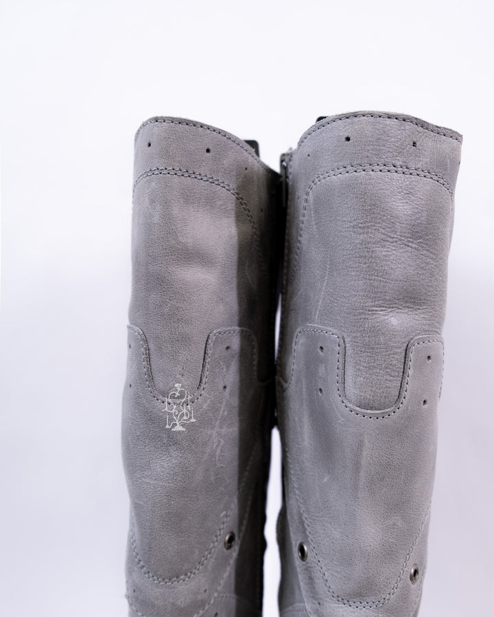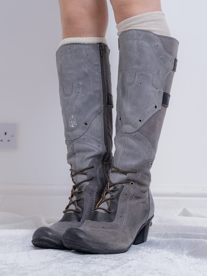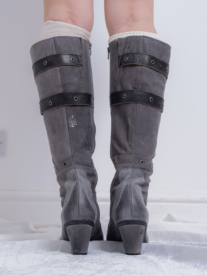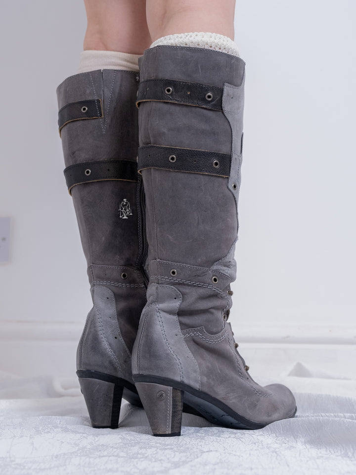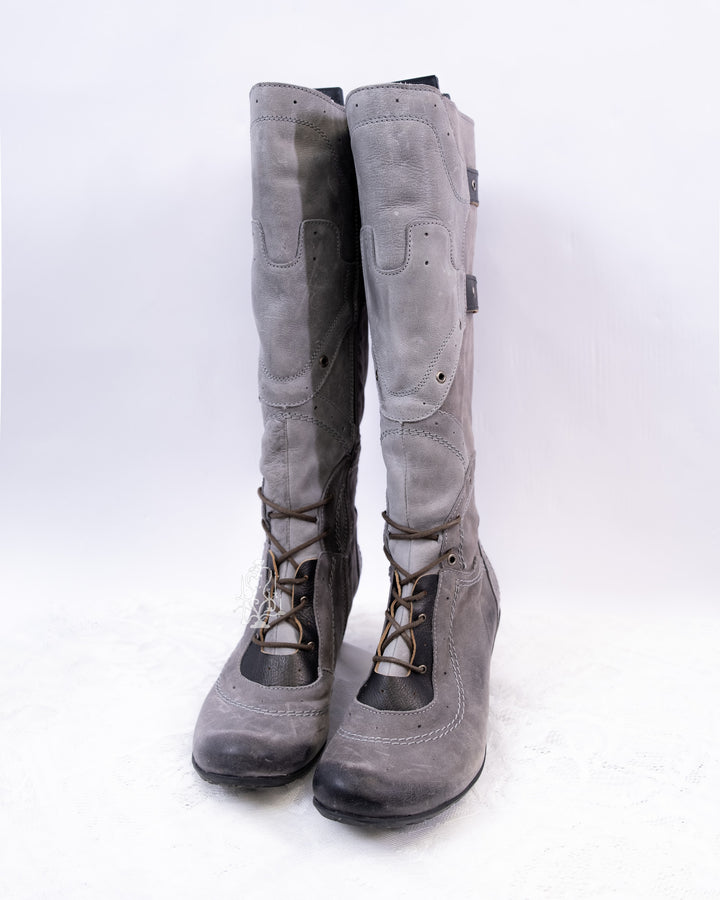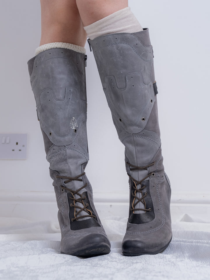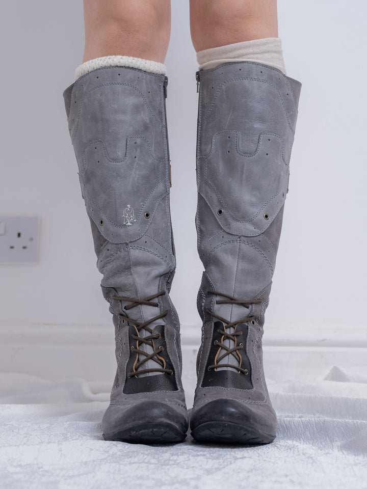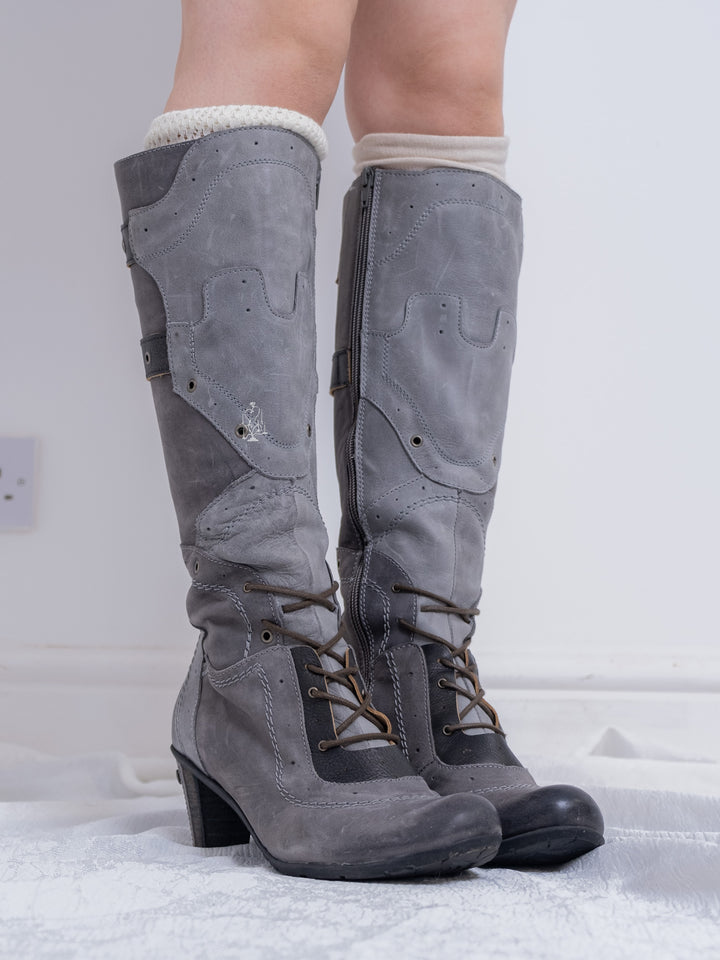 EU39 GREY PATCHWORK LACE-UP TALL BOOTS