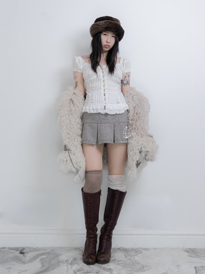 White ruffle-trim peasant blouse with pleated front and fabric buttons.