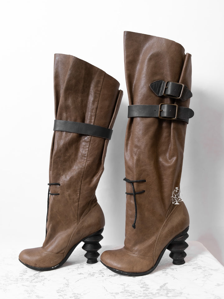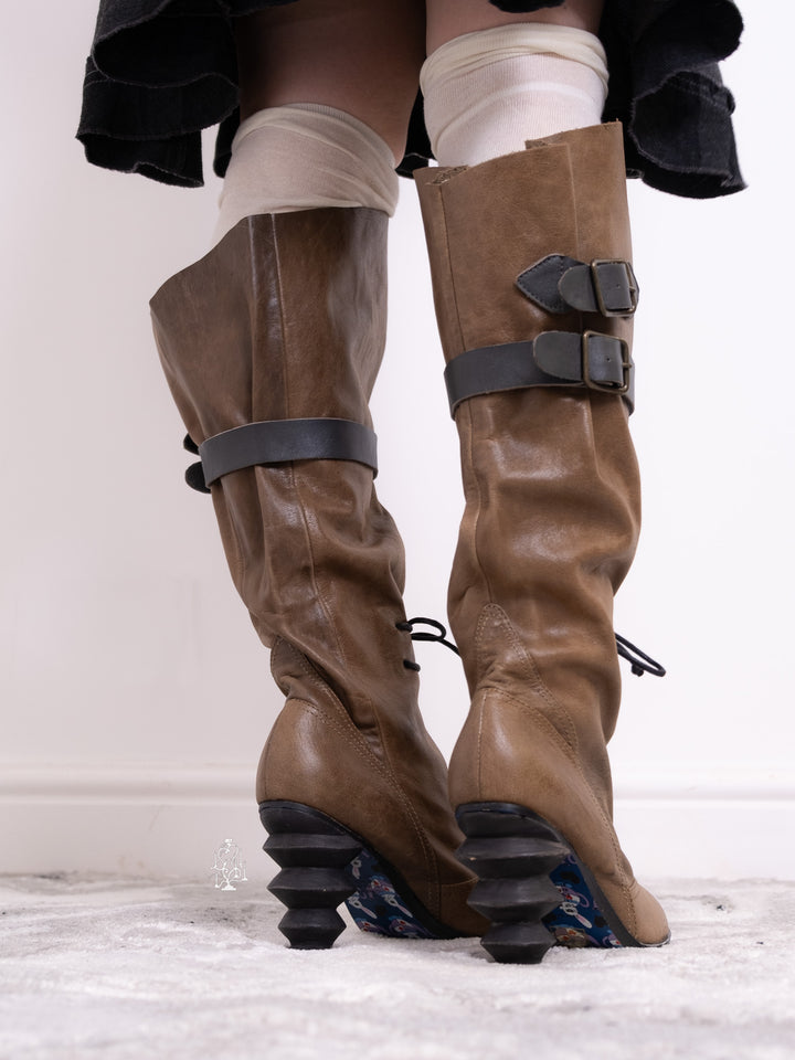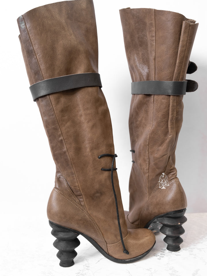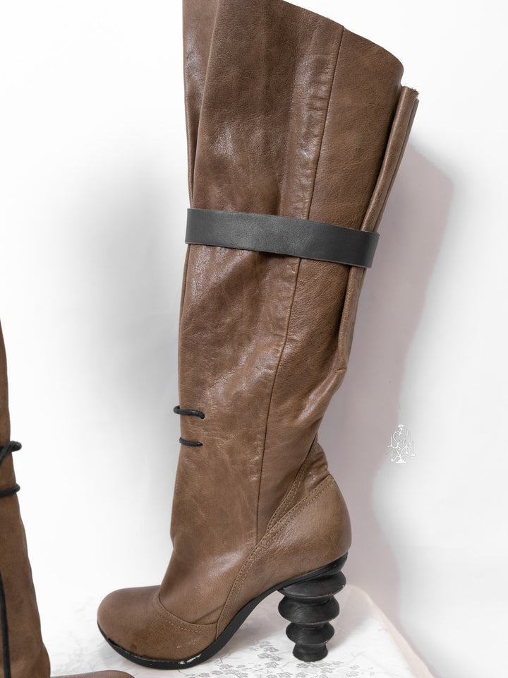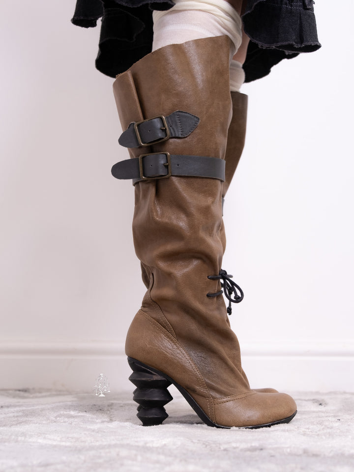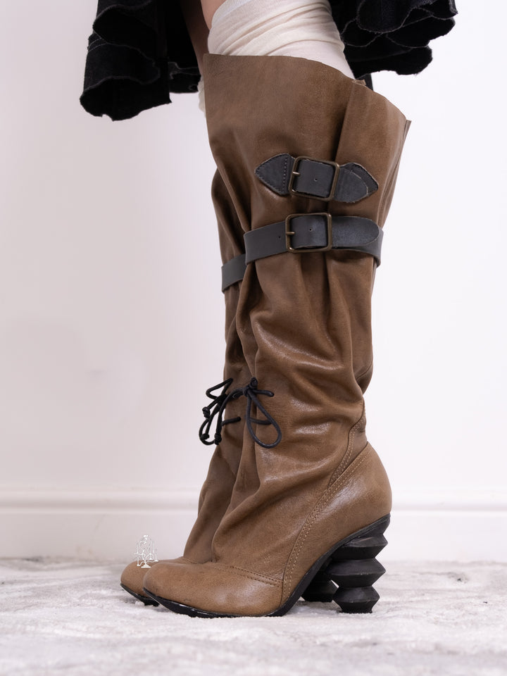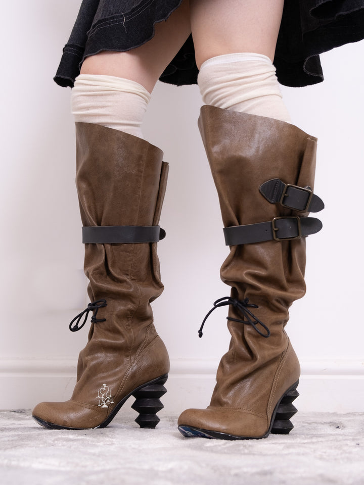 EU36 KHAKI SCULPTURAL-HEEL BUCKLE TALL BOOTS