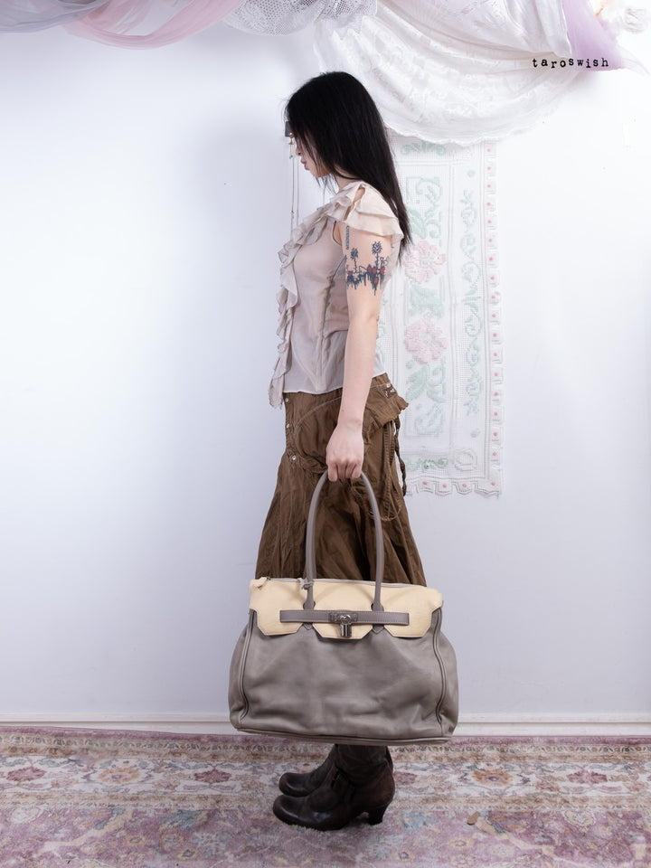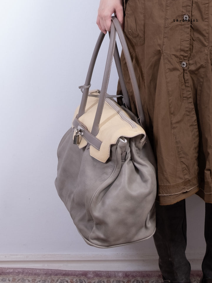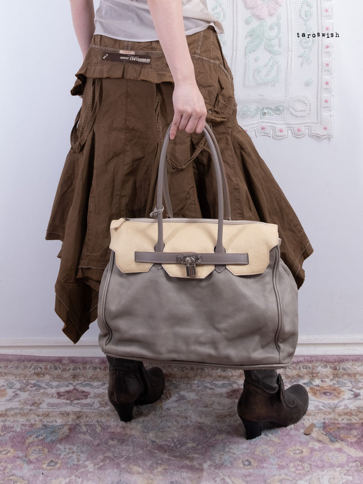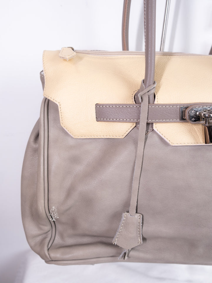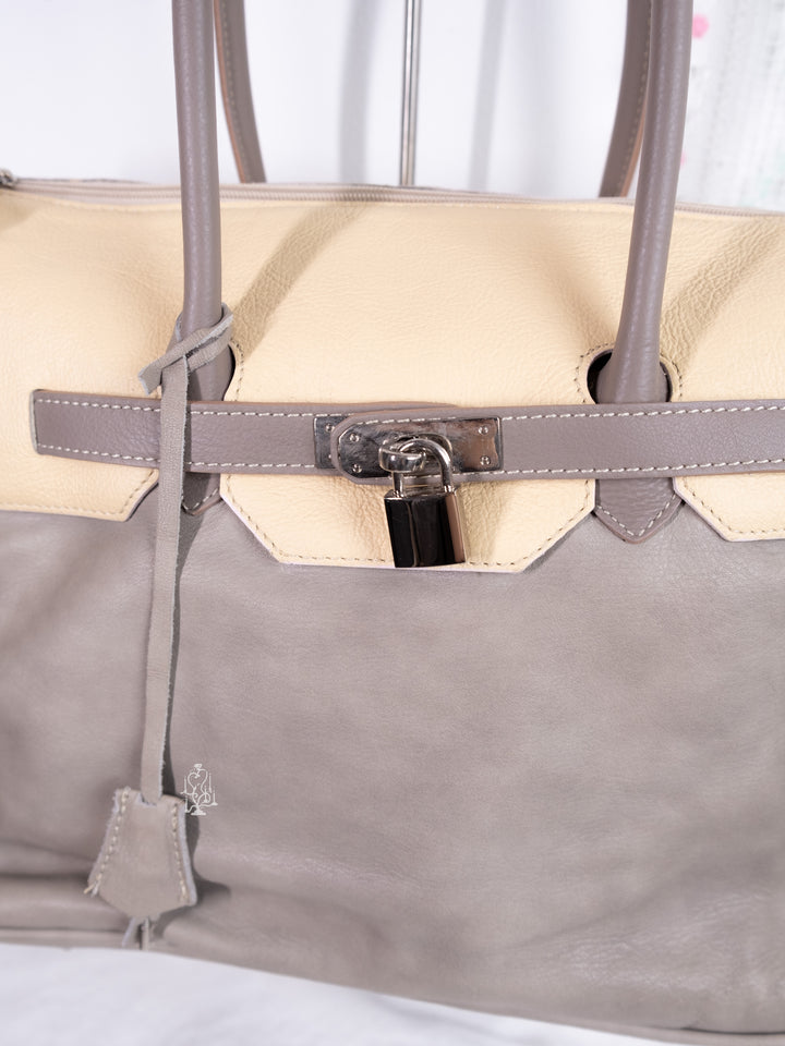 Beige and grey panelled leather tote bag with lock accent and classic structured silhouette. Timeless and practical.