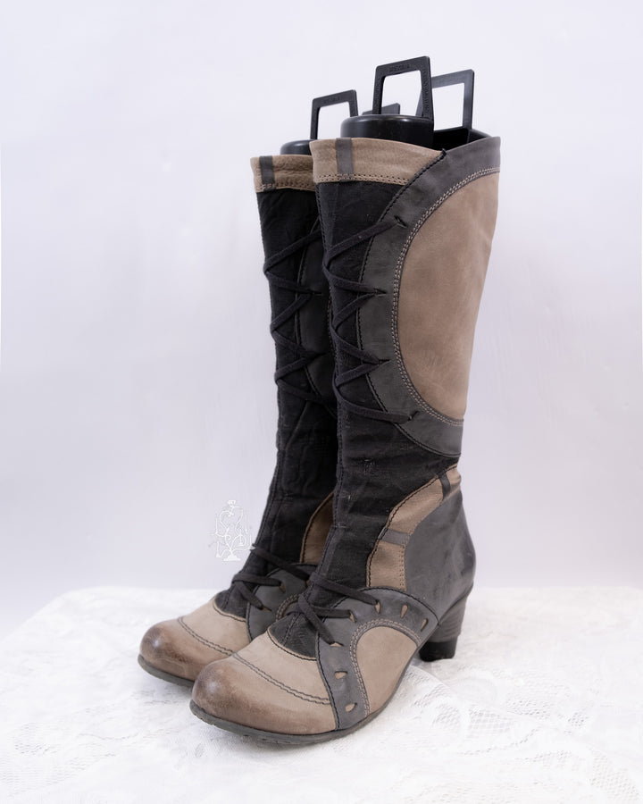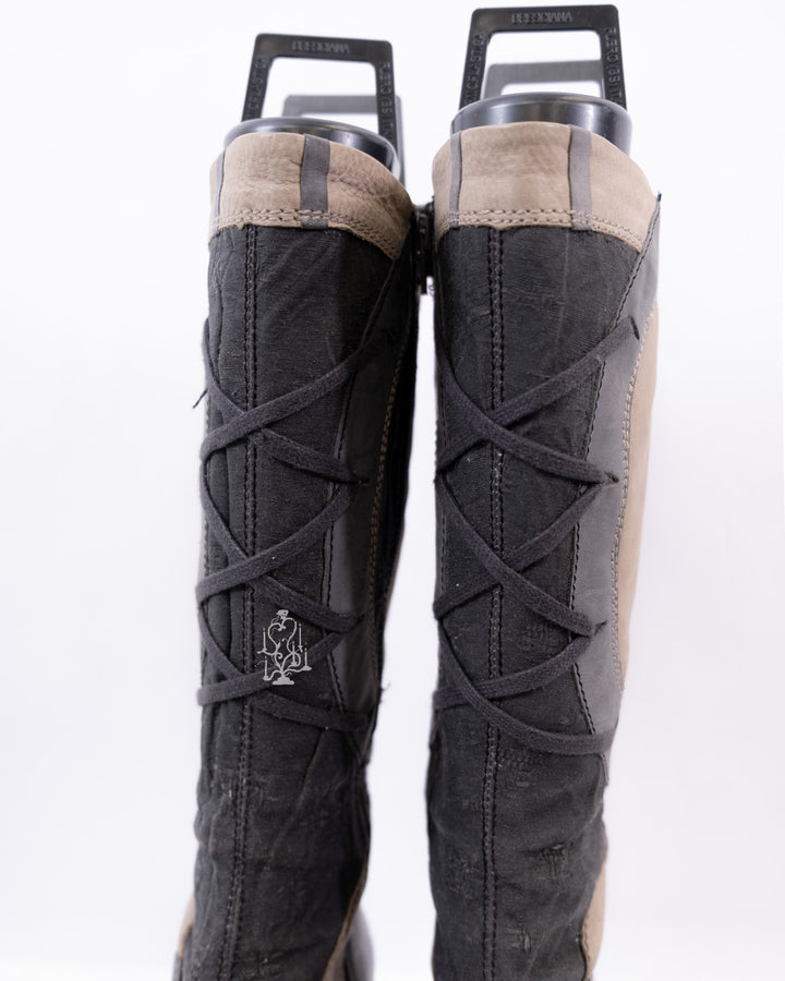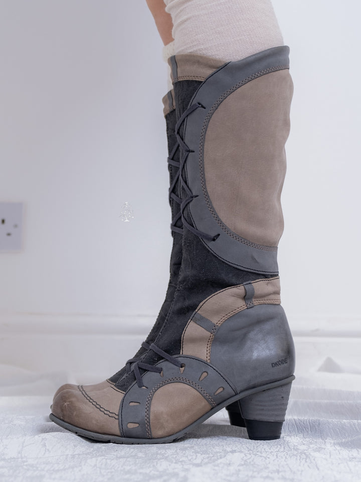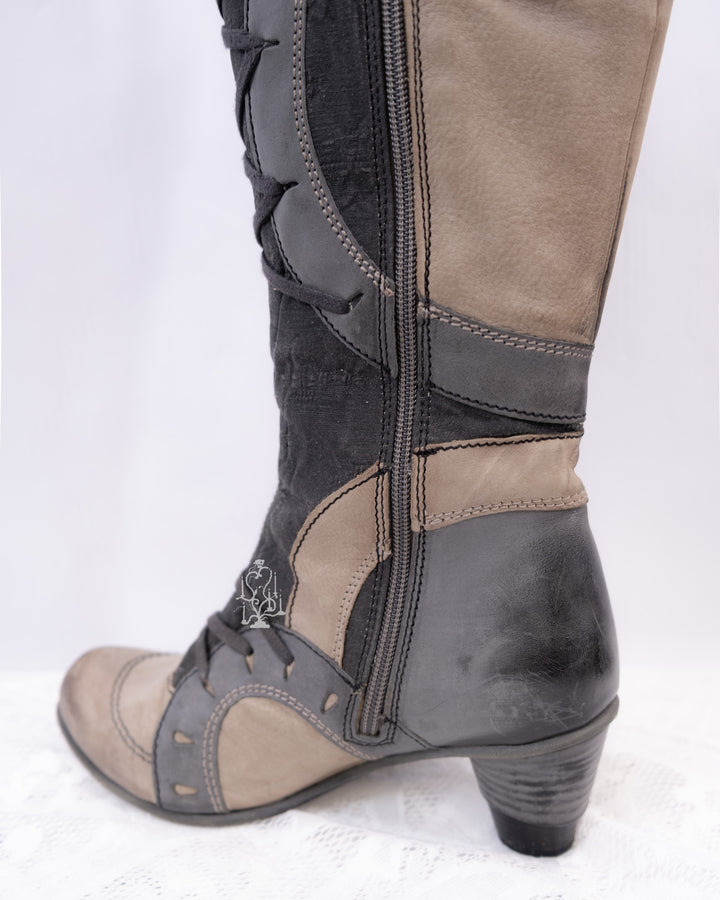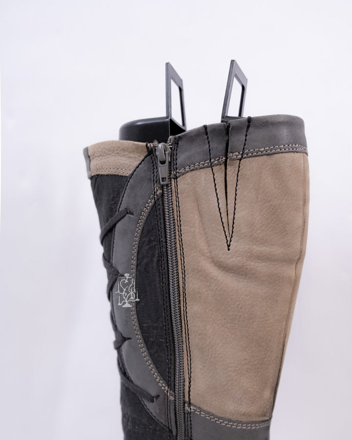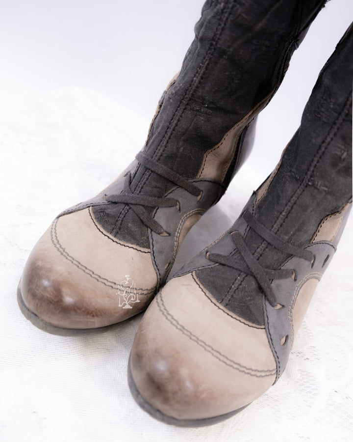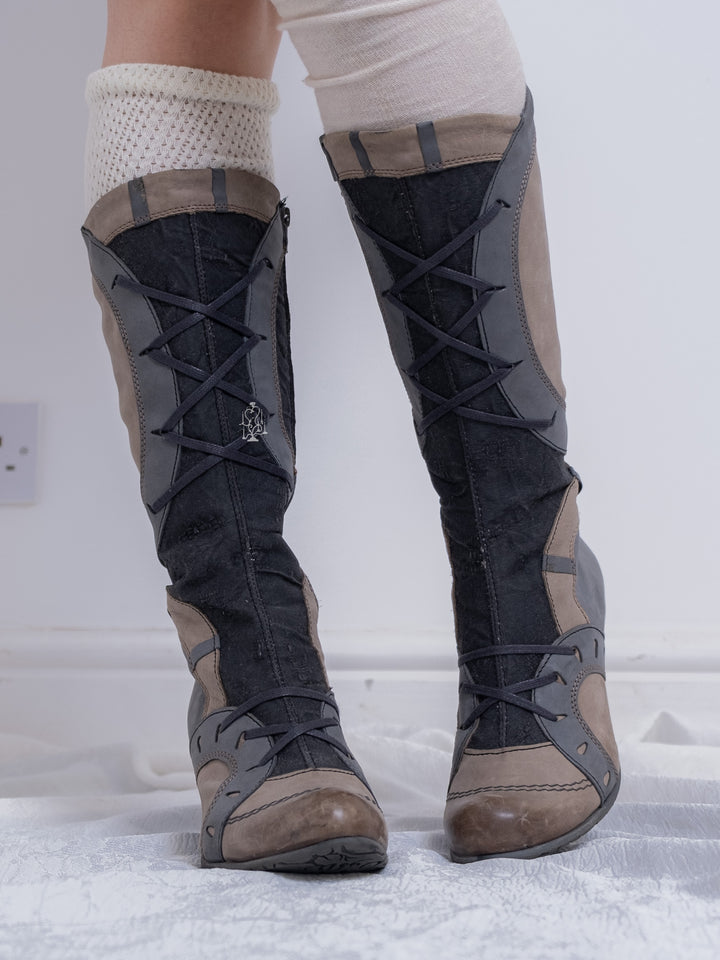 EU37 TWO-TONE PATCHWORK LACE-UP MID CALF BOOTS