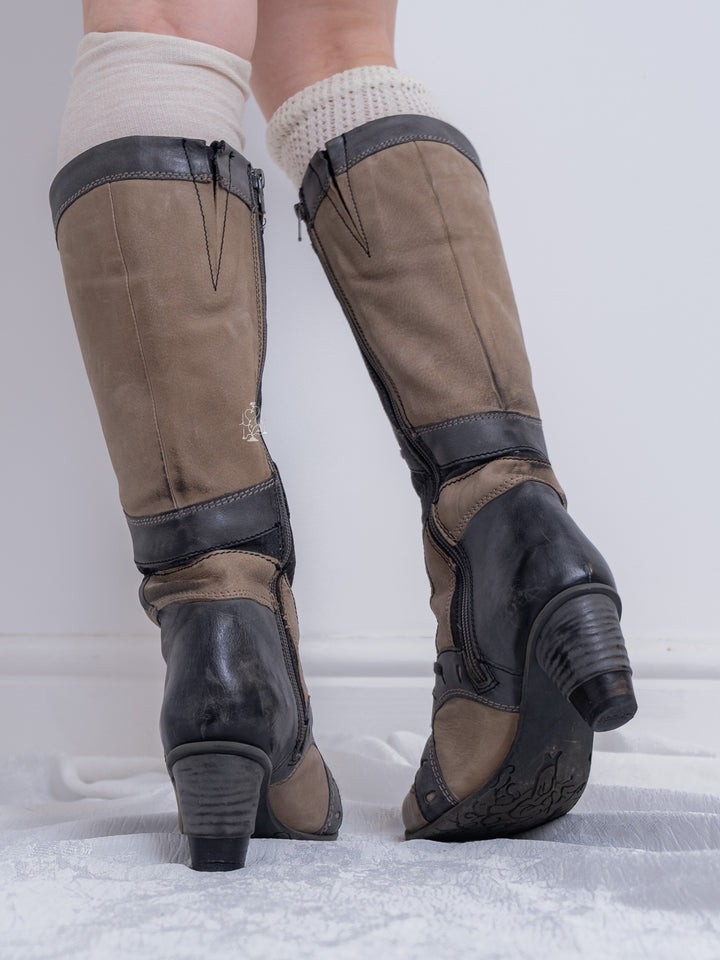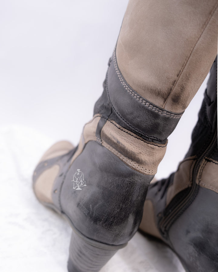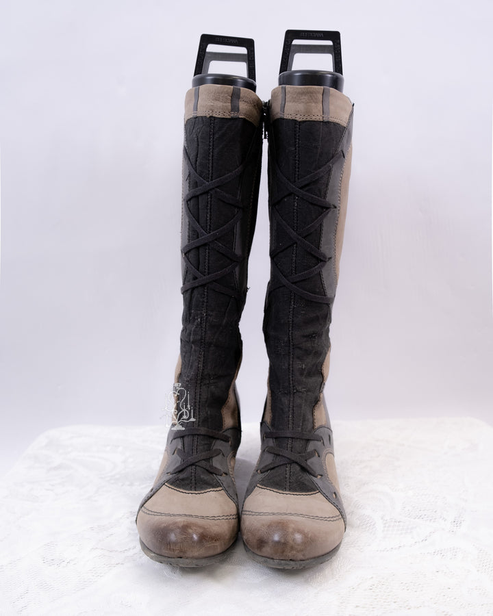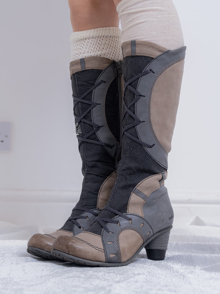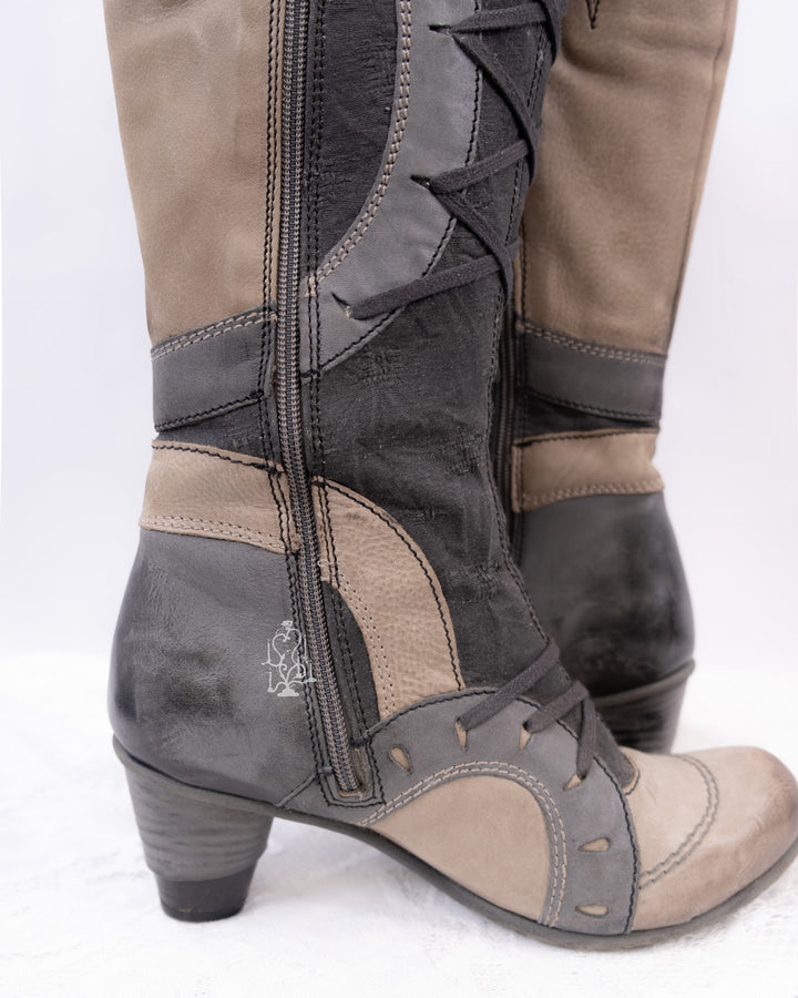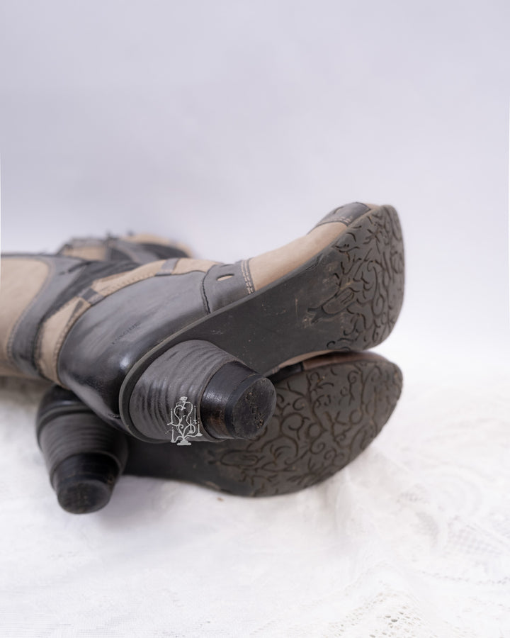 EU37 TWO-TONE PATCHWORK LACE-UP MID CALF BOOTS