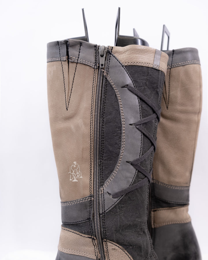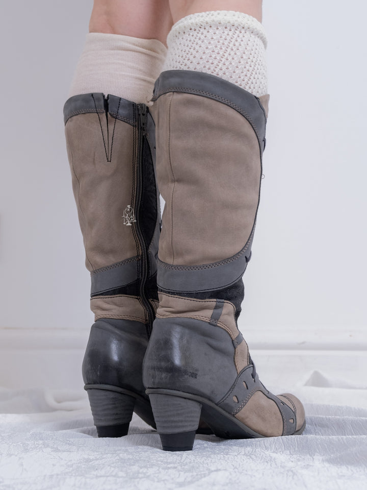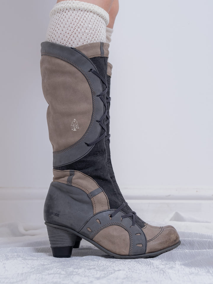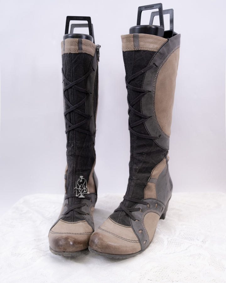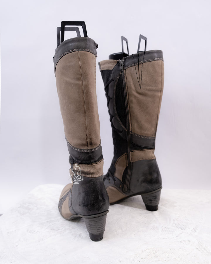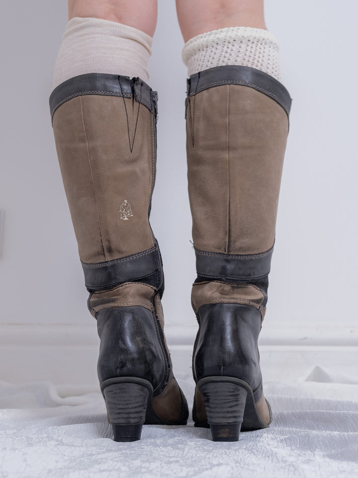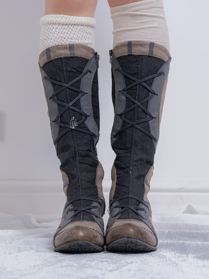 EU37 TWO-TONE PATCHWORK LACE-UP MID CALF BOOTS