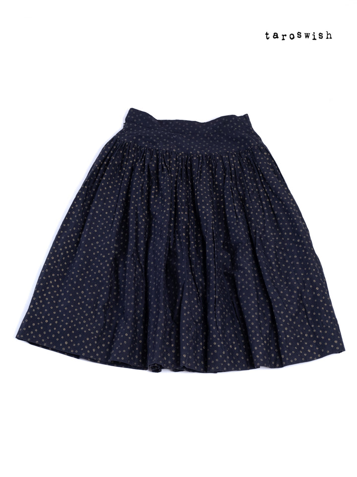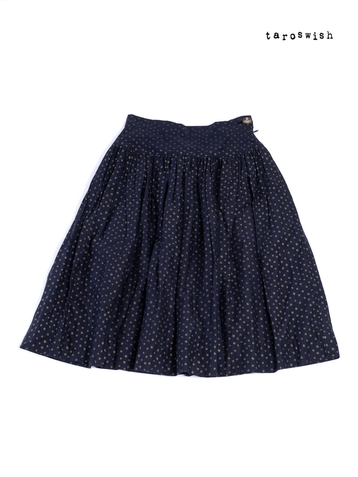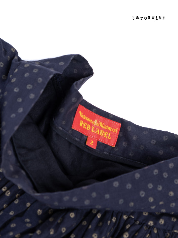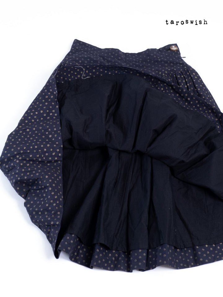 Classic navy blue Vivienne Westwood skirt with gold mini dot pattern. High-waisted and voluminous silhouette.