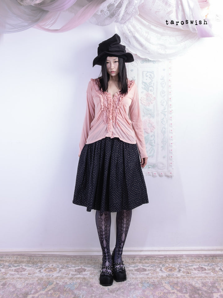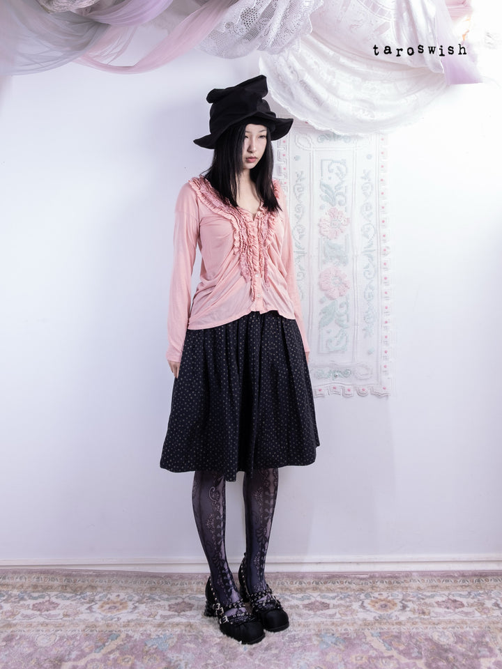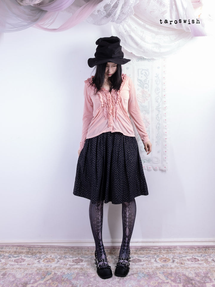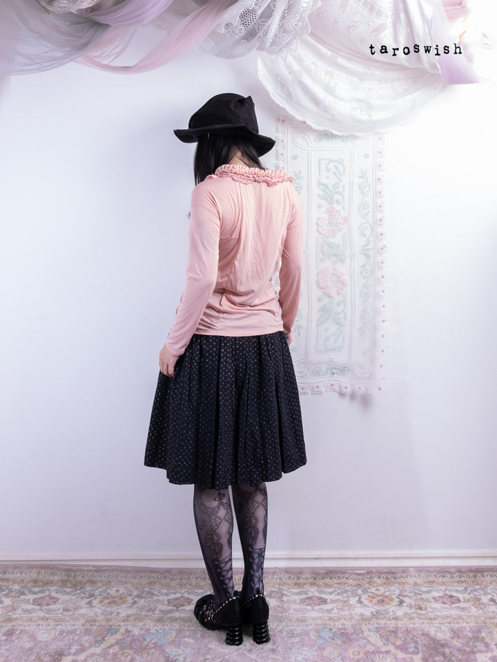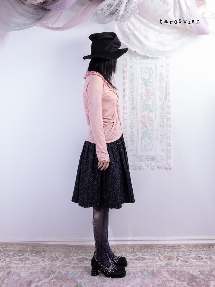 Classic navy blue Vivienne Westwood skirt with gold mini dot pattern. High-waisted and voluminous silhouette.