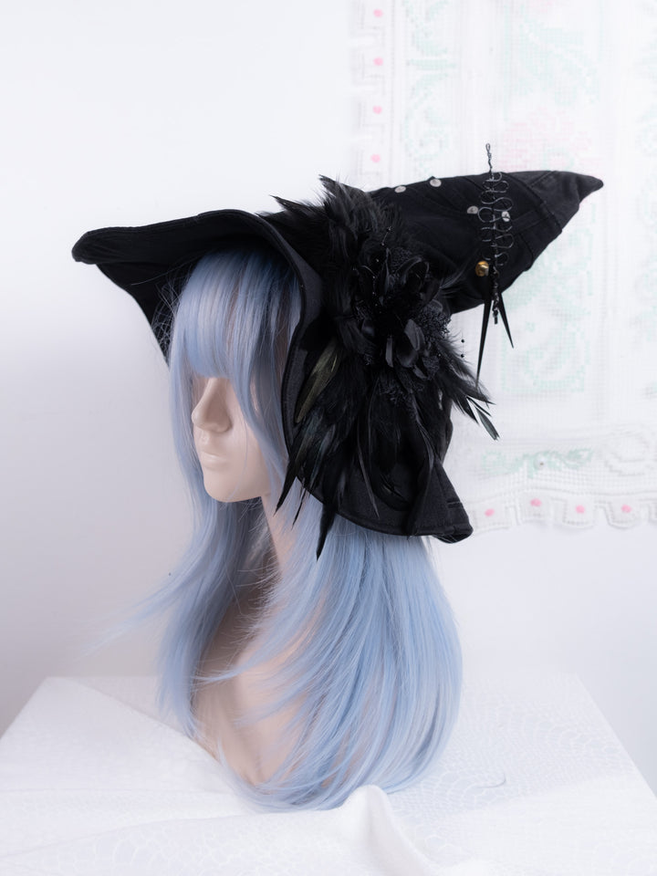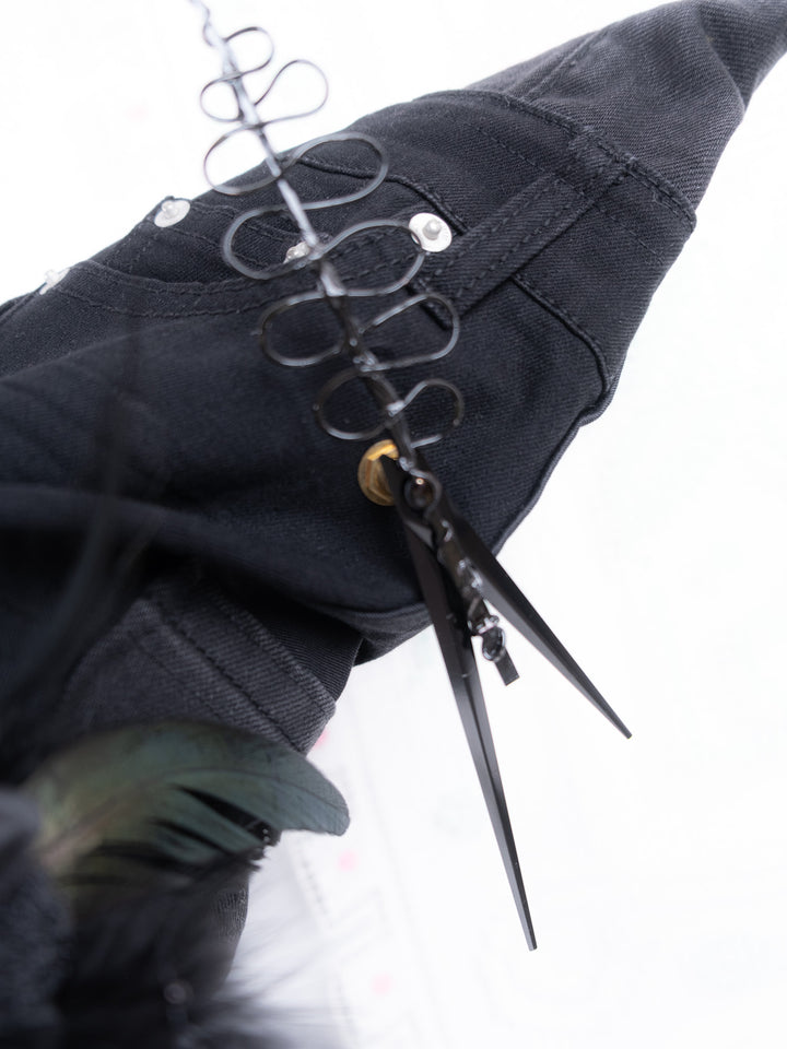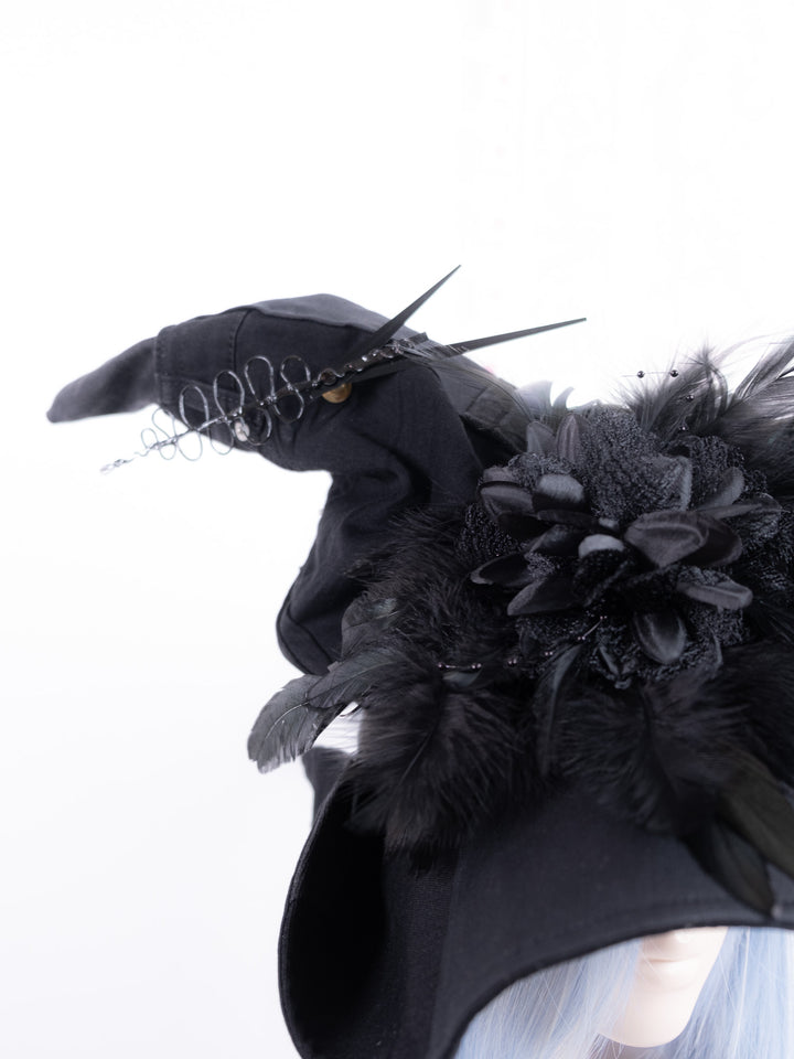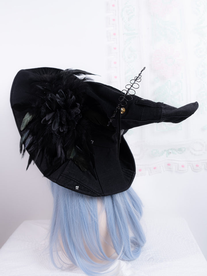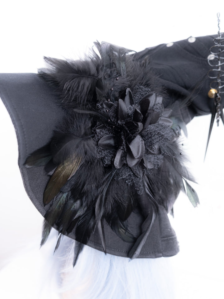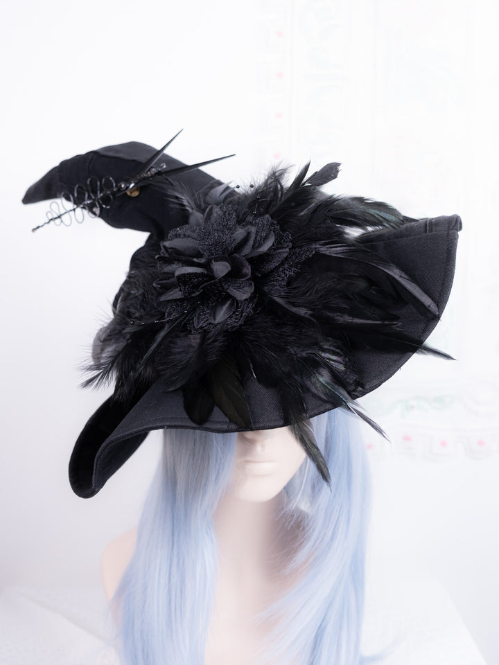 Witch hat with feather and floral decorations, detailed with a metal clock-hand ornament.