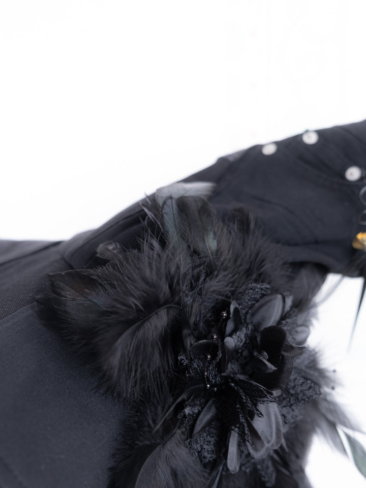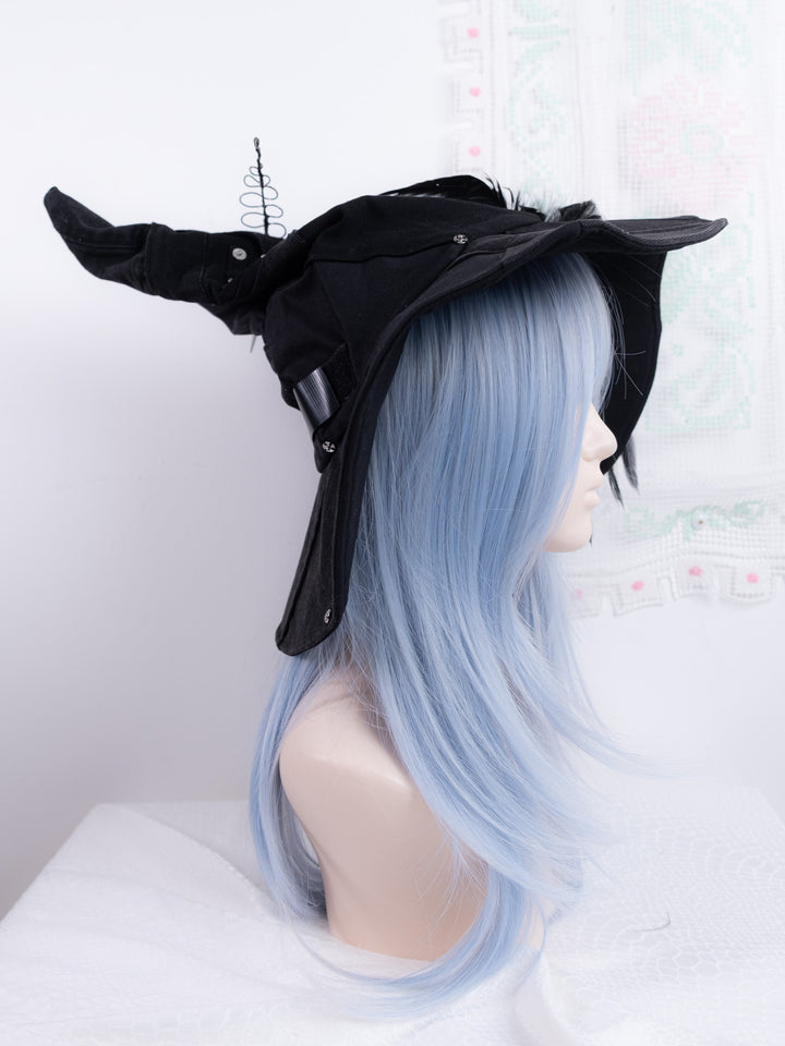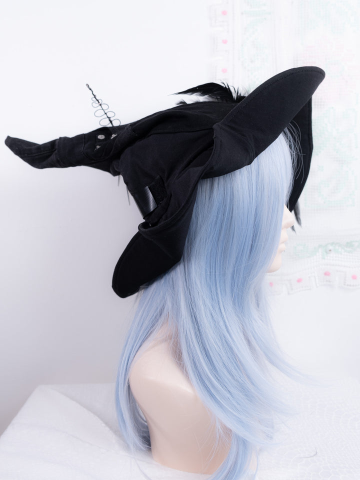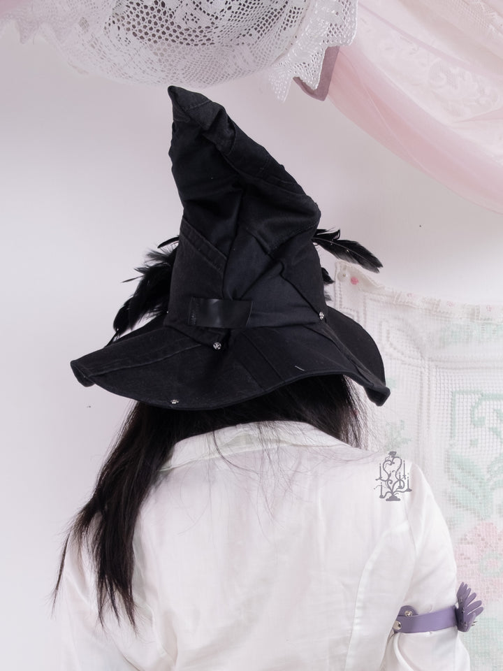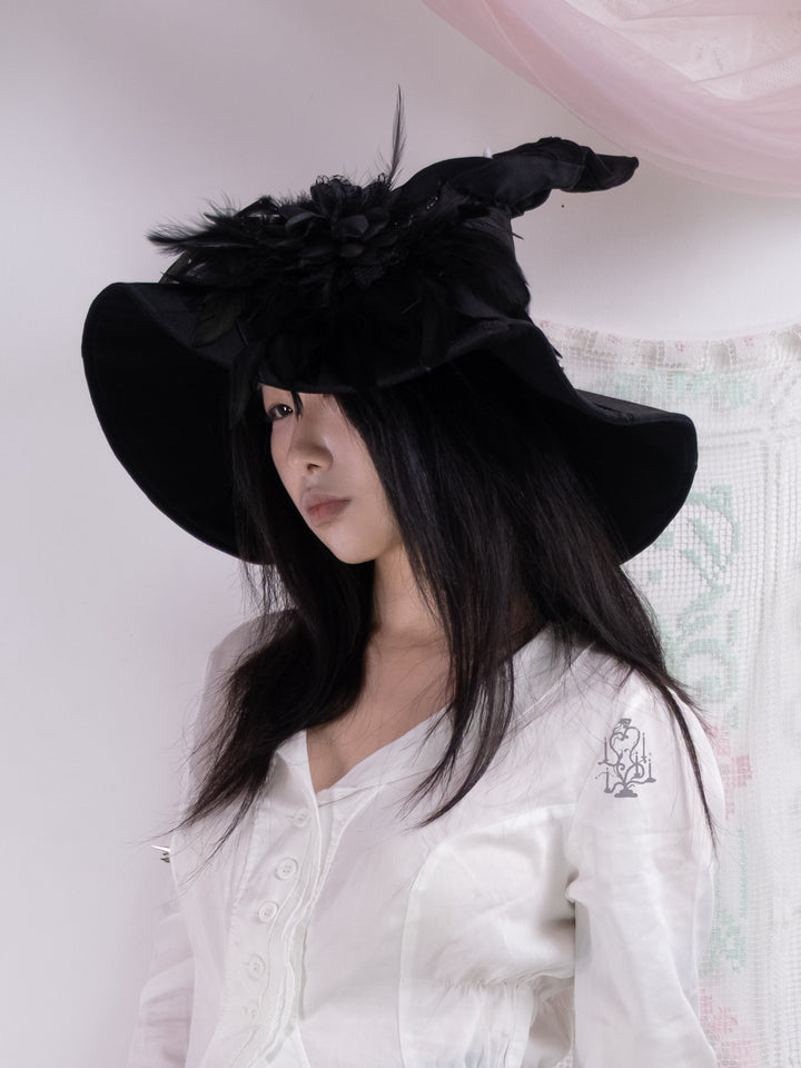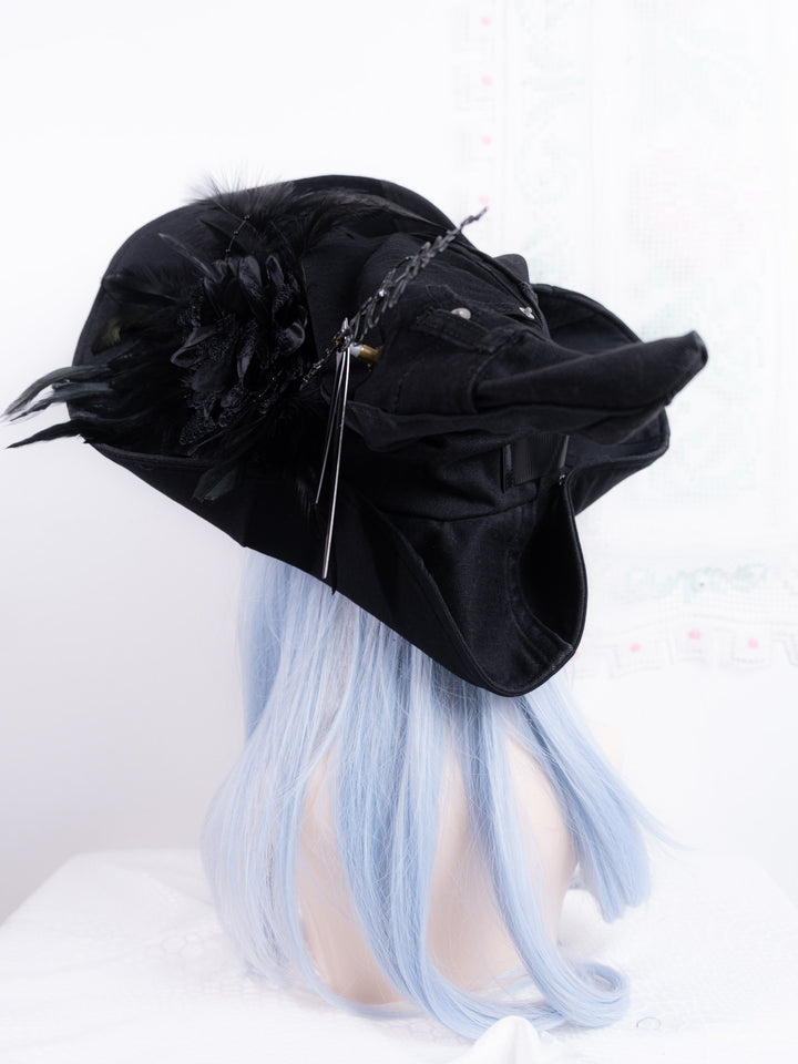 Witch hat with feather and floral decorations, detailed with a metal clock-hand ornament.