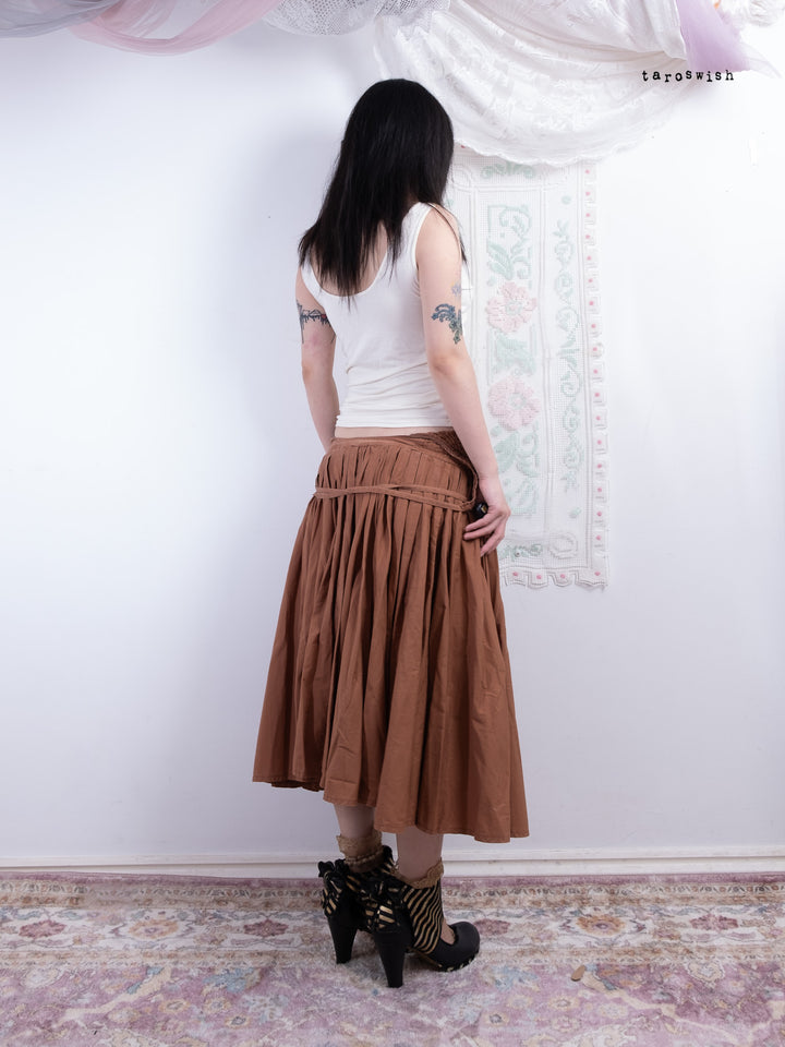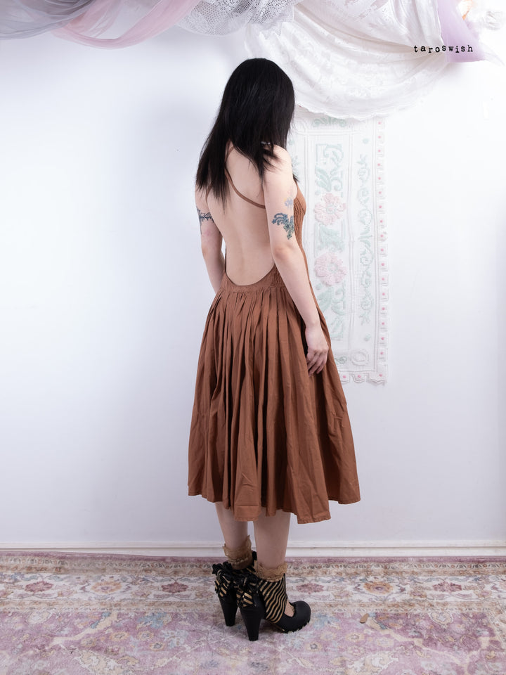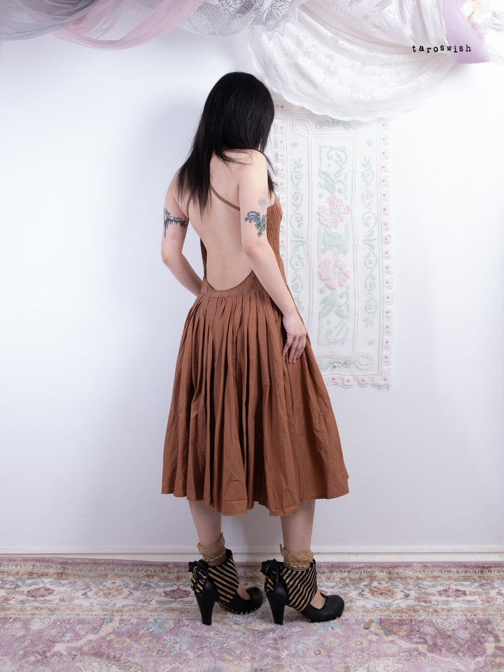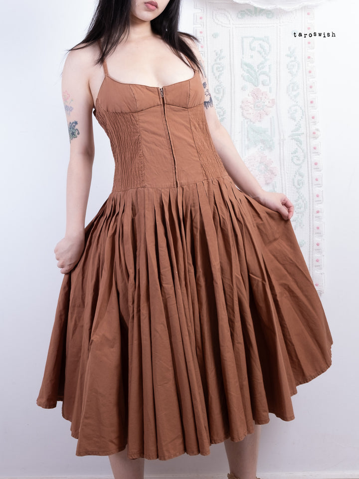 Late 80s French designer Guy Paulin piece. Structured cocoa midi dress with ruched side panels, crisscross straps, and full pleated skirt.