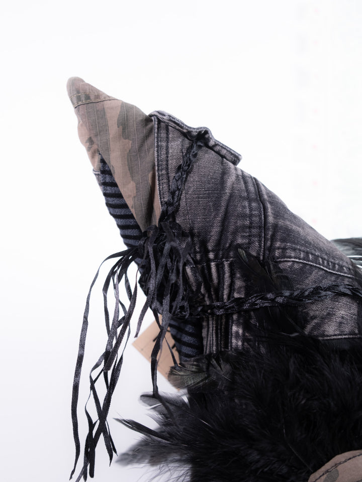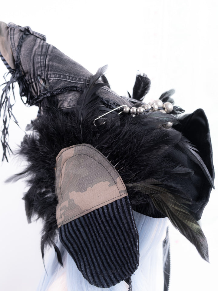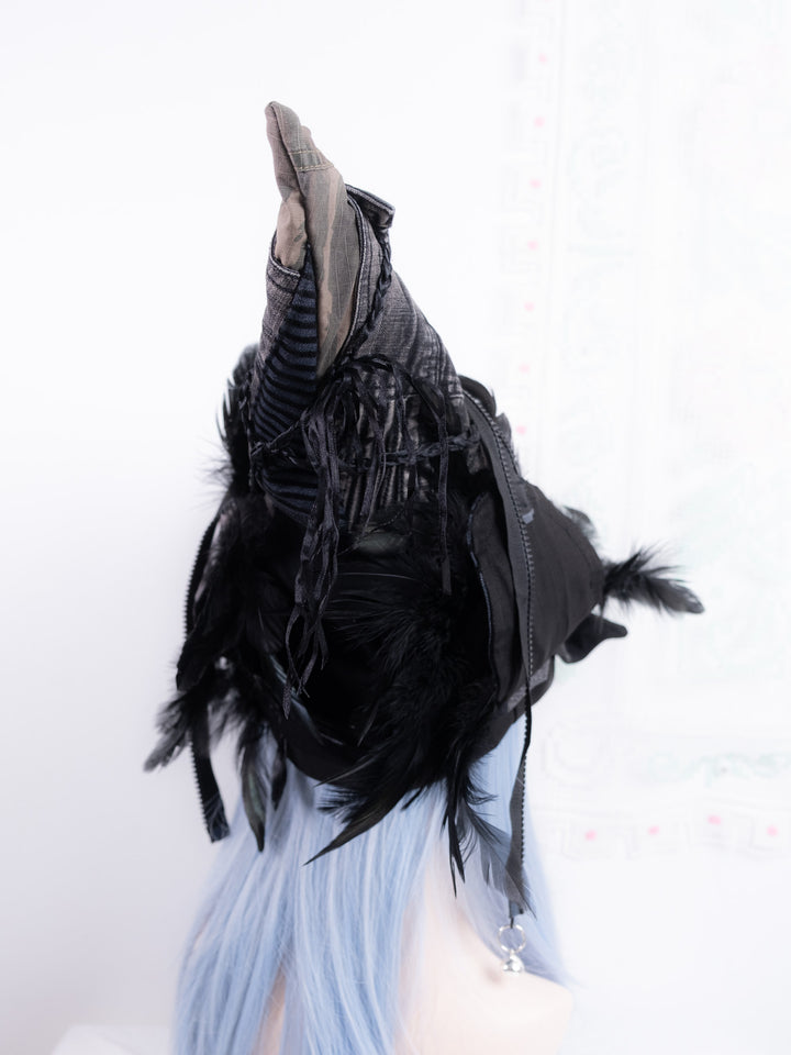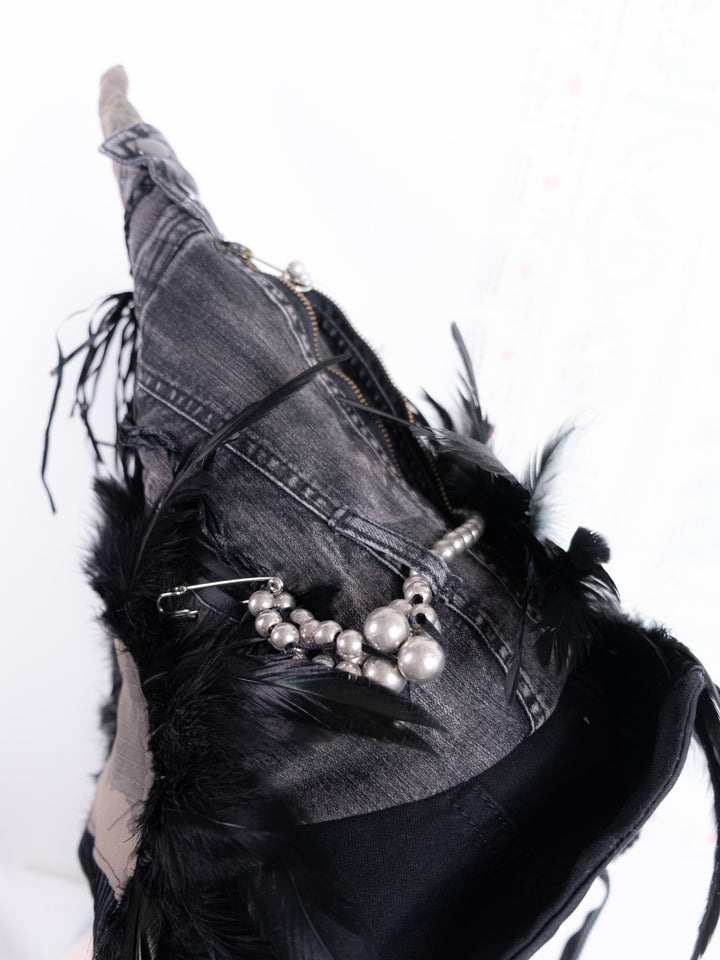 Handcrafted hat made with layered black fabric, decorated with feathers, tassels, and safety-pin bead ornaments.