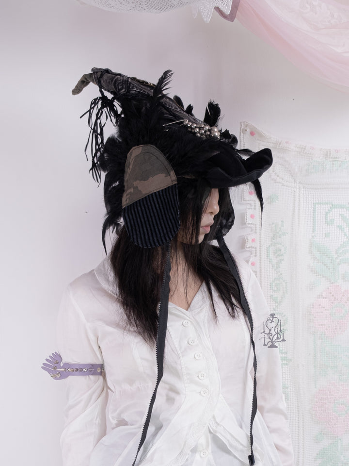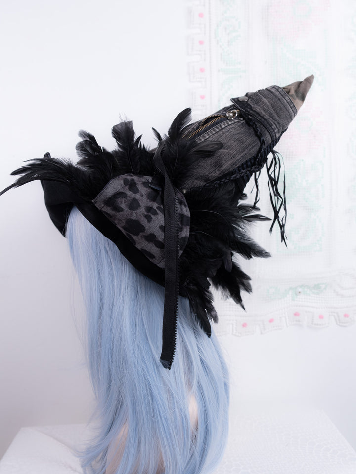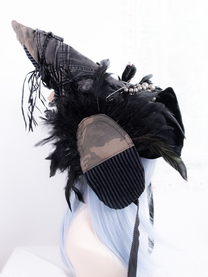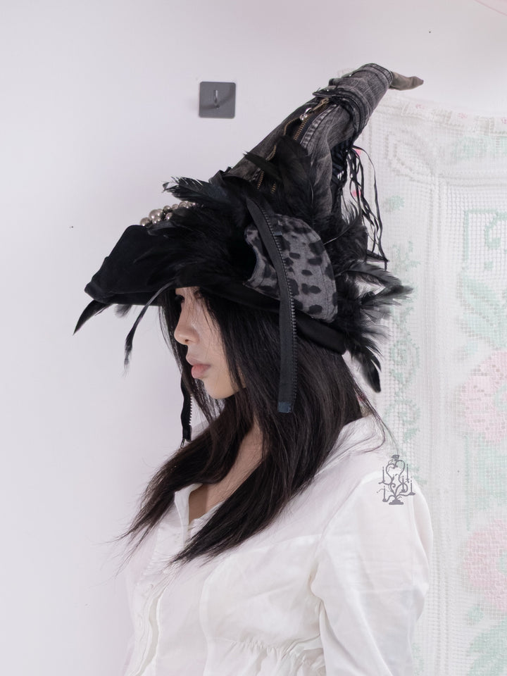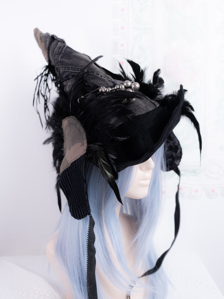 Handcrafted hat made with layered black fabric, decorated with feathers, tassels, and safety-pin bead ornaments.