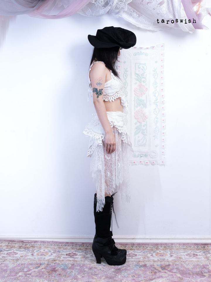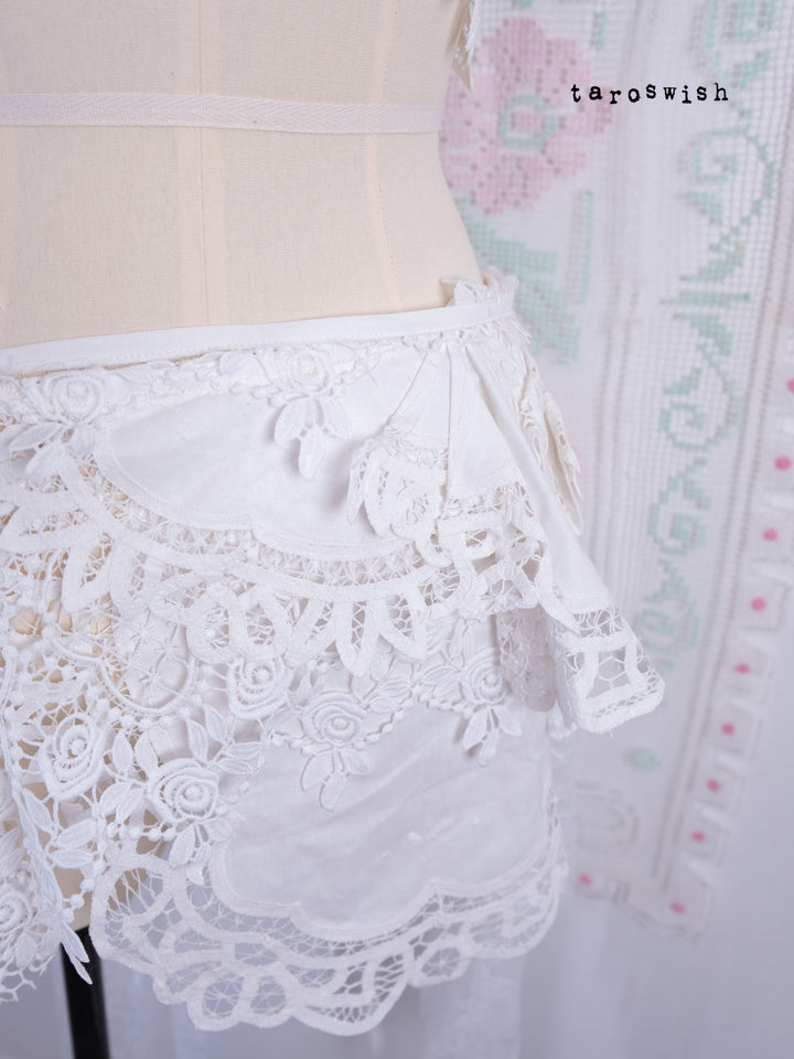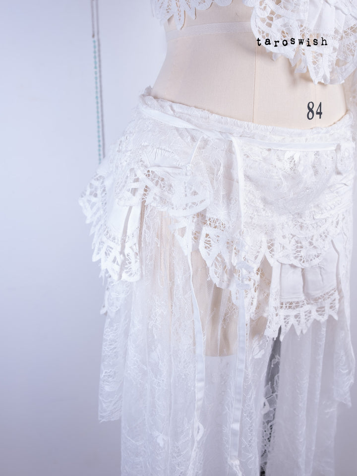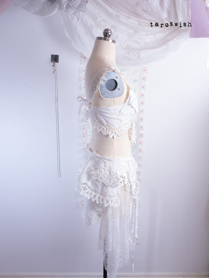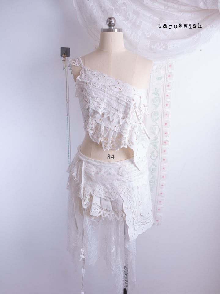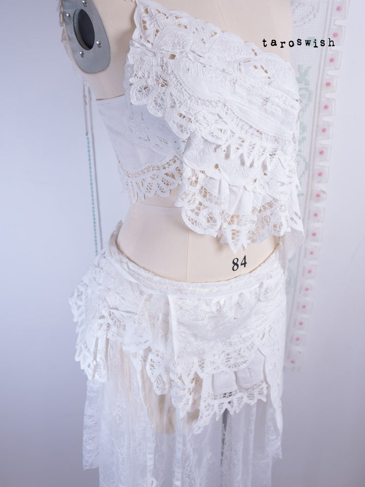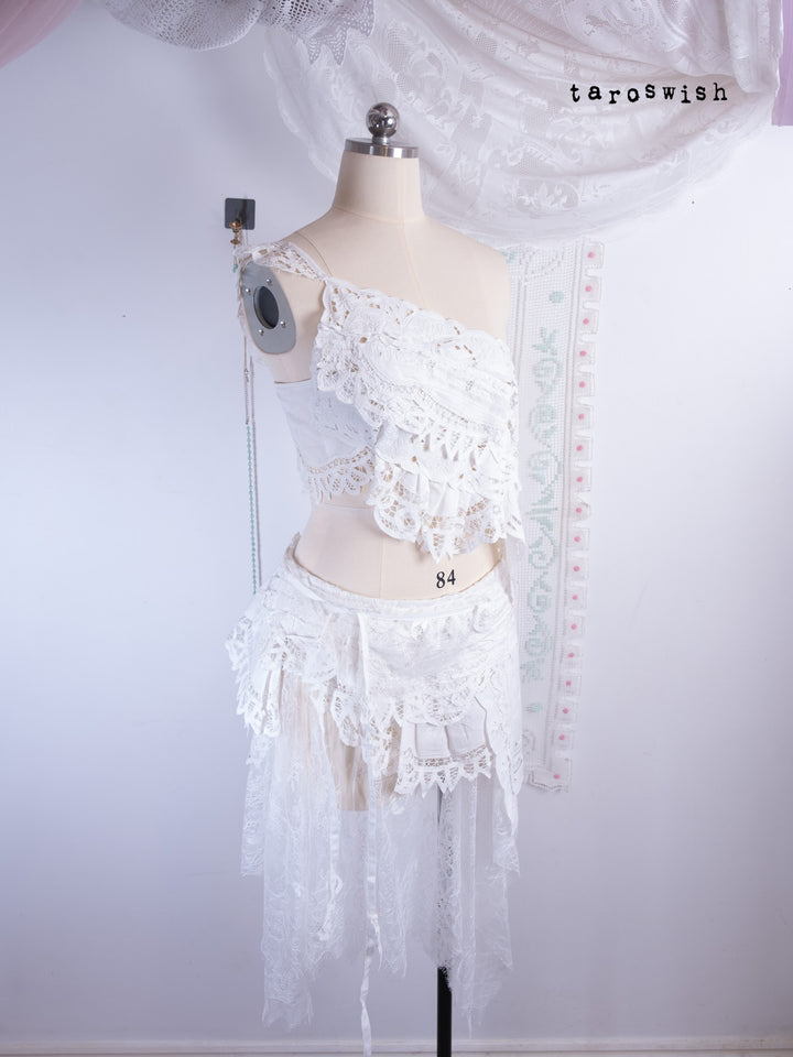 Cotton-and-lace two-piece set with a draped, shaped top and a wrap skirt that can be worn front or back.